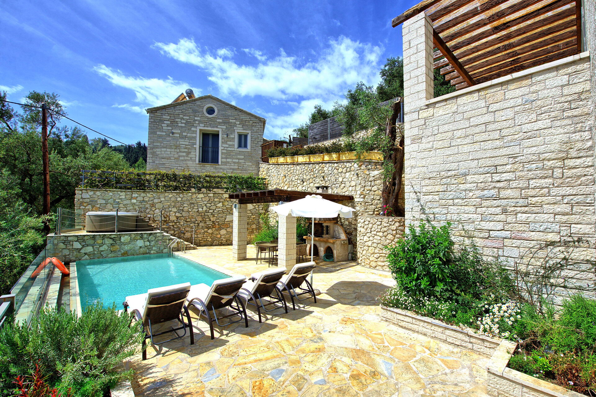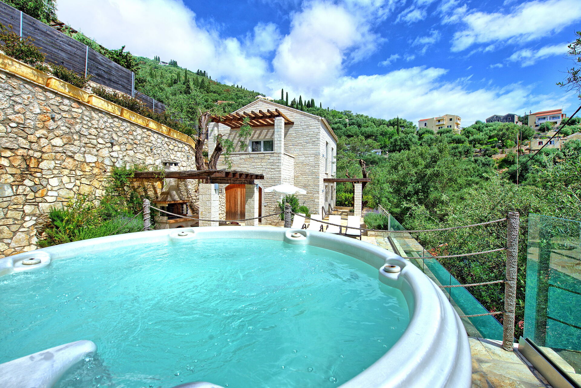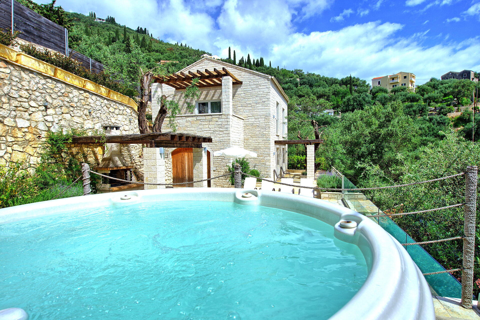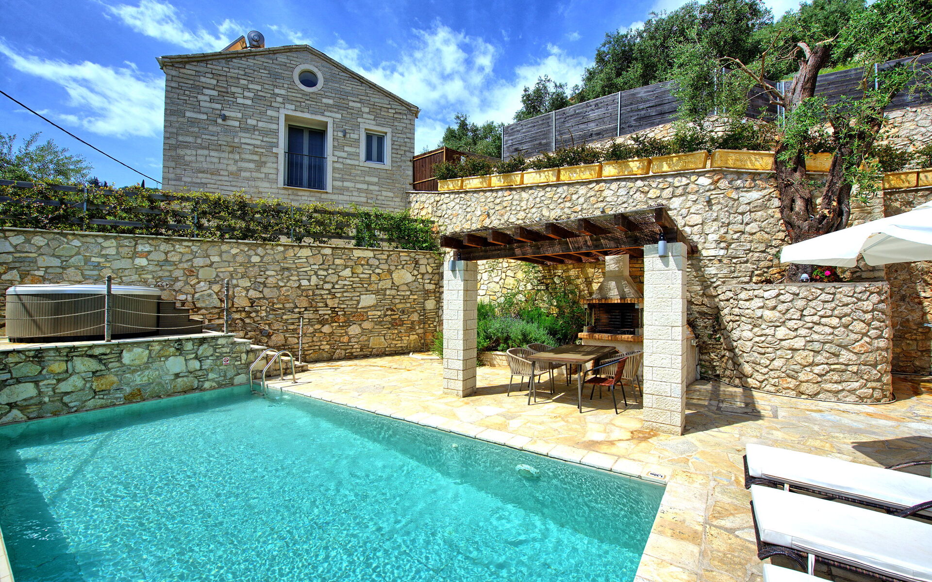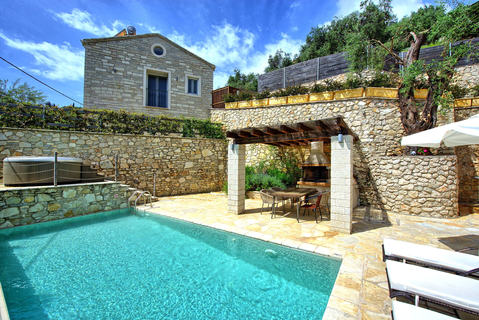 La villa peut accueillir jusqu'à 4 personnes dans 2 chambres et à l'extérieur, elle offre une piscine privée chauffée (qui fonctionne automatiquement lorsque la température descend en dessous de 24 degrés), un jacuzzi et un espace barbecue équipé d'un gazebo, d'une table et de chaises pour des repas confortables en plein air.