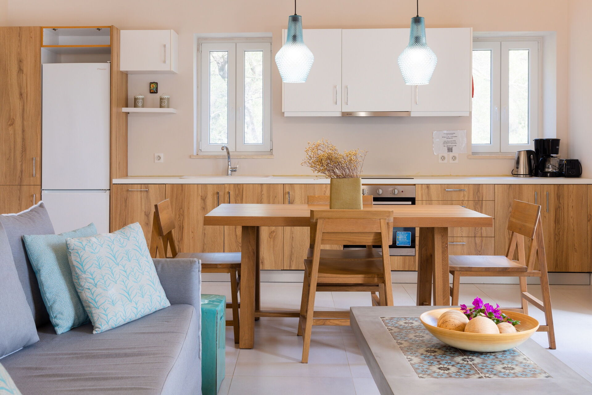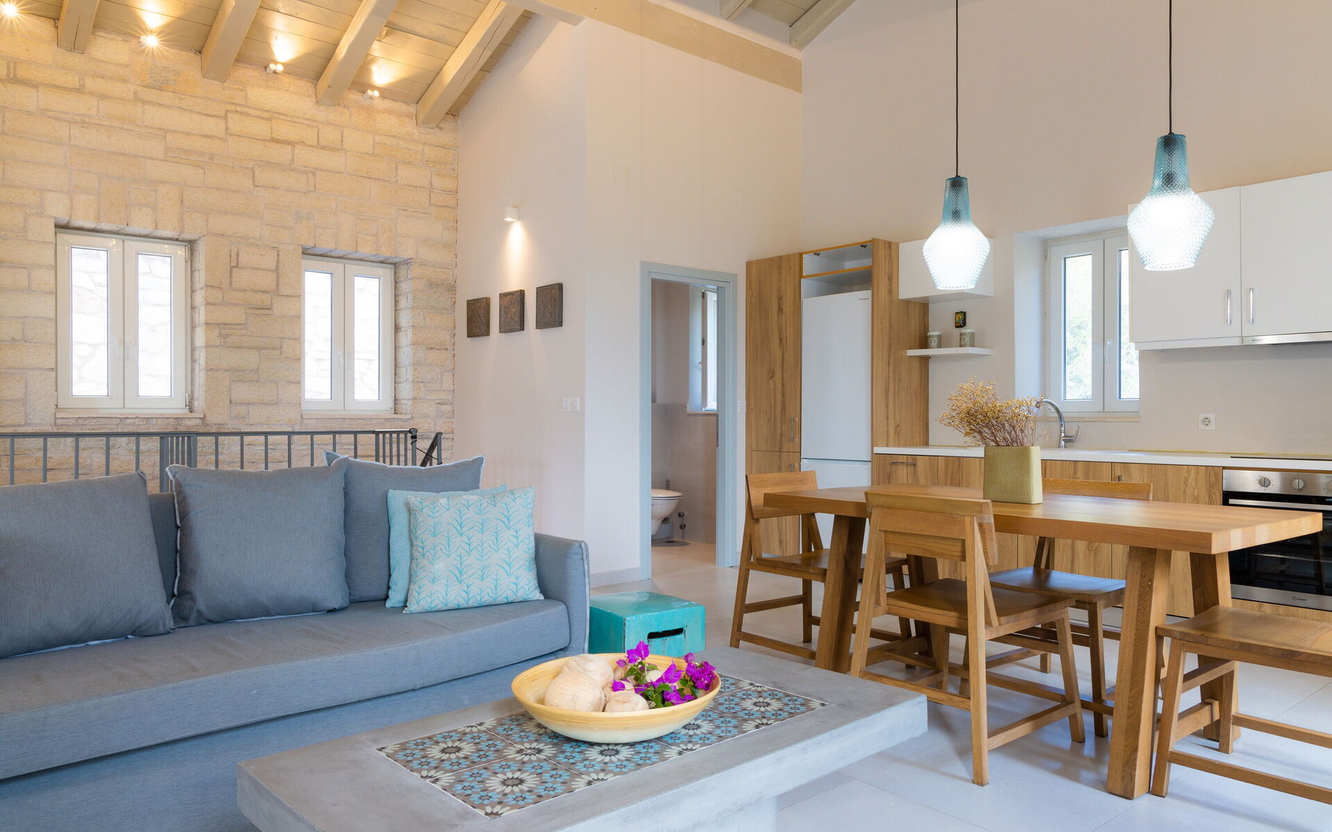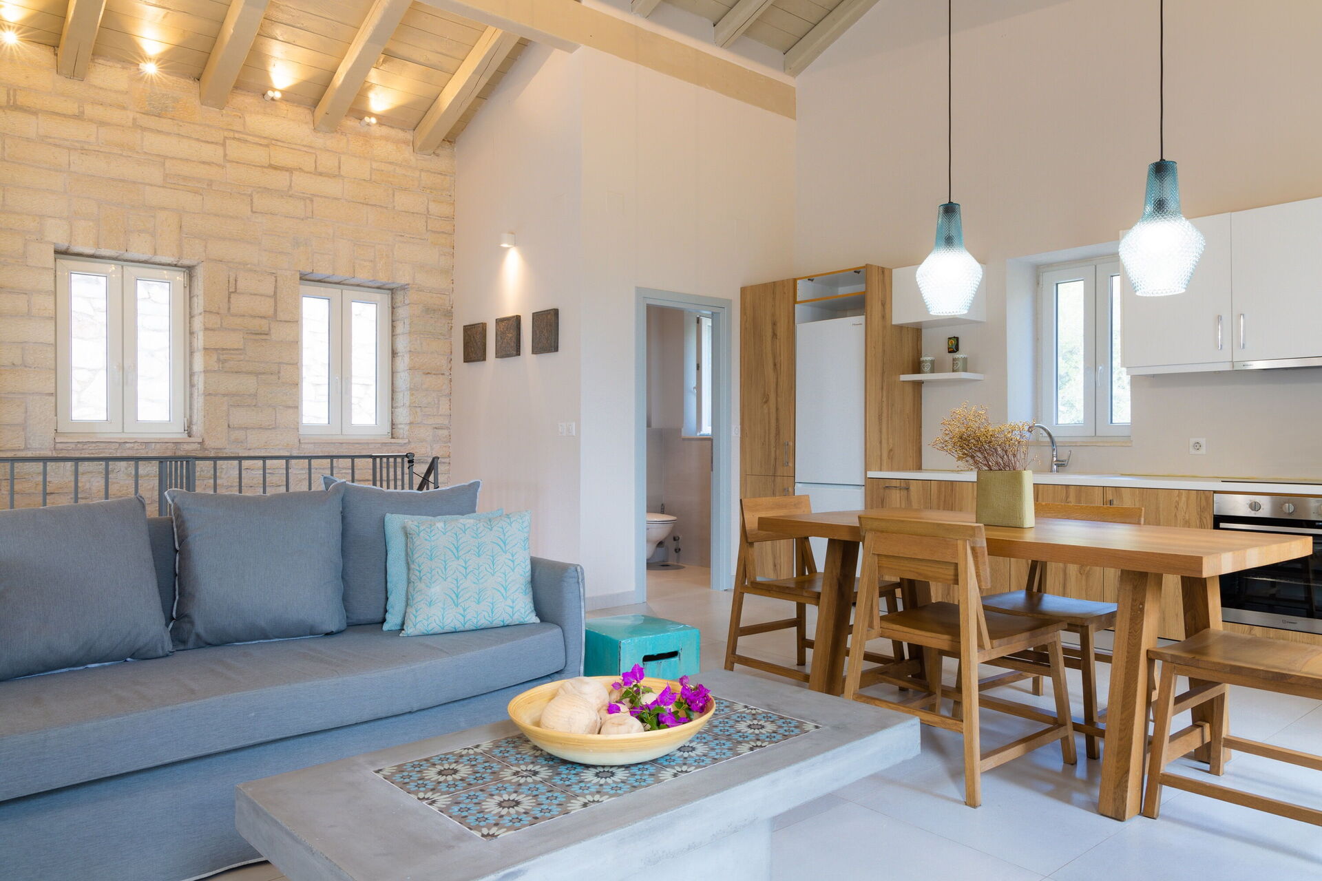 Premier étage: lumineuse partie jour composée de séjour, zone repas et cuisine (four, freezer, lave-vaisselle), bains de service (WC) avec lave-linge.