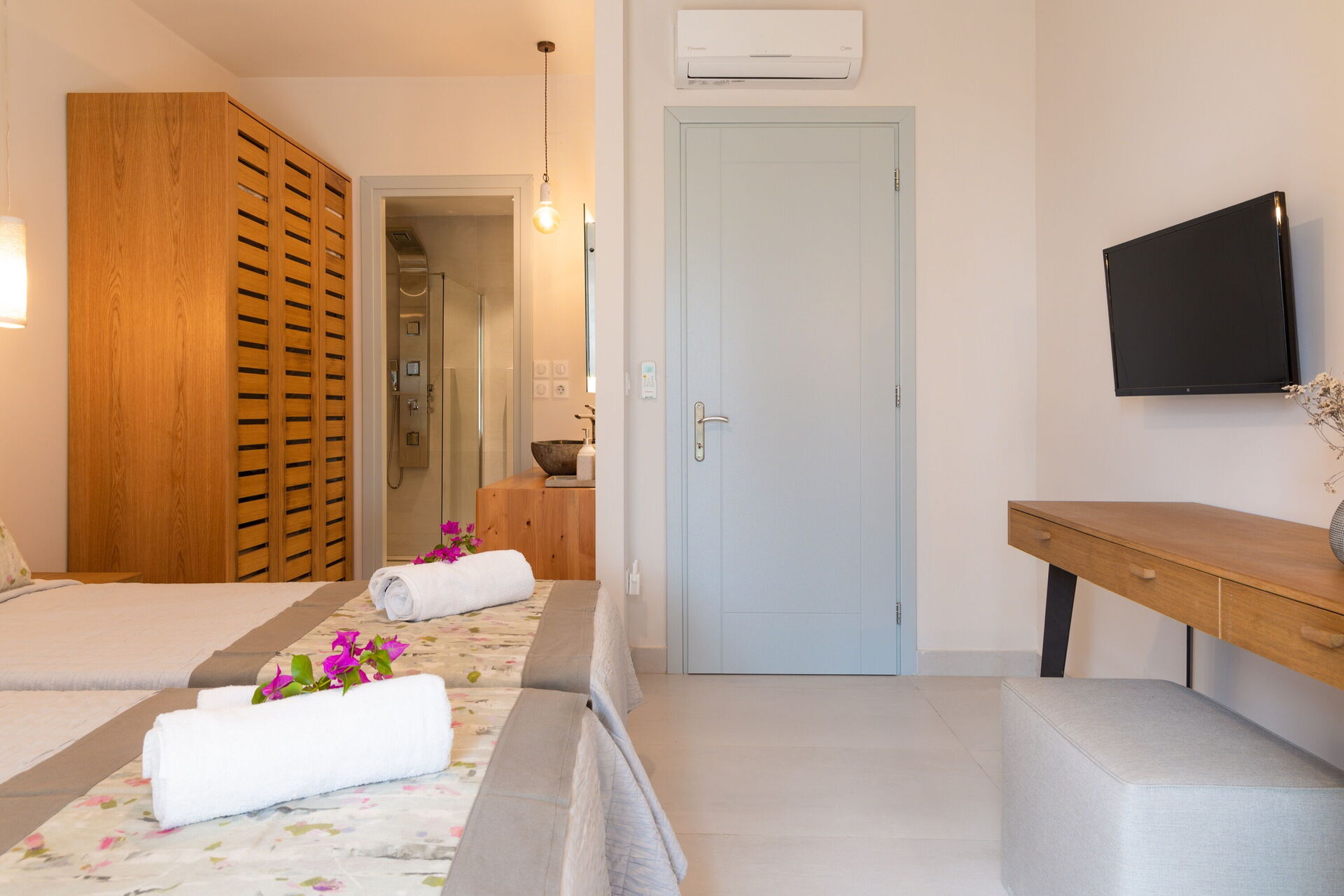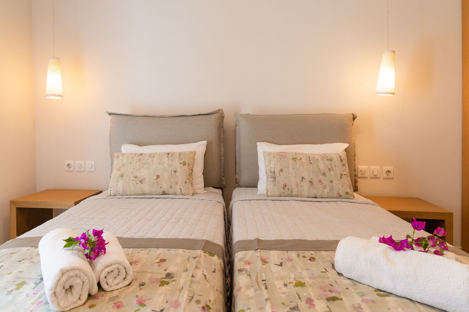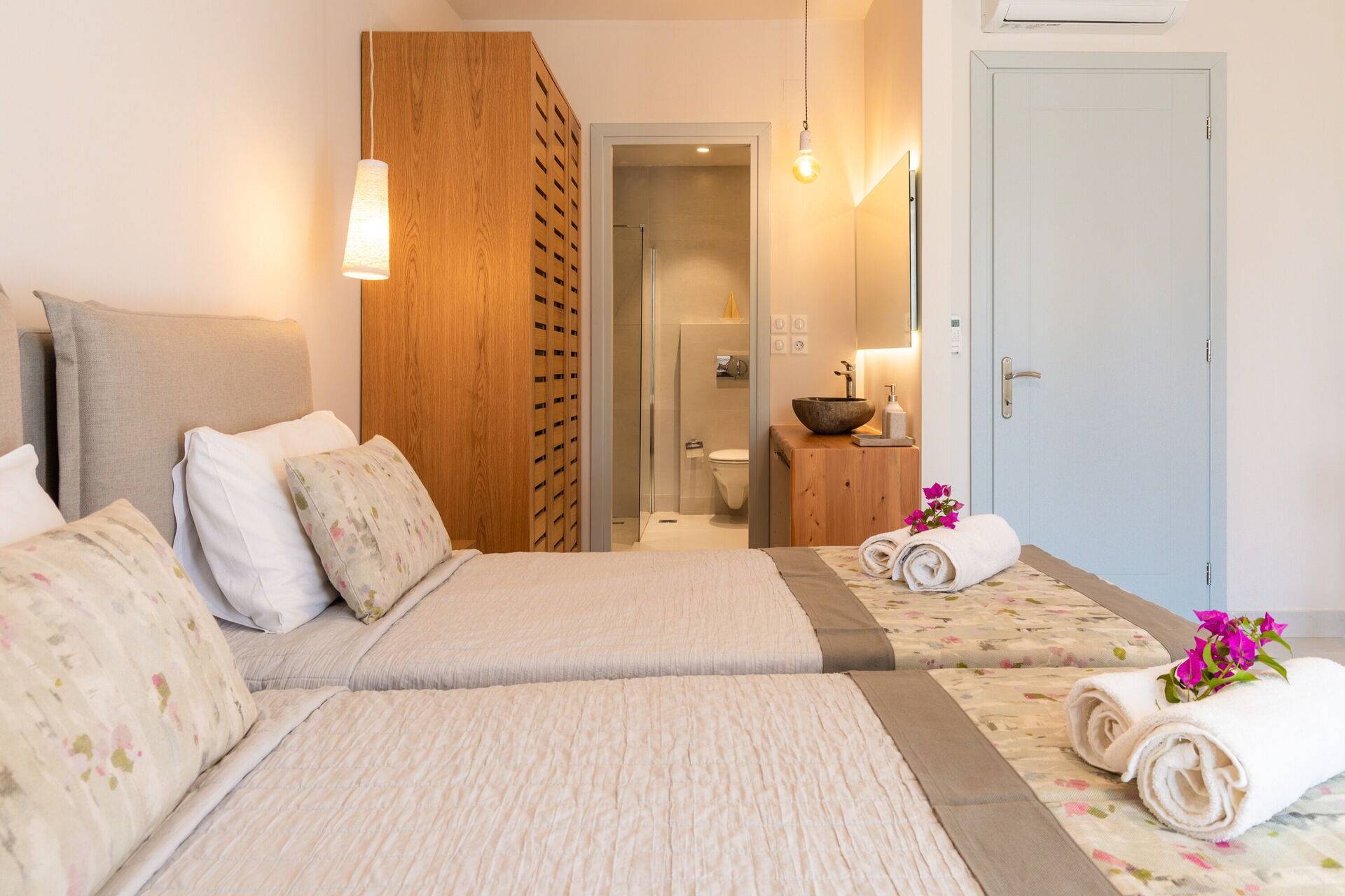 Rez-de-chaussée: une chambre double avec salle de bains privée avec douche, une chambre avec 2 lits à une place et salle de bain privée avec douche.