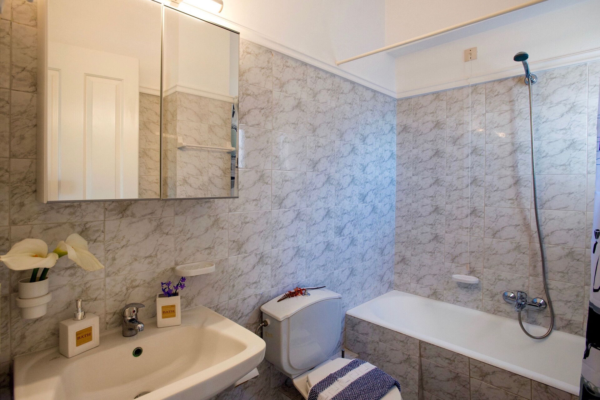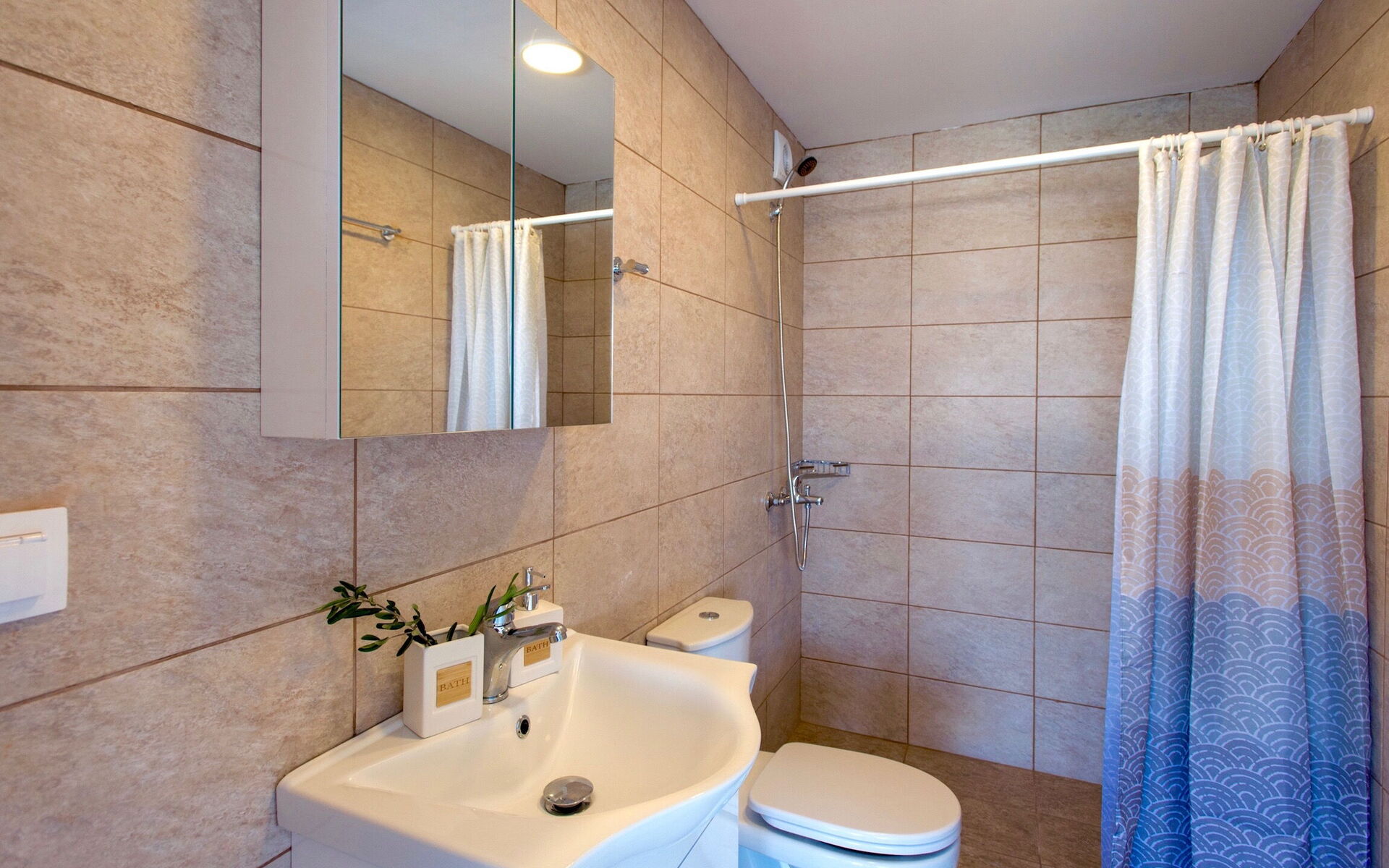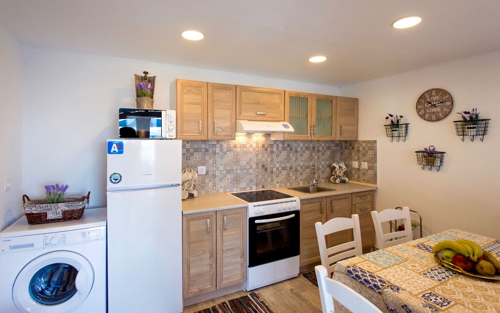 1 appartement avec 1 chambre double (air conditionné), 1 chambre à deux lits (air conditionné), salon avec 1 canapé-lit, coin cuisine , salle de bain, terrasse meublée.