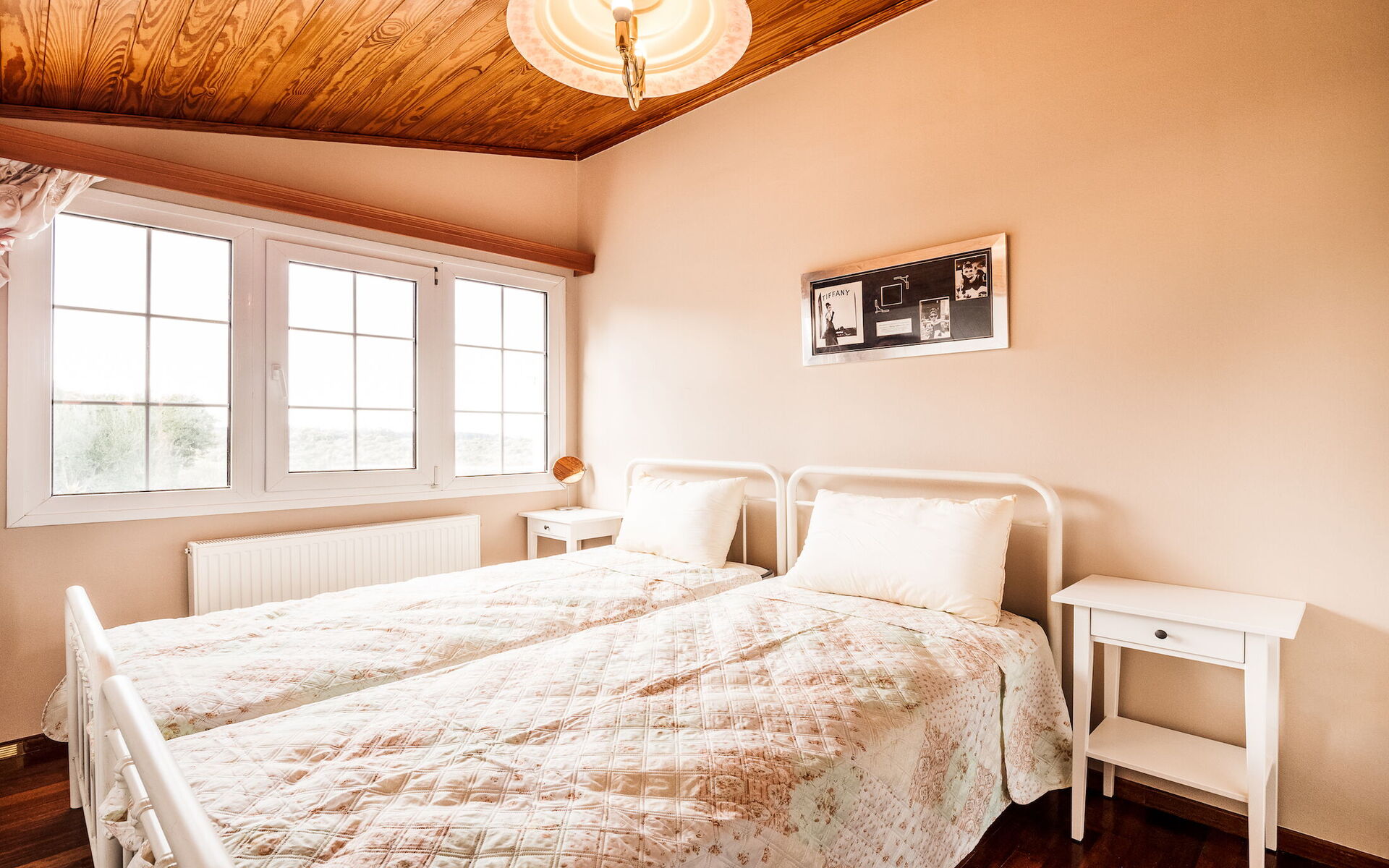 Premier et deuxième étage: maison principale avec grand salon pour tous les invités, cuisine équipée, 1 chambre double (air conditionné), 2 chambres à deux lits (air conditionné), 2 salles de bains, terrasse meublée.