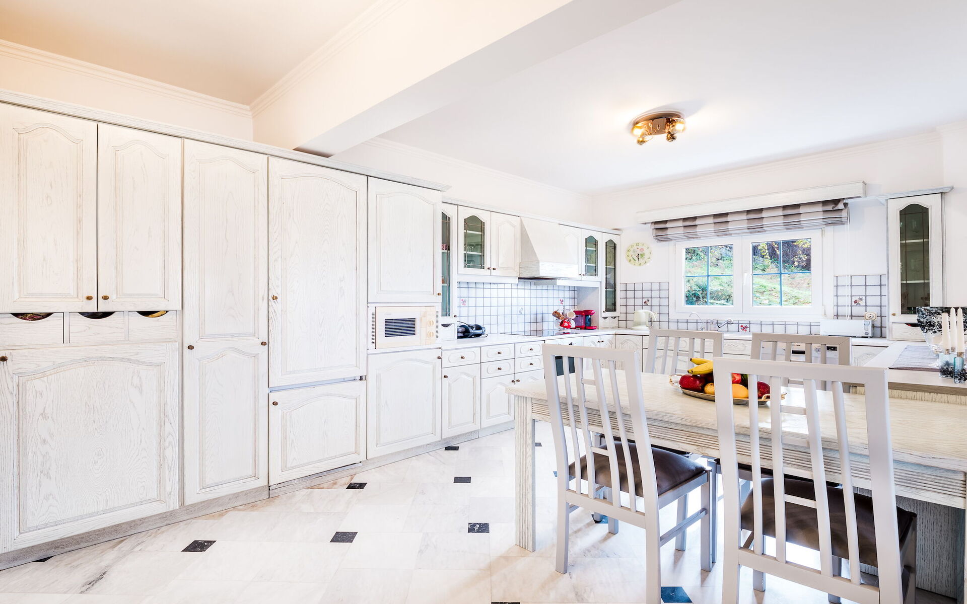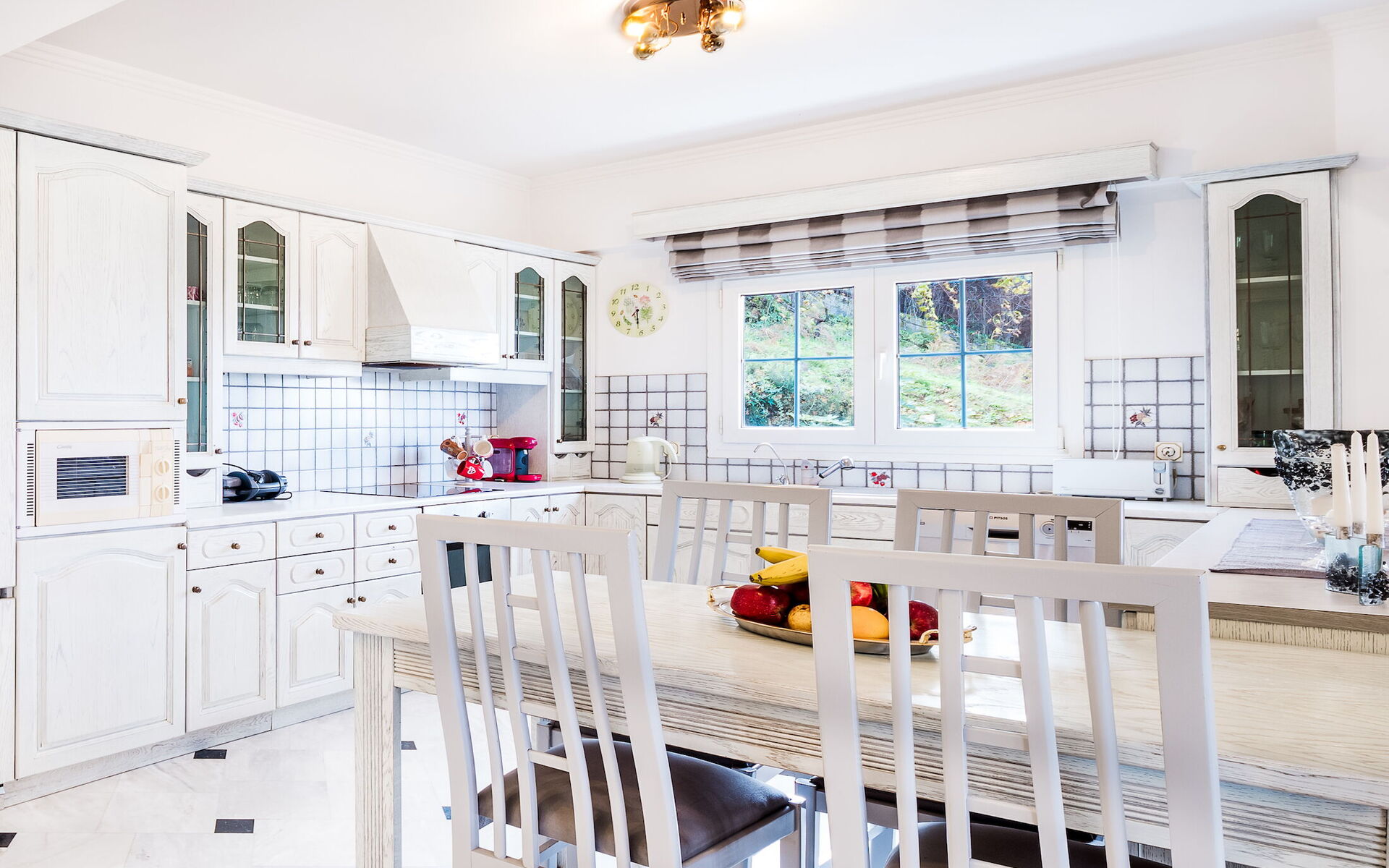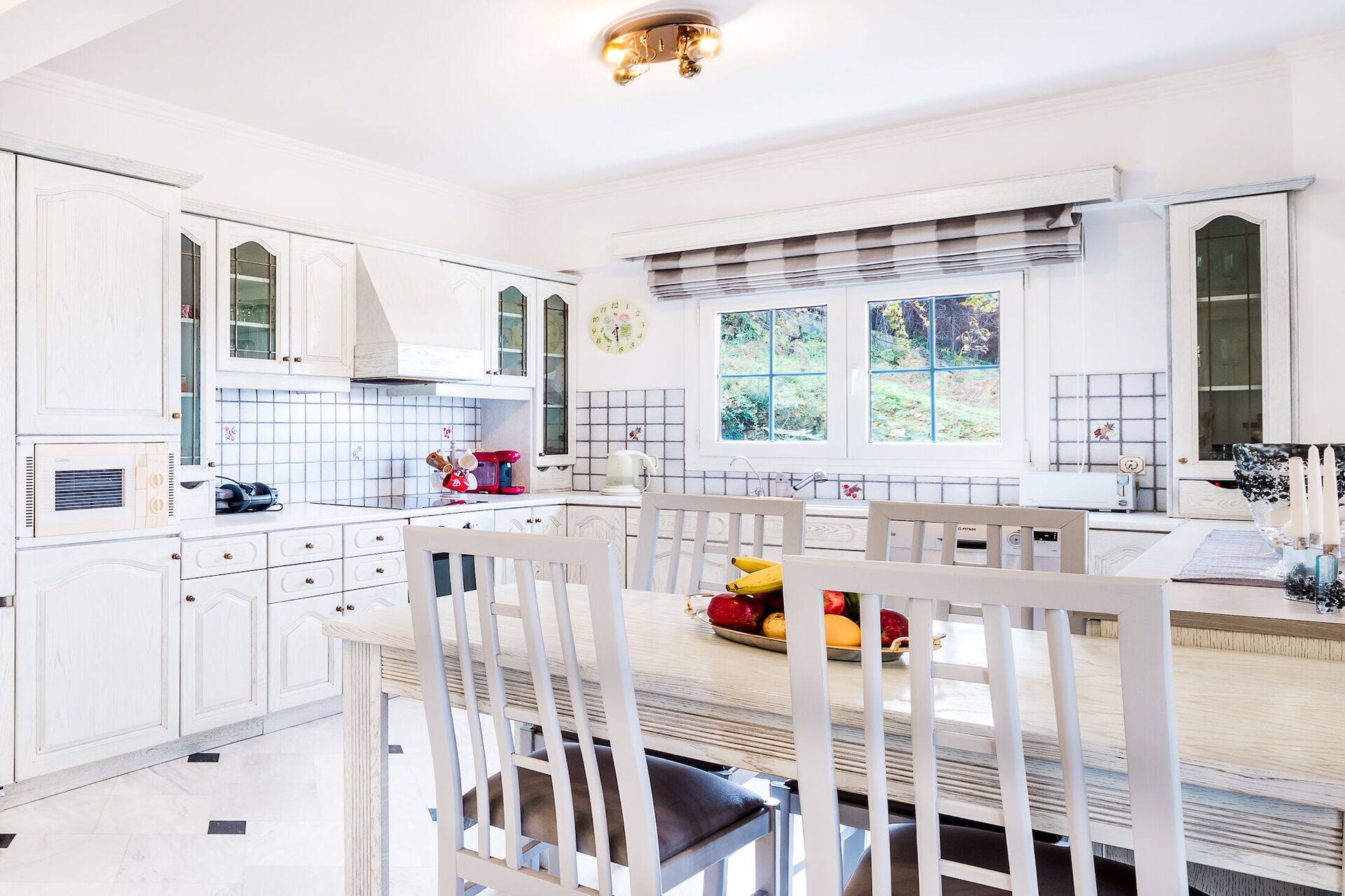Grande cuisine entièrement équipée, coin repas et salle de bains.