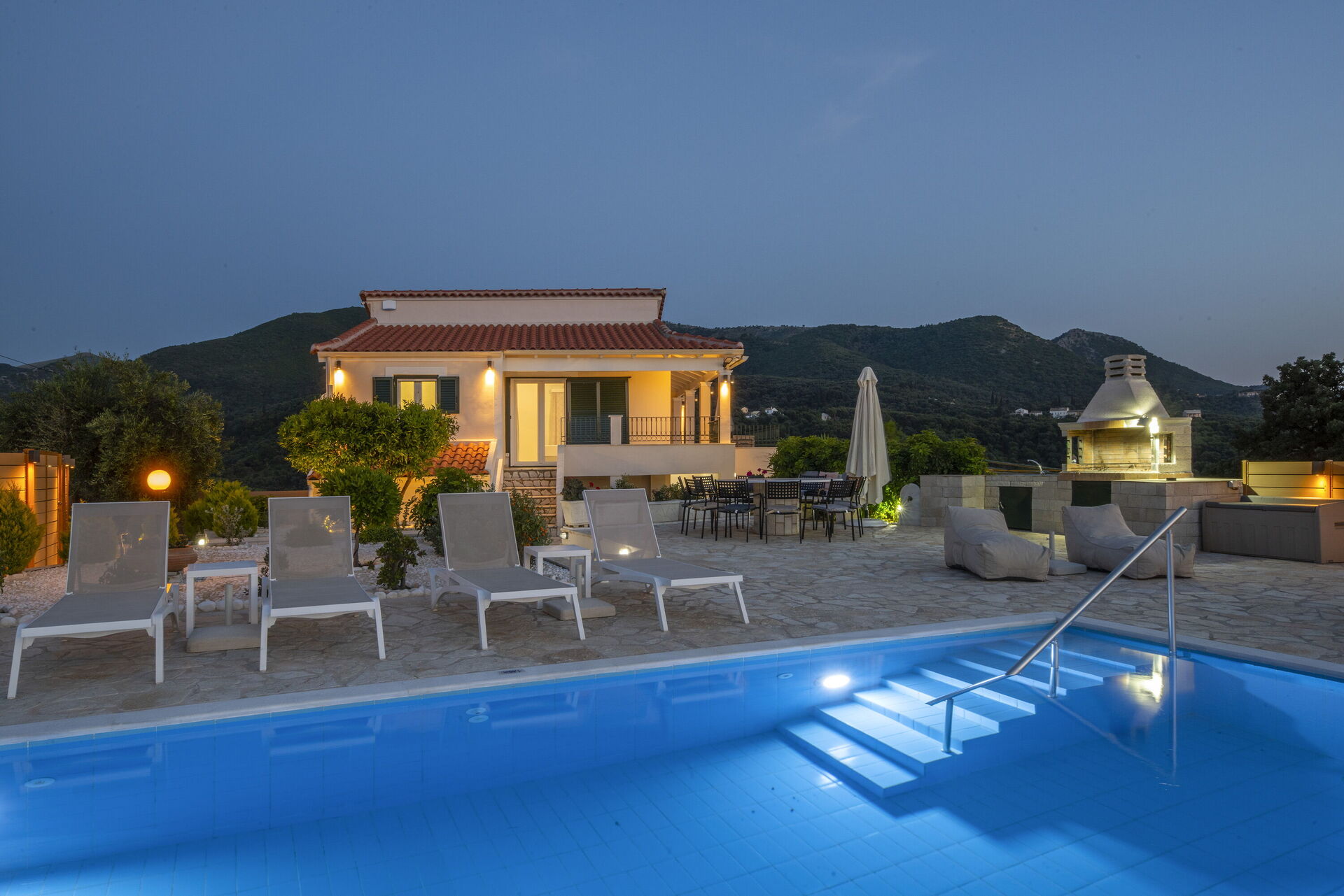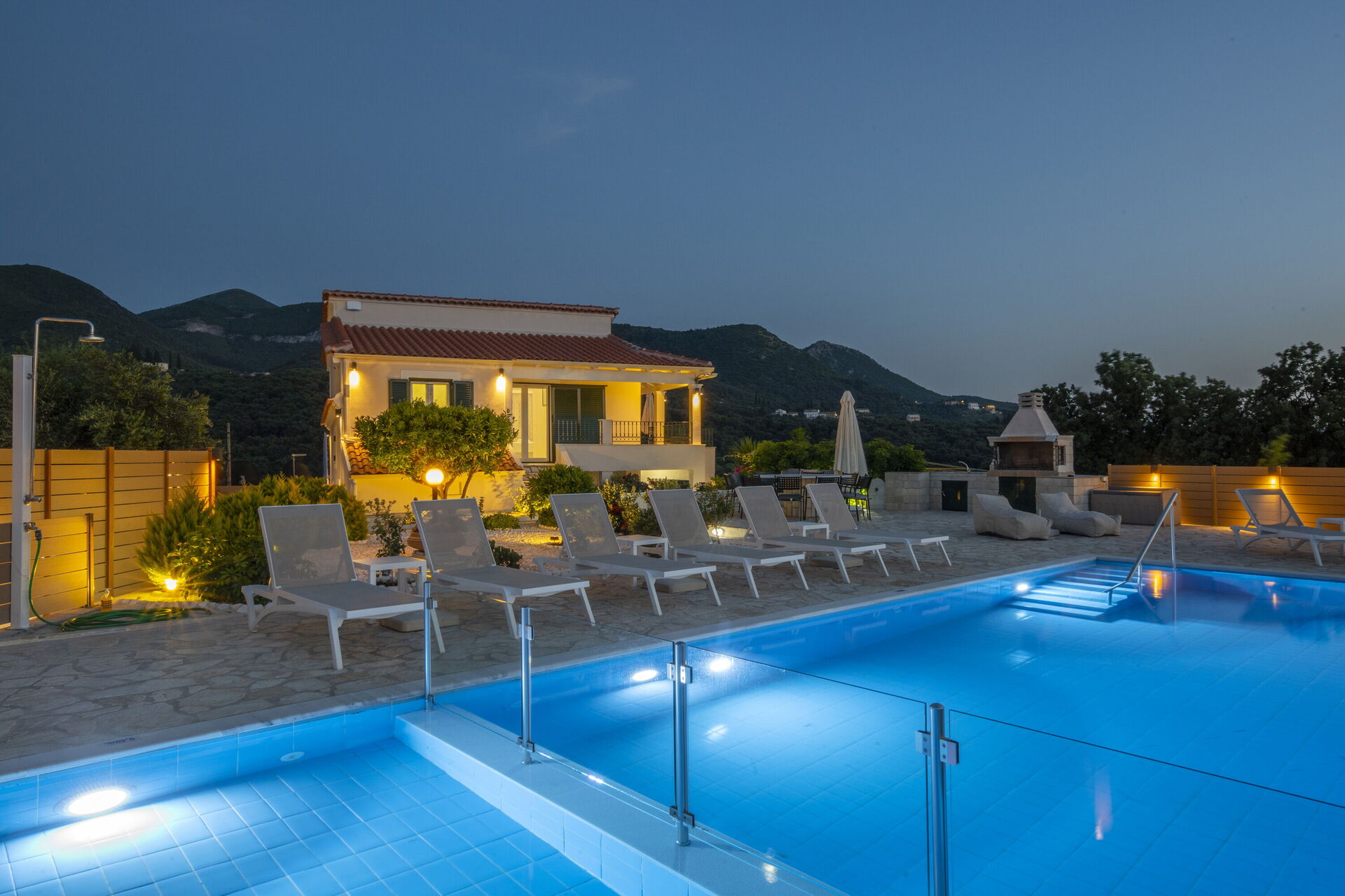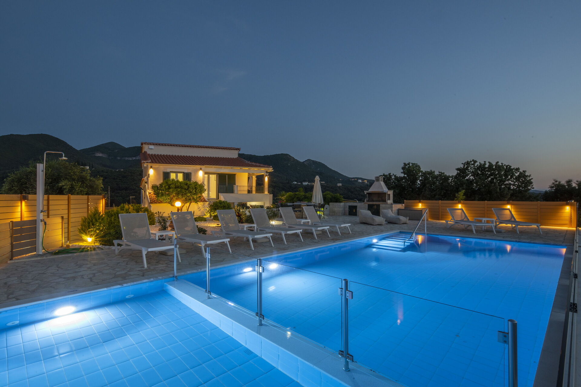 Villa Portes est entourée des montagnes de l'île. Jardin luxuriant, riche en plantes et fleurs et une piscine panoramique qui vous permettra de jouir d'une vue splendide sur la mer. Espace barbecue équipé (table et chaises) pour les repas en plein air.