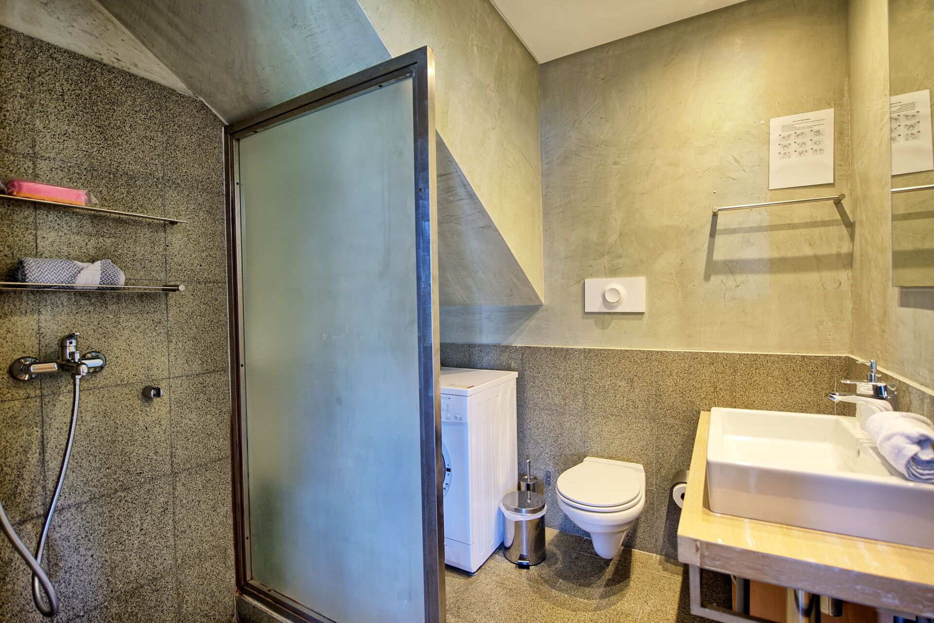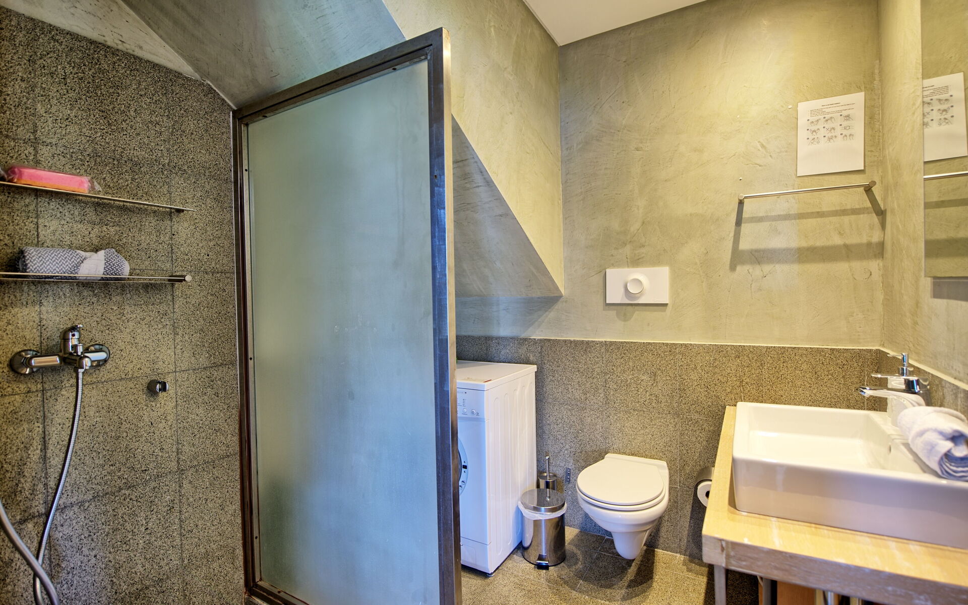 Premier étage: grande cuisine (micro-ondes et lave-vaisselle) avec accès à une très grande véranda couverte avec coin repas, salon open space avec coin repas, WC, chambre double avec lit king size et salle de bain privée avec baignoire. Vous pouvez accéder à la véranda couverte aussi bien depuis la chambre que depuis le salon.