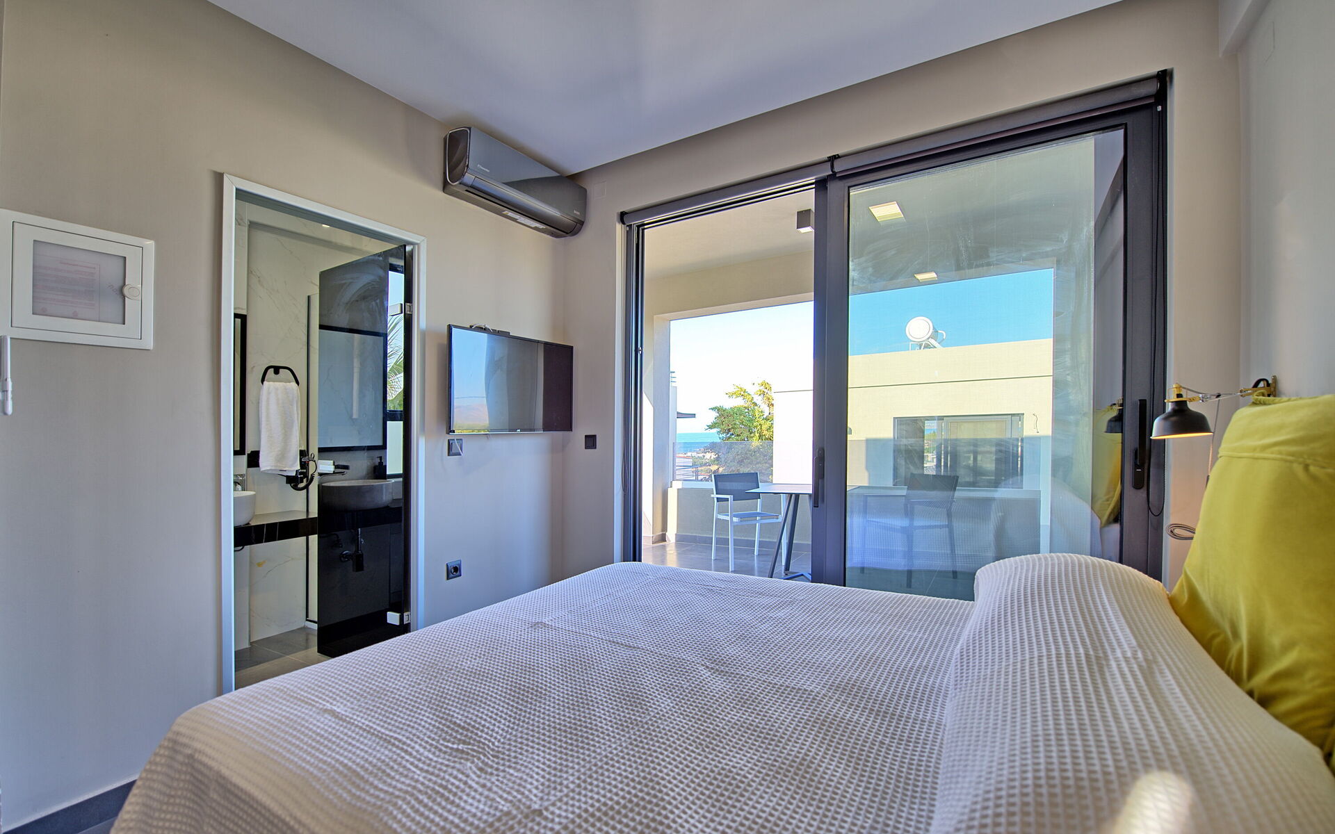 Premier étage: chambre double avec salle de bain privée avec douche et accès à 2 terrasses privées.