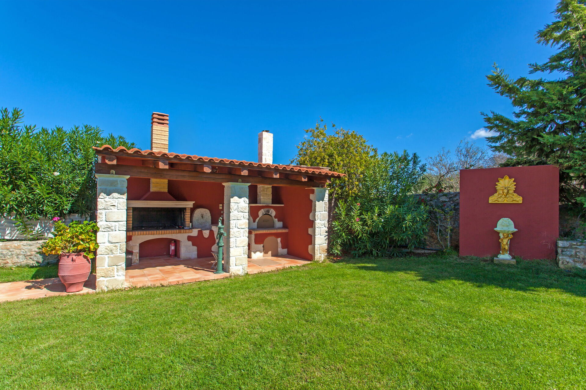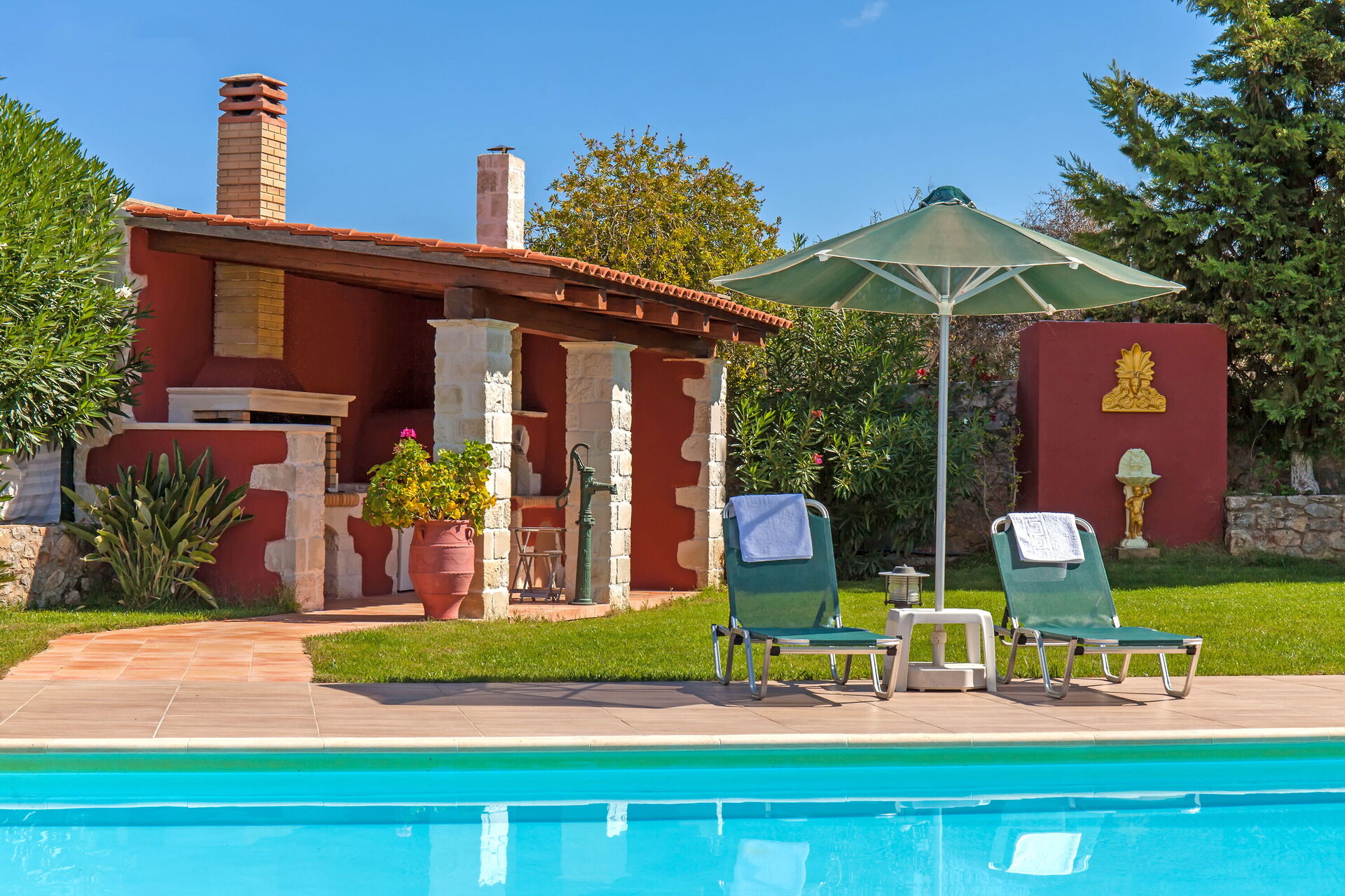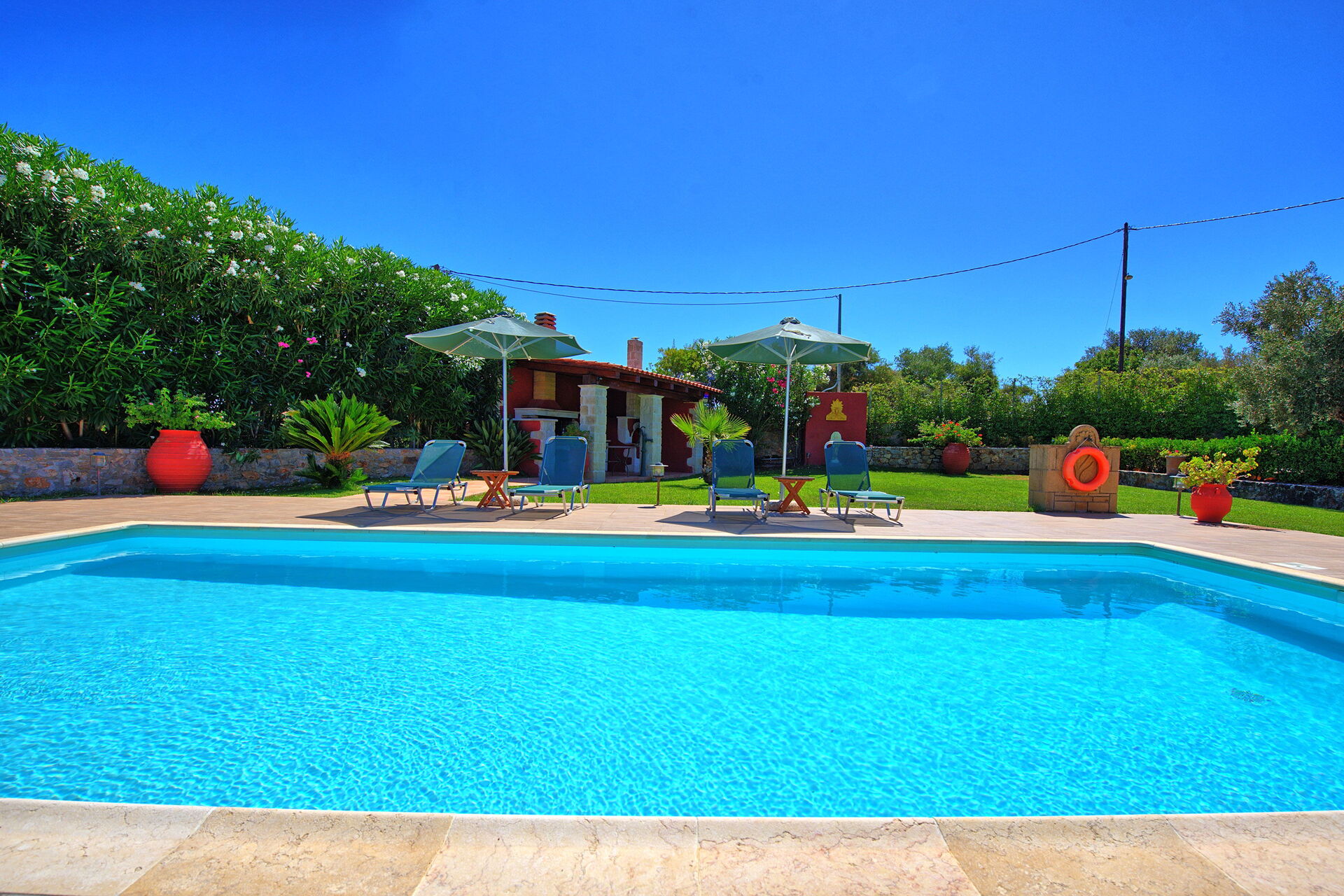 A disposition des hôtes: grand jardin privé d'environ 1500 m2 et 2500 m2 d'oliveraie, piscine réservée à l'usage exclusif des hôtes avec système d'épuration au sel (9 x 4,5 mètres; profondeur minimum : 1,20 mètres ; profondeur maximum : 1,60 mètres), pergola couverte équipée d'un grand barbecue à bois, d'un four à bois, d'un réfrigérateur et d'un évier, 3 chambres et 3 salles de bains, table de ping-pong, connexion Internet wi-fi (gratuite), parking privé, climatisation dans toutes les chambres et dans le séjour, gym.