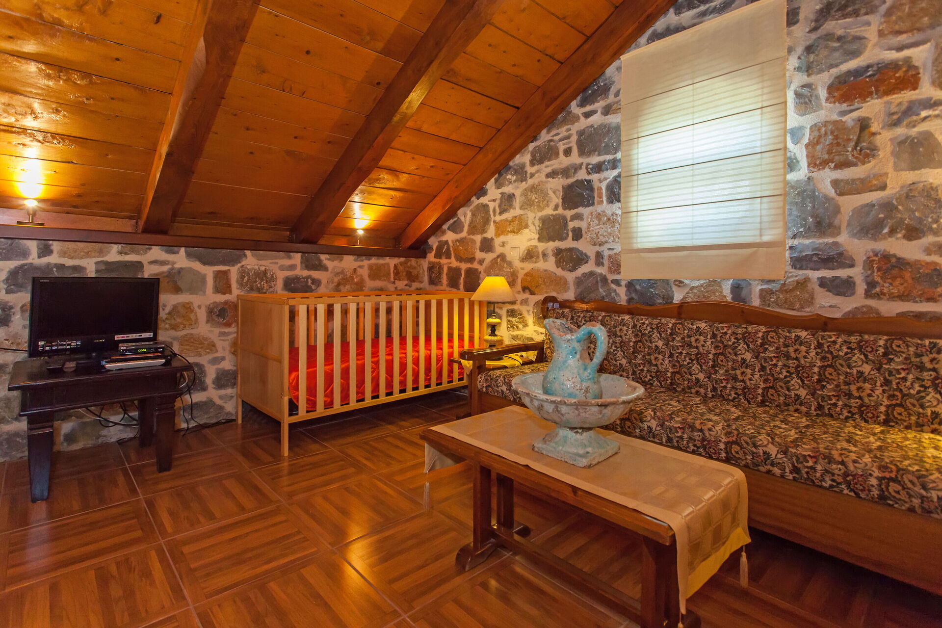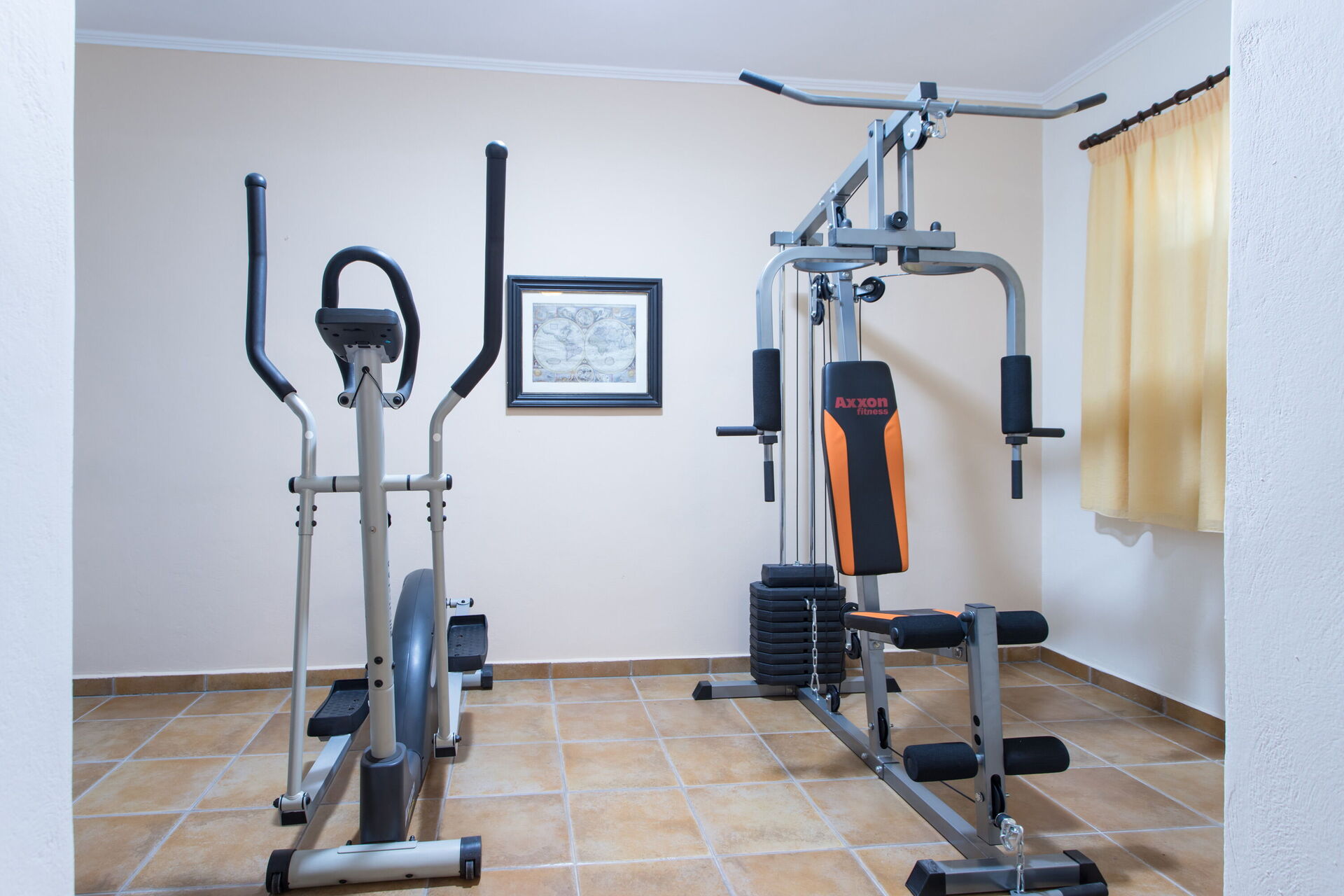 Etage inférieur (accessible également de l'extérieur): une chambre double, salle de bains avec petite baignoire, salle de gymnastique, coin buanderie avec lave-linge.