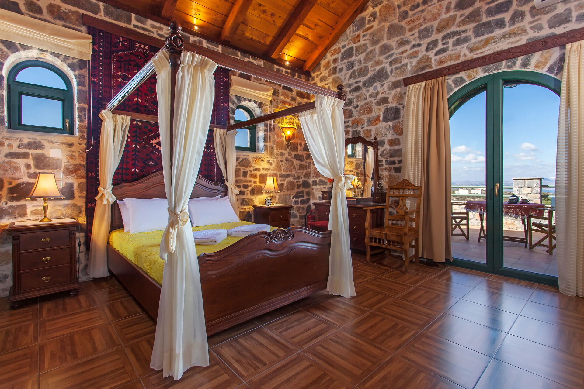 Premier étage: une grande chambre double avec salle de bains privée avec douche, accès à une terrasse privée panoramique et à une soupente avec petit salon, une chambre avec 2 lits à une place et salle de bains privée avec douche.