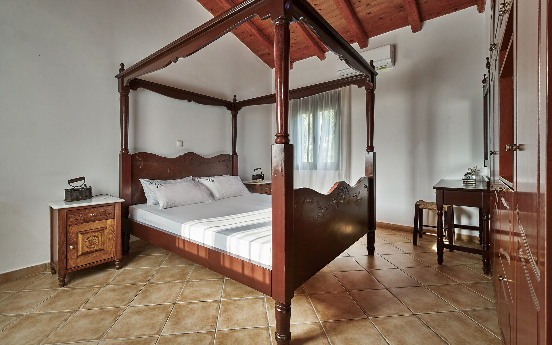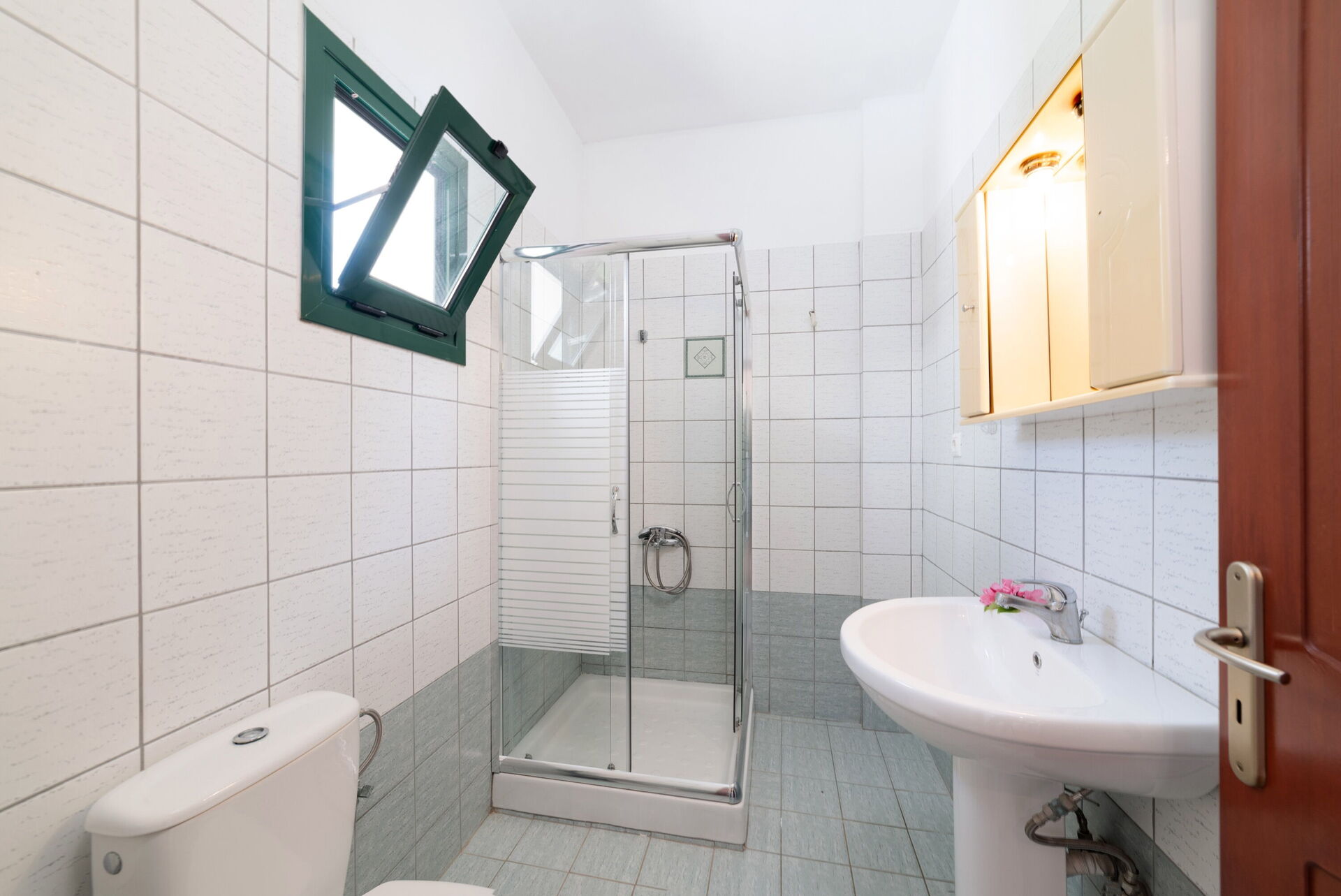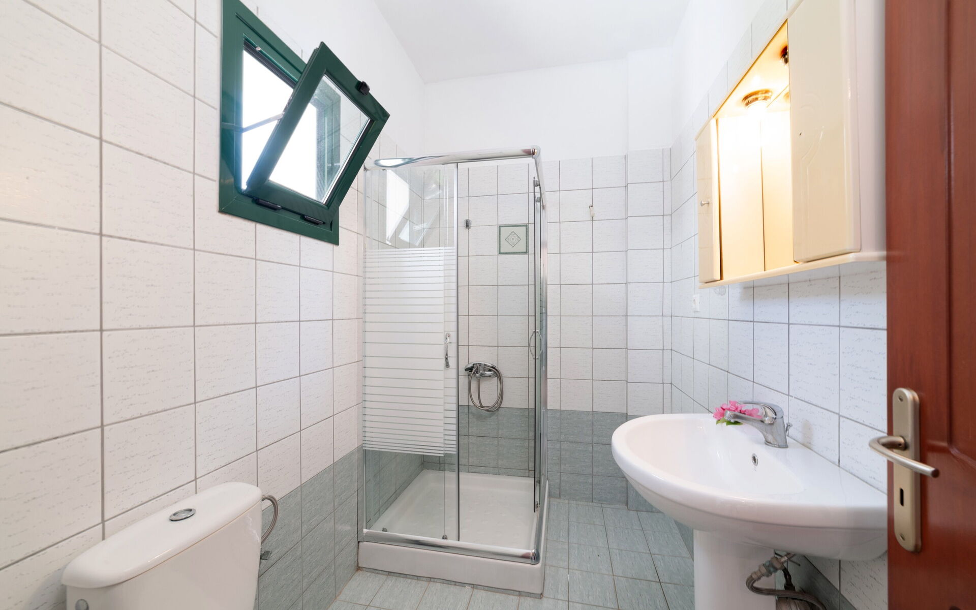 Premier étage: une chambre double (air conditionné), une chambre (air conditionné) avec lit à une place et demie, salle de bains avec douche.