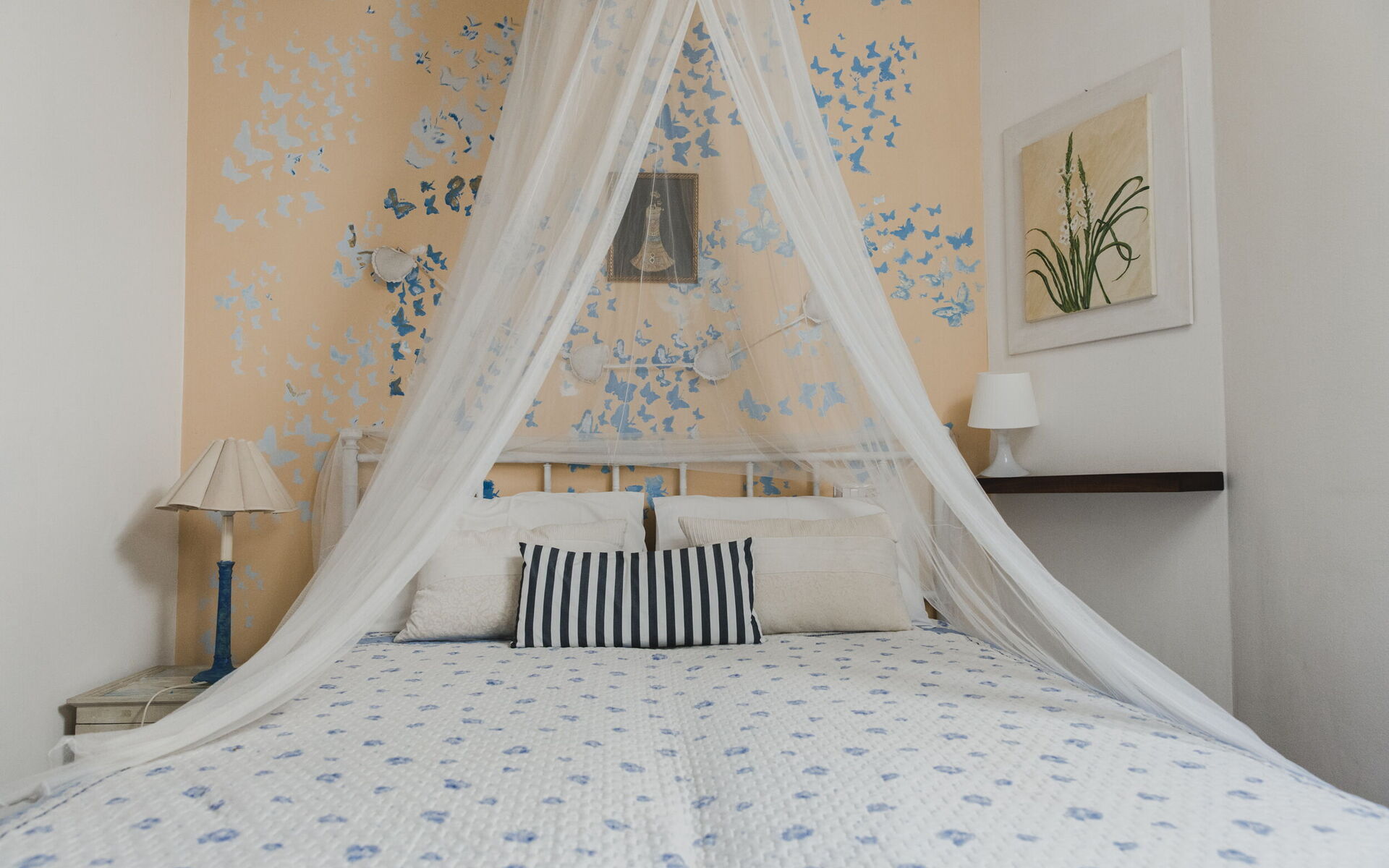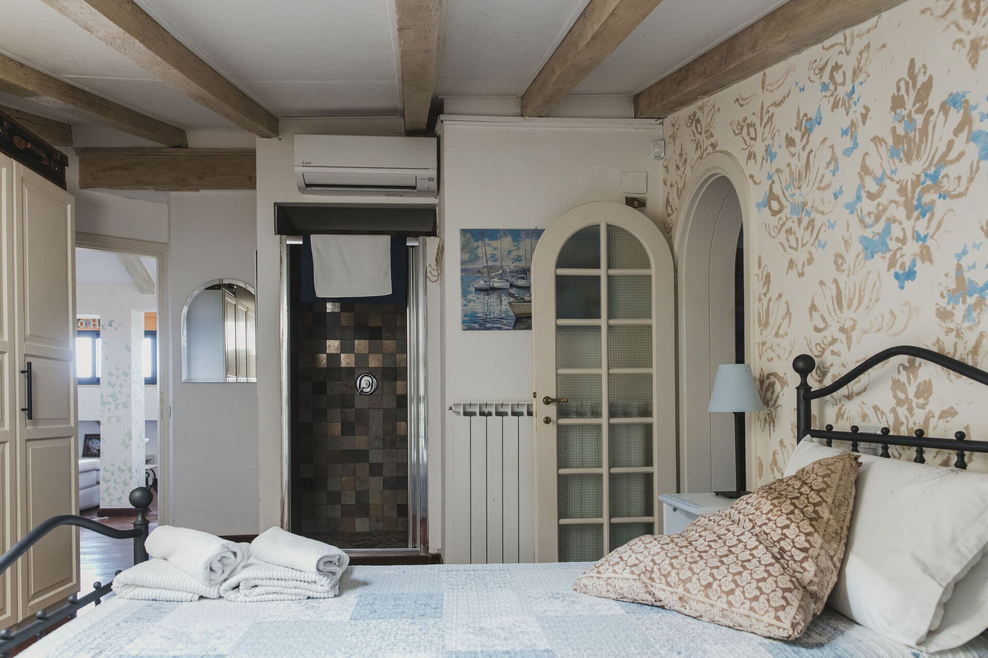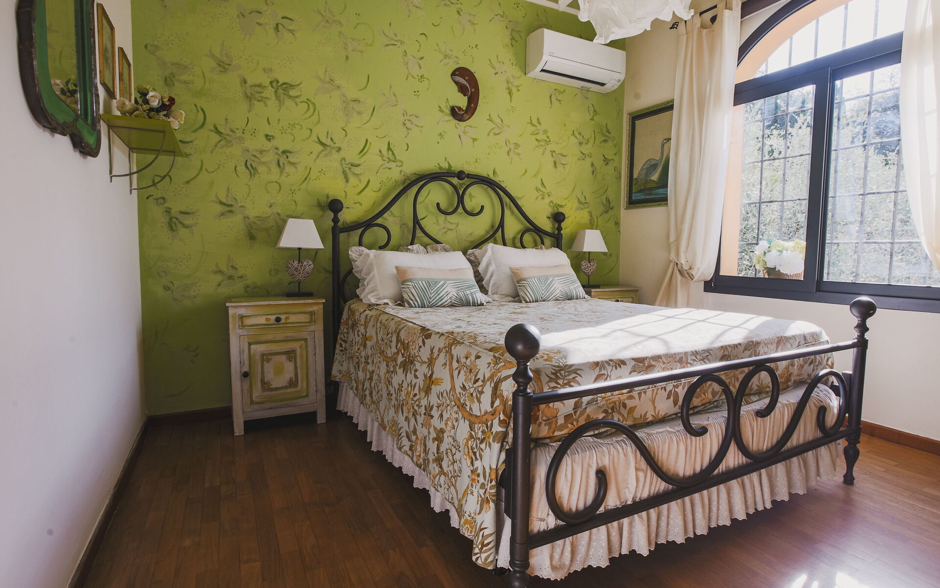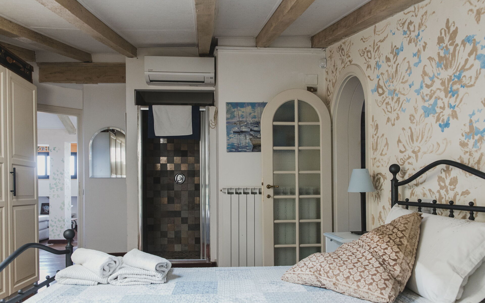 chambre avec salle de bain 1: lit double, climatisation, bassin, wc, bidet, douche, sèche-cheveux.