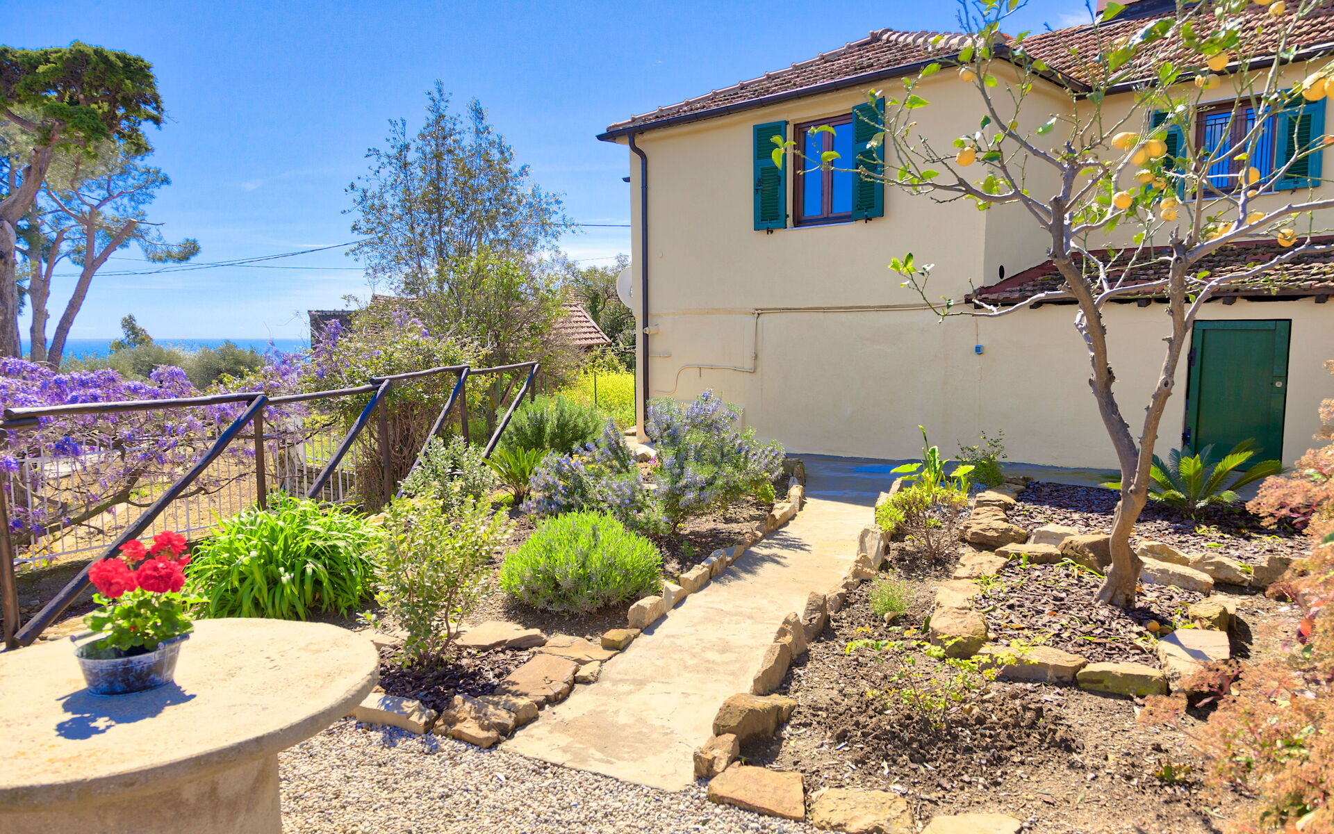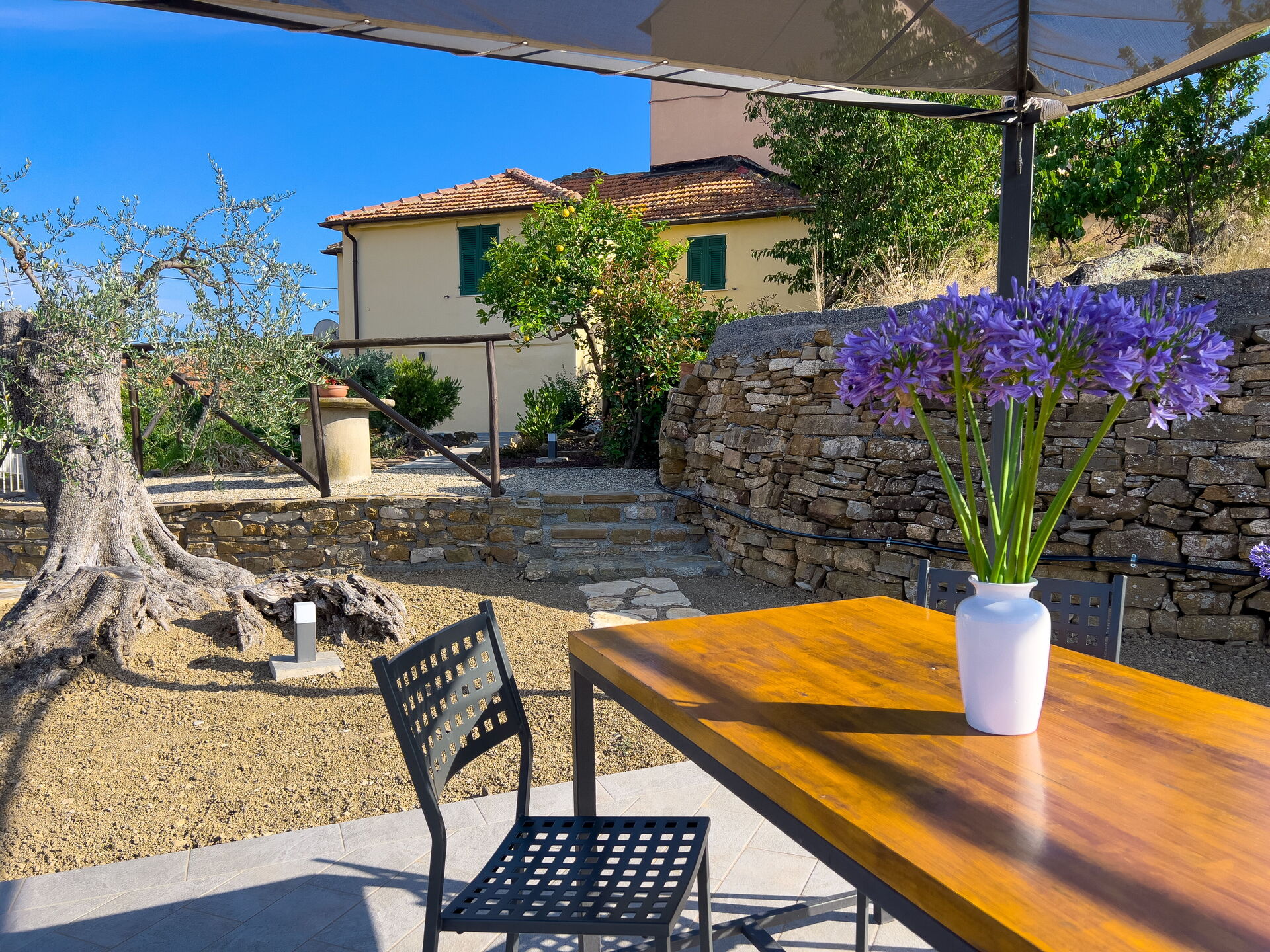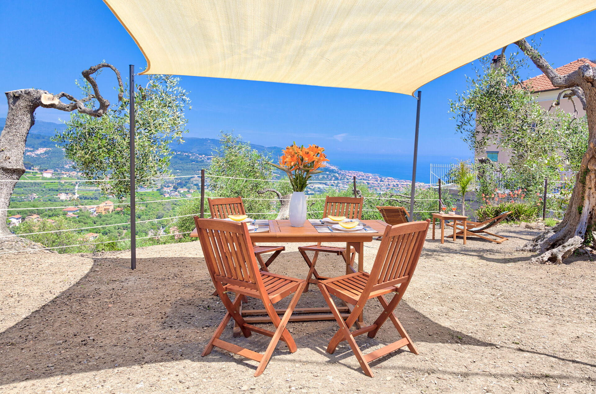 "Casa Mara" à Diano Serreta, en Ligurie, est une maison avec jardin privé avec table, chaises, parasol et chaises longues.