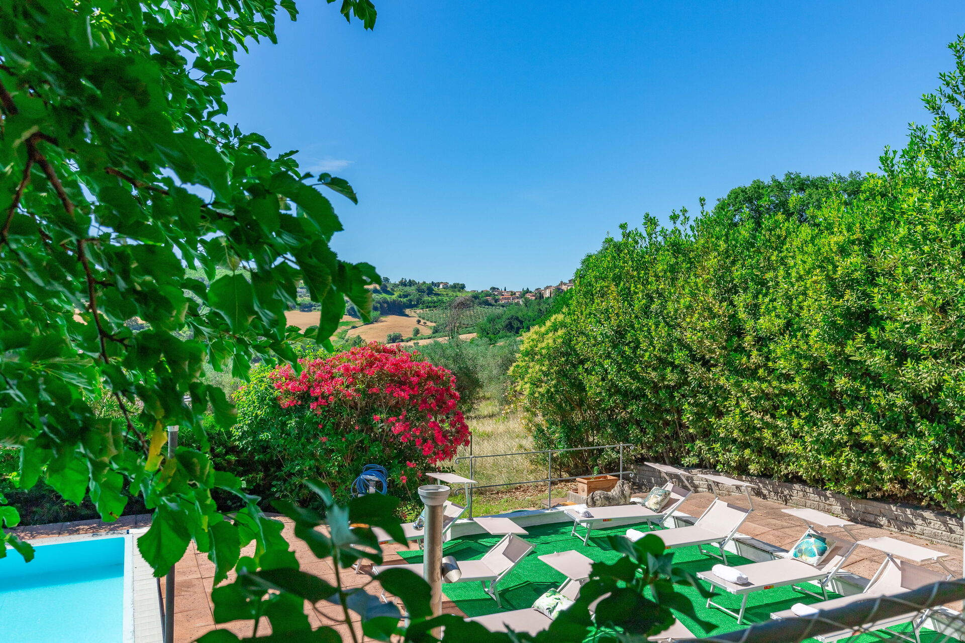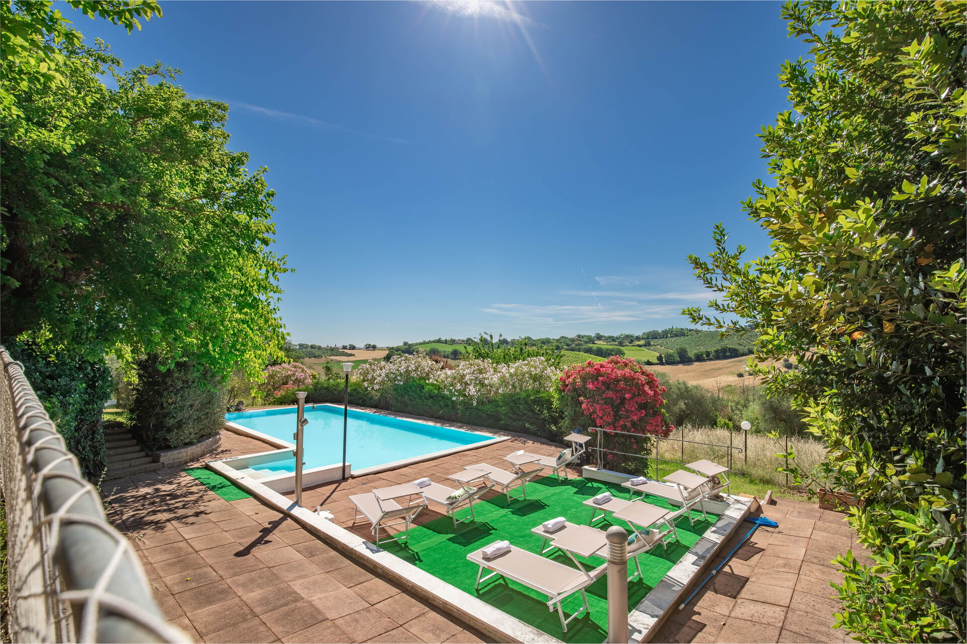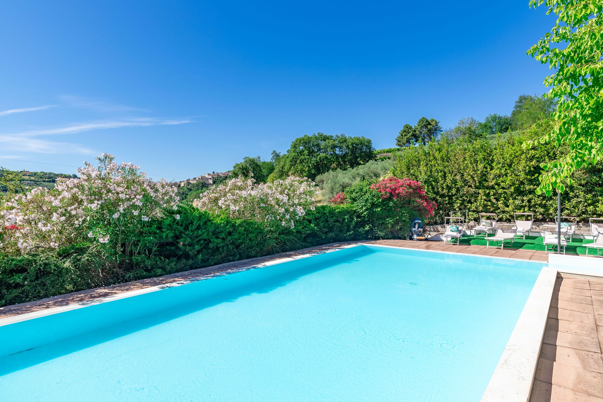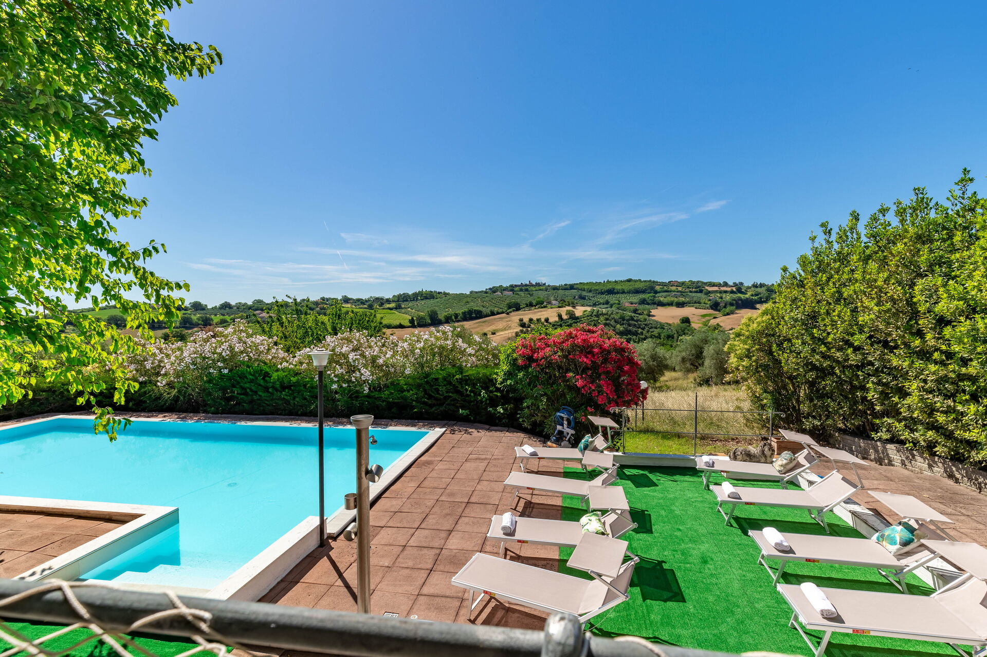 Une piscine enchanteresse avec vue panoramique sur les collines environnantes vous invite à vous détendre et à profiter de la beauté intemporelle des Marches.