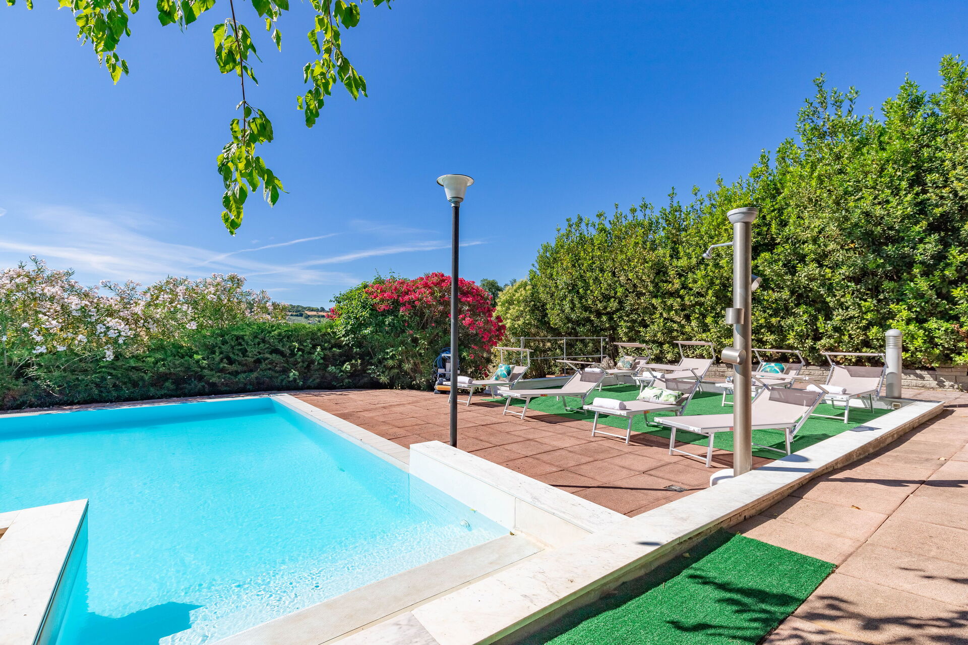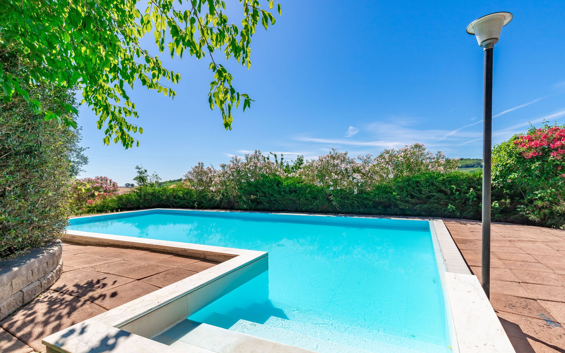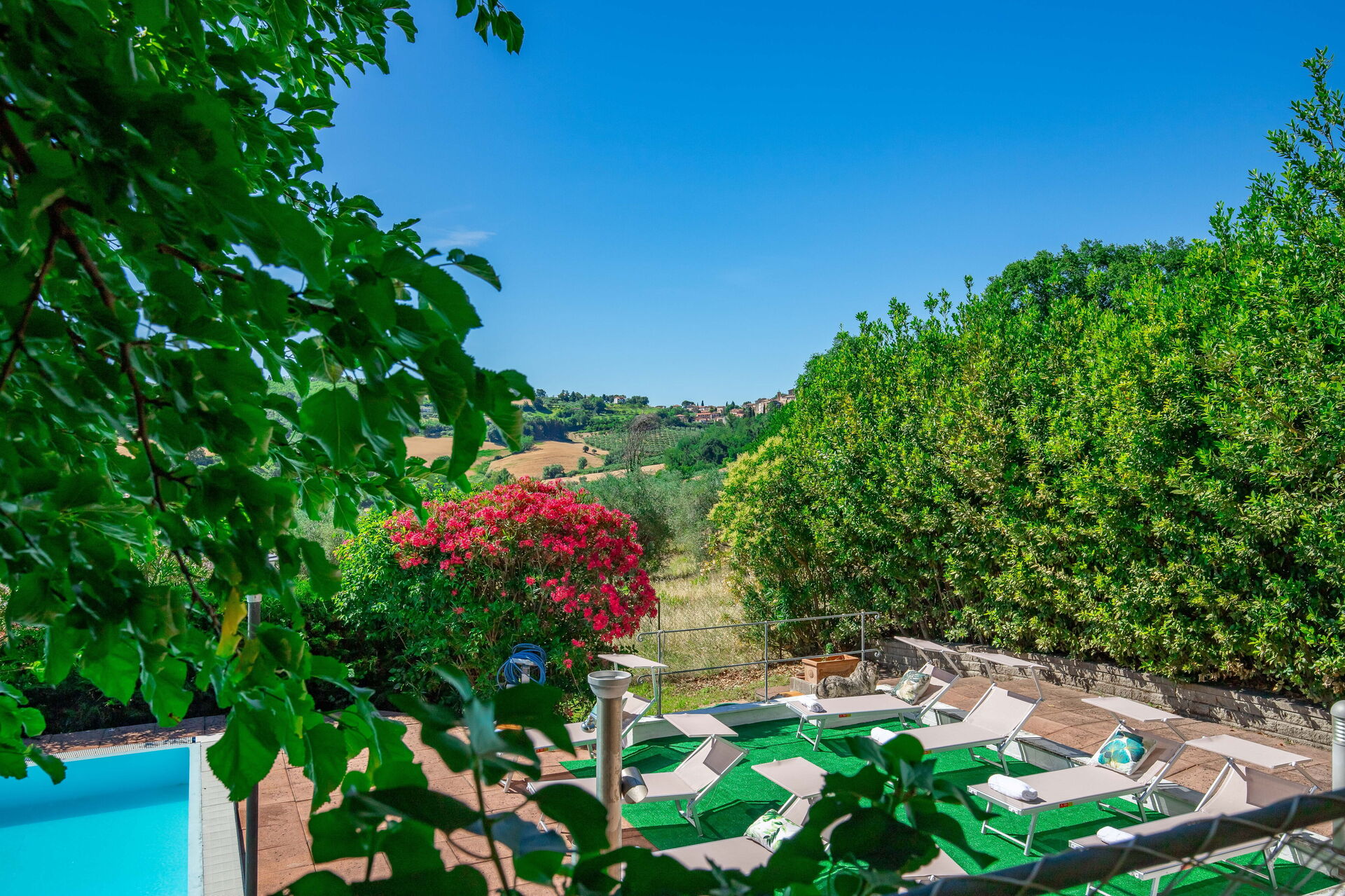Une piscine enchanteresse avec vue panoramique sur les collines environnantes vous invite à vous détendre et à profiter de la beauté intemporelle des Marches.