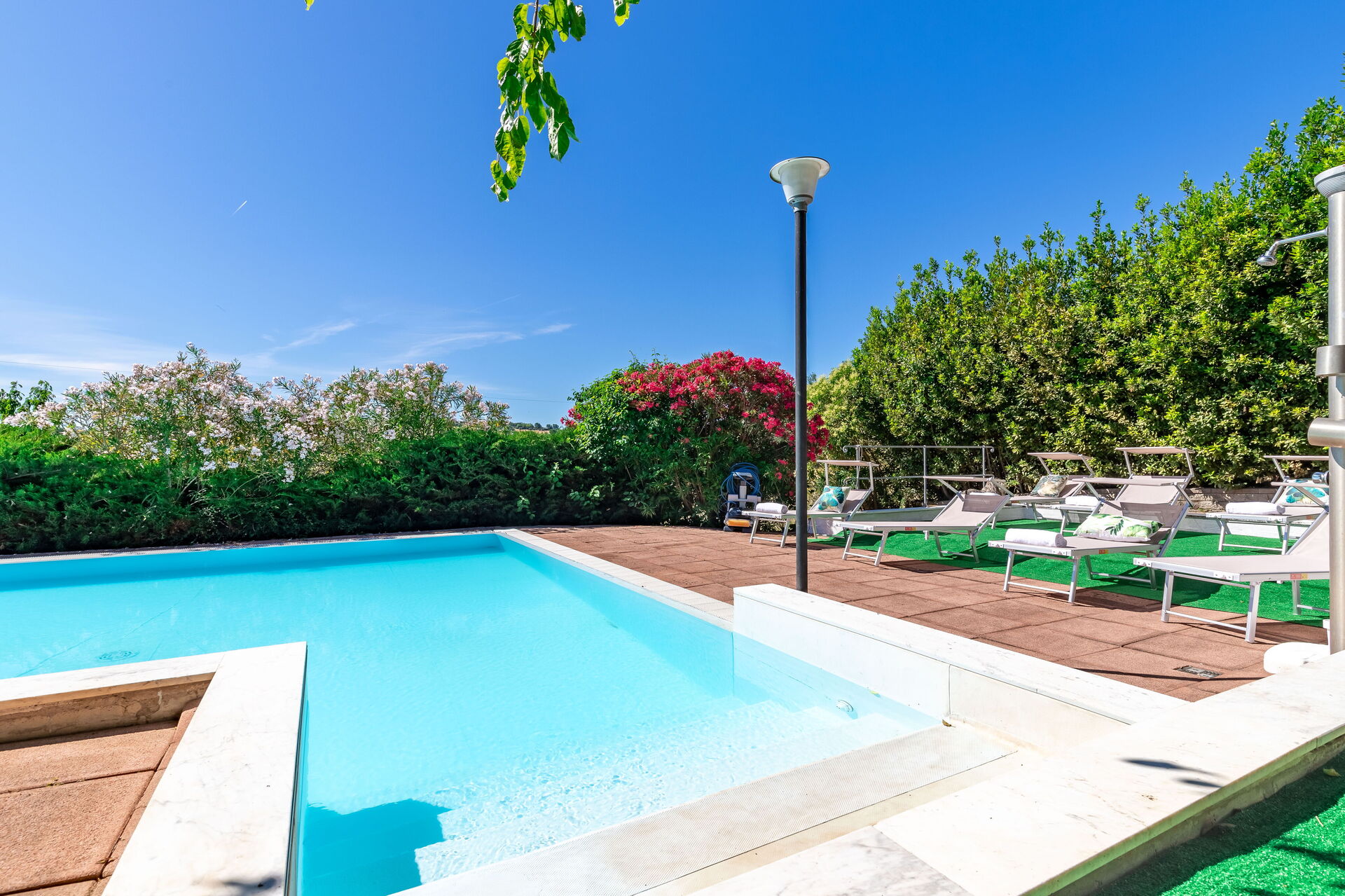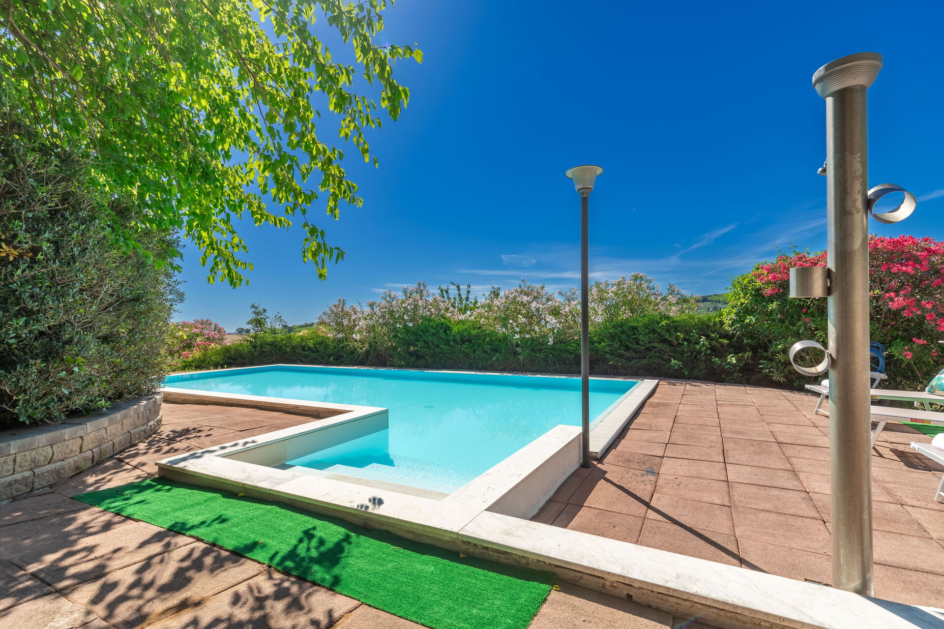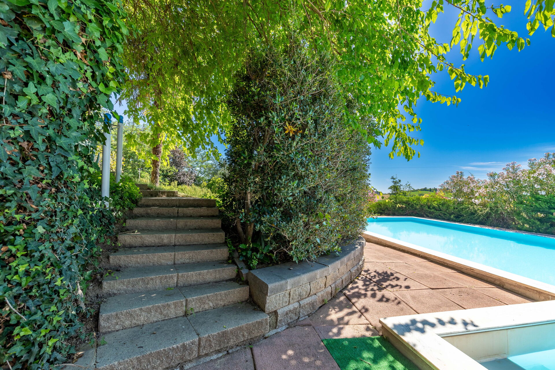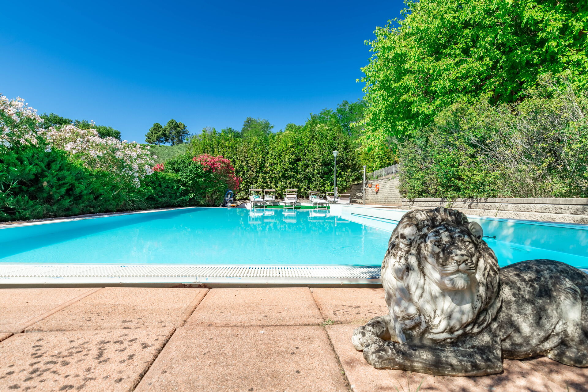 Une piscine enchanteresse avec vue panoramique sur les collines environnantes vous invite à vous détendre et à profiter de la beauté intemporelle des Marches.