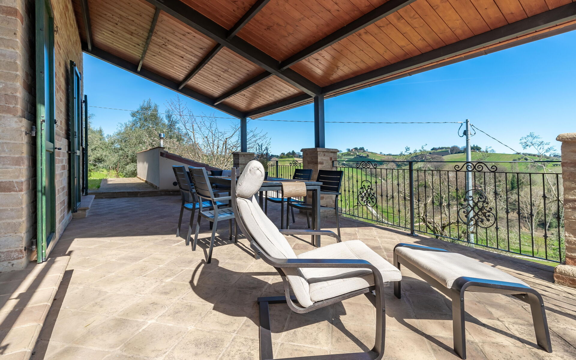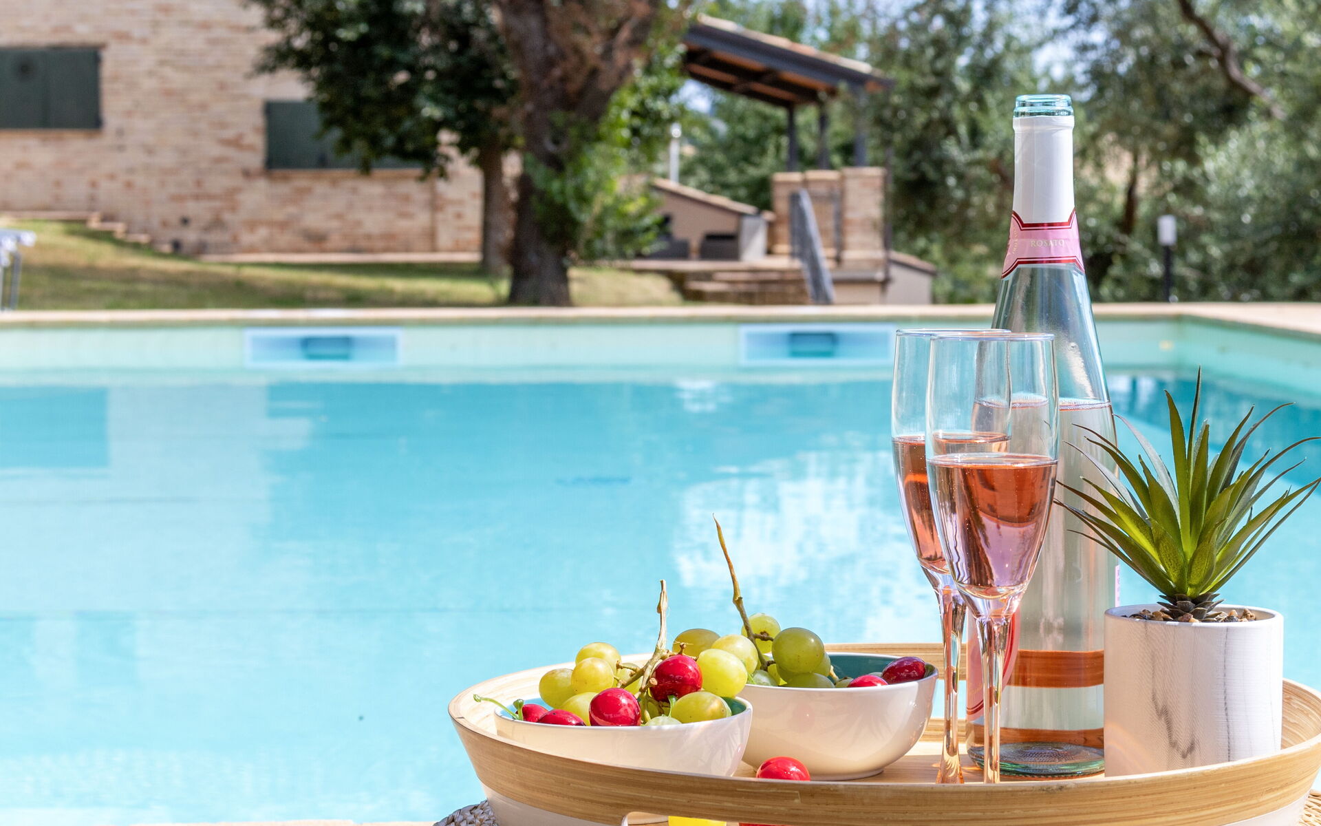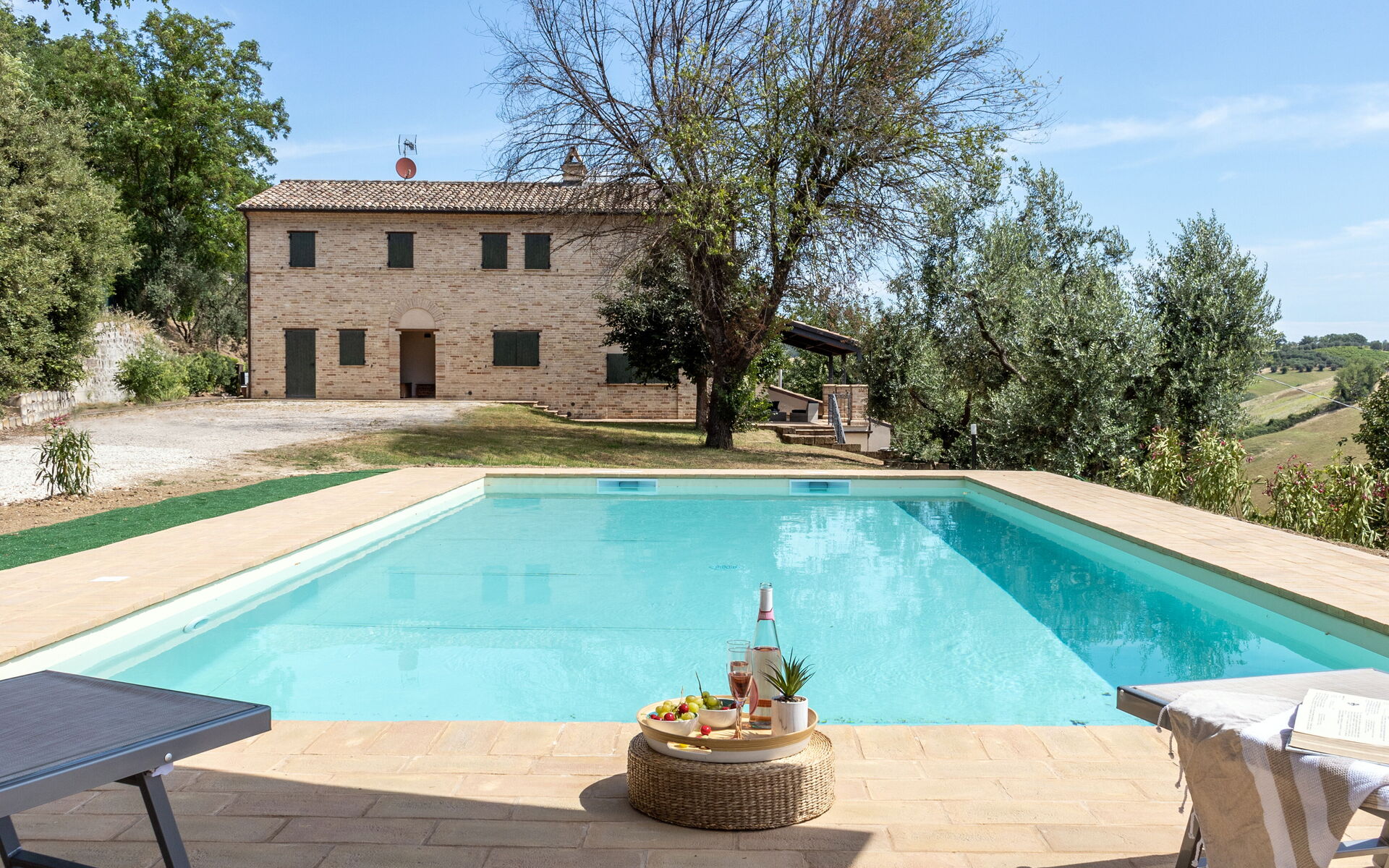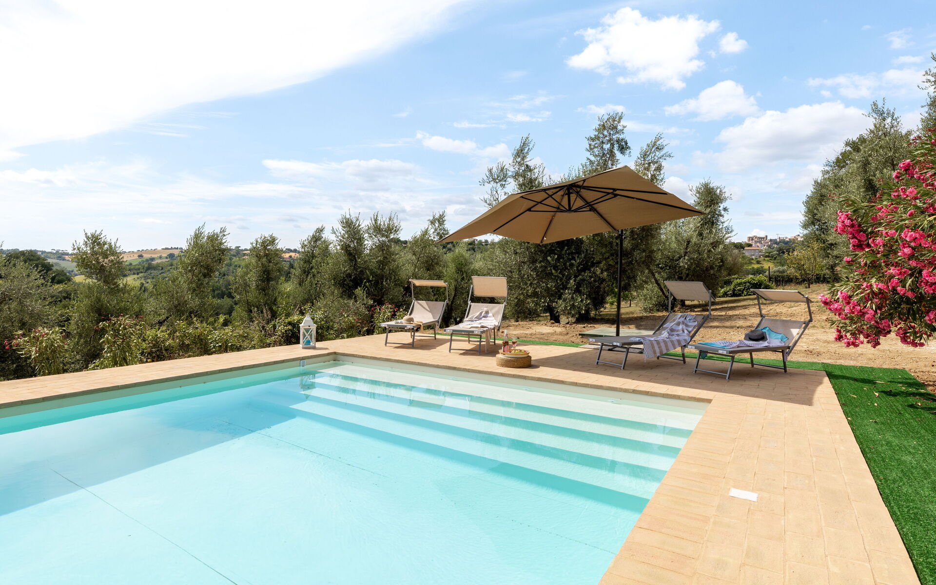 Une charmante piscine à débordement, entourée par la campagne luxuriante de la région des Marches, offre un cadre à couper le souffle. Les chaises longues et transats invitent à la détente, offrant une expérience luxueuse et tranquille dans un environnement d'une beauté incomparable.