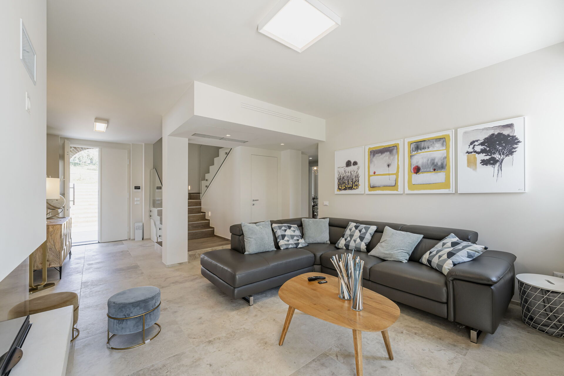 Salon: canapé, cheminée, télévision, moustiquaires, sortie sur le jardin.