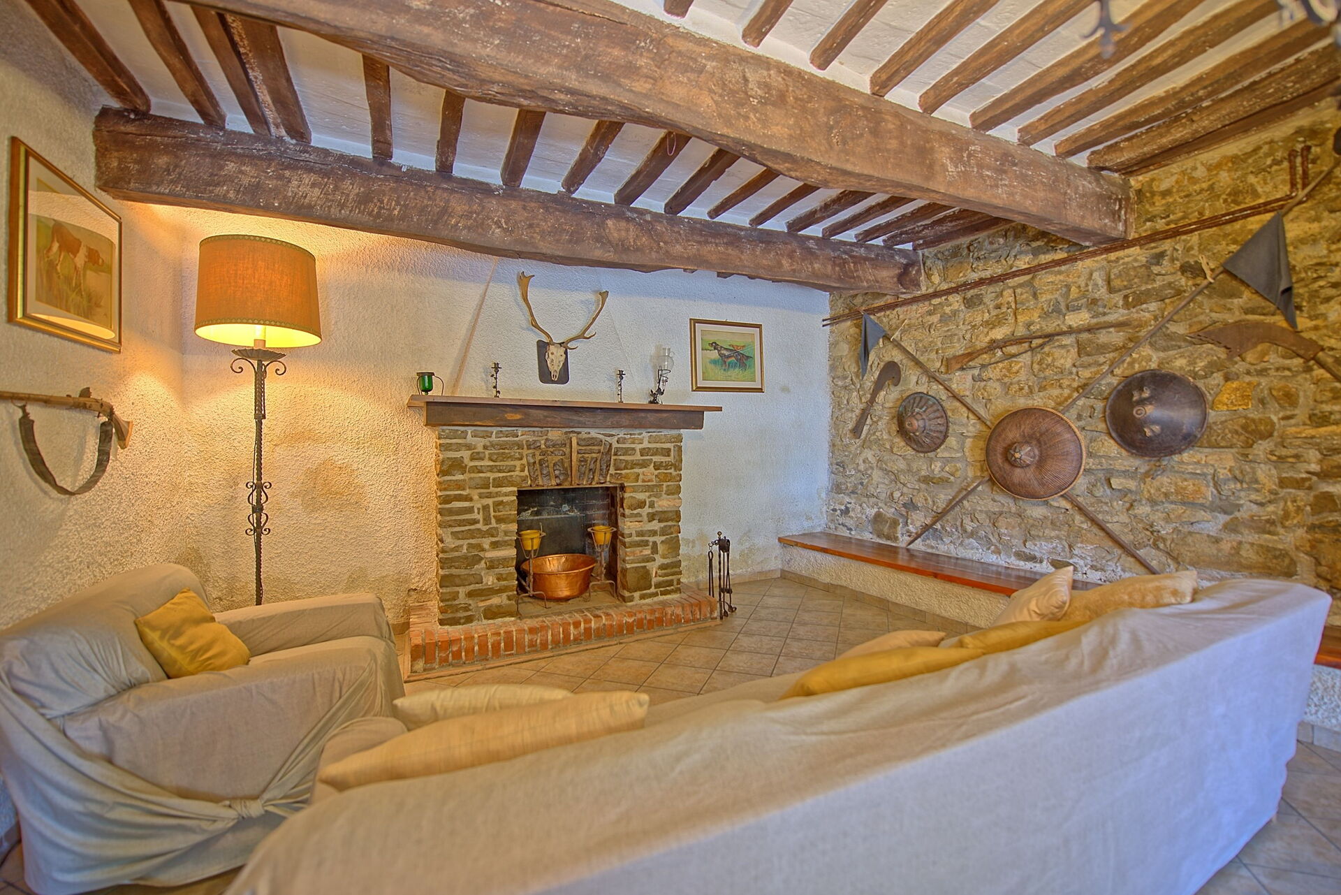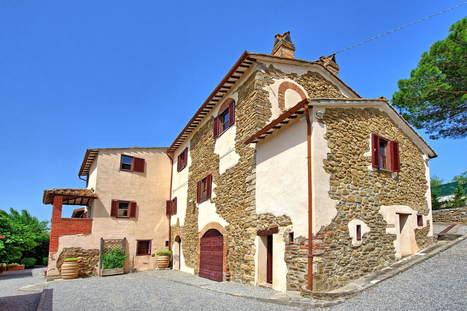 Belle ferme aux façades de pierres apparentes du XIVème siècle en Ombrie, au coeur d’une propriété de 4 ha avec de nombreuses oliveraies, plantes ornementales et arbres fruitiers.