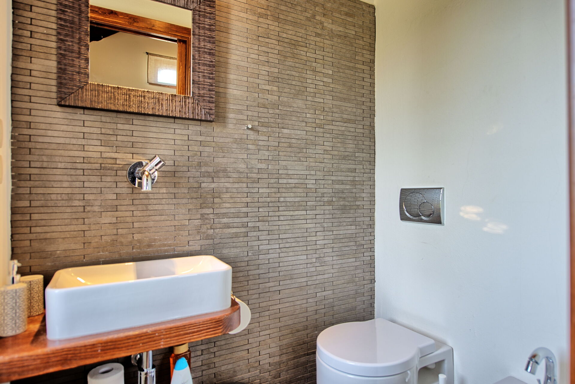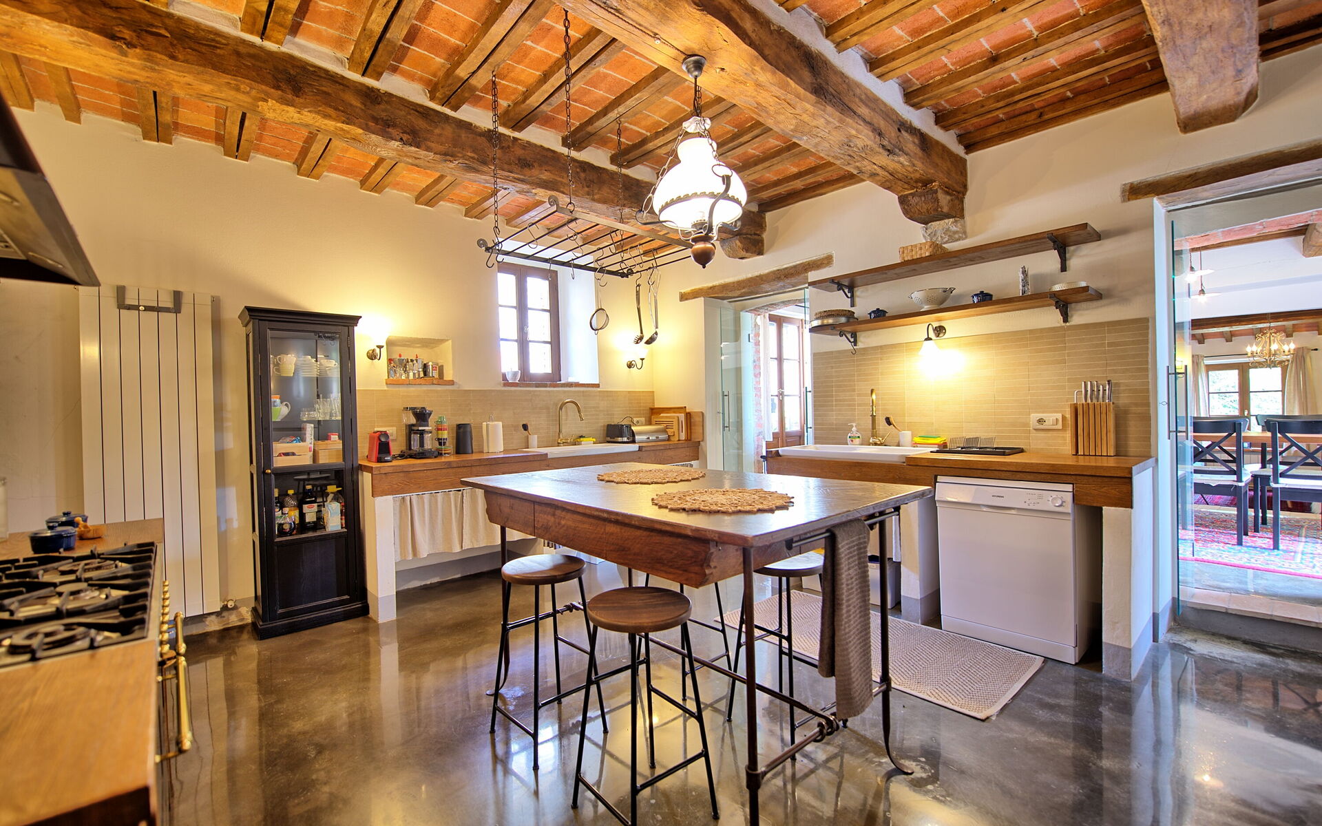 1 marche plus bas : cuisine (2 fours, lave-vaisselle, 6 feux, freezer), pièce avec lave-linge et sèche-linge, 2 chambres doubles (air conditionné, à côté de la cuisine), salle de bains avec douche (chaque chambre à un accès direct (porte) à la salle de bains et une des deux chambres est accessible de l’extérieur et de l’intérieur en traversant la seconde chambre et la salle de bains). Dans ce cas une chambre est de passage.