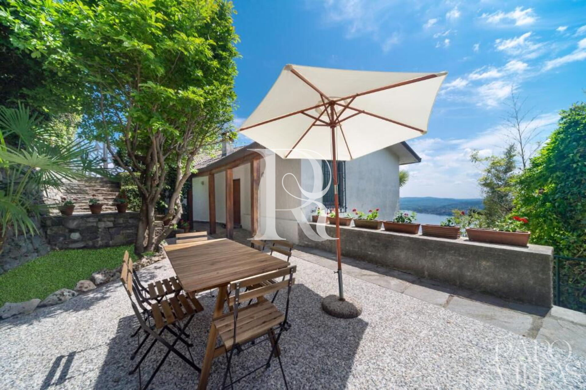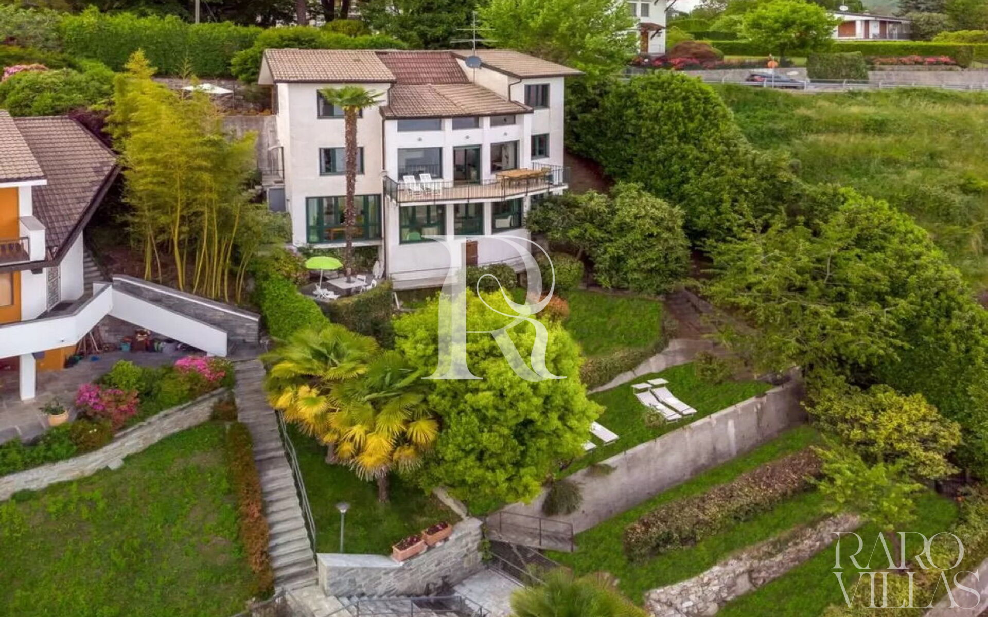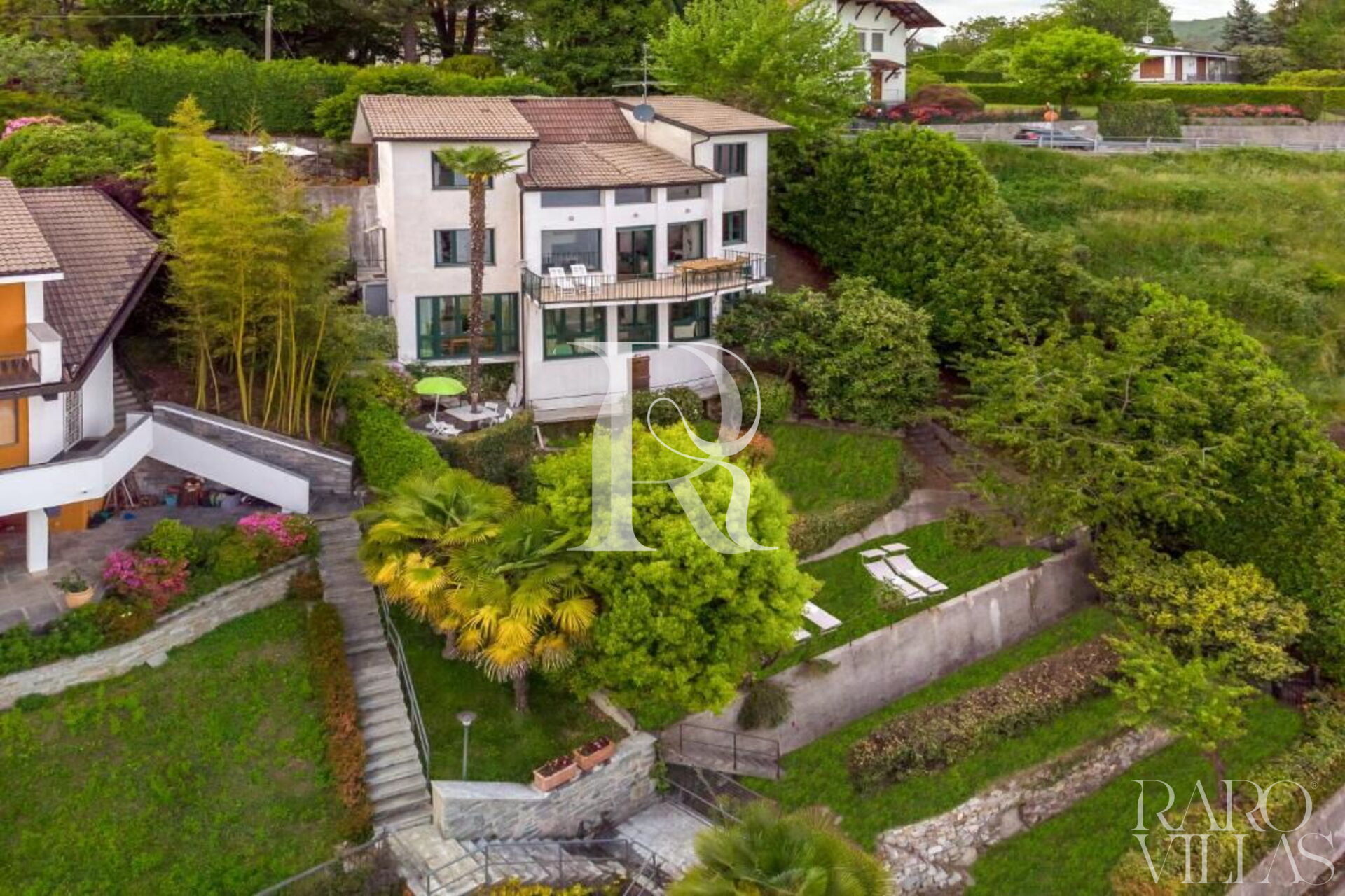 Palazzo Contessa was created to homage the Lake Maggiore, always and from every space. The large windows make the house a set of refined rooms, to be discovered and enjoyed. Its white and meastose façade stands out against a unique backdrop, between sky and water, between mountains and boats, and with nature as the protagonist of enchanting landscapes. Inside, this dwelling is structured on three levels. On the top floor there are two bedrooms, a relaxation area and a bathroom. Going down the large staircase made of masonry and wood, you enter an immense living area, consisting of a dining room and living room, from which you access the terrace, the authentic pearl of the house. From the terrace you can enjoy the view, have lunch, read a book or sunbathe. On the same floor there is a kitchen and a sleeping area, secluded and independent, with an attached bathroom. Going down one floor, with its own entrance guaranteeing maximum privacy, is the suite. This little love nest, also entirely overlooking the lake, consists of a kitchen with dining area, a quadruple bedroom (with a king-size double bed and two single beds) and a bathroom. The garden is structured on four levels, on two of which there are two barbecues, two dining areas and two terraces, ideal places for sunbathing and enjoying the view. The house also welcomes four-legged friends. Facilities include: two fully equipped kitchens (with dishwasher, oven, hob and microwave) a washing machine, two TVs and unlimited wifi connection.