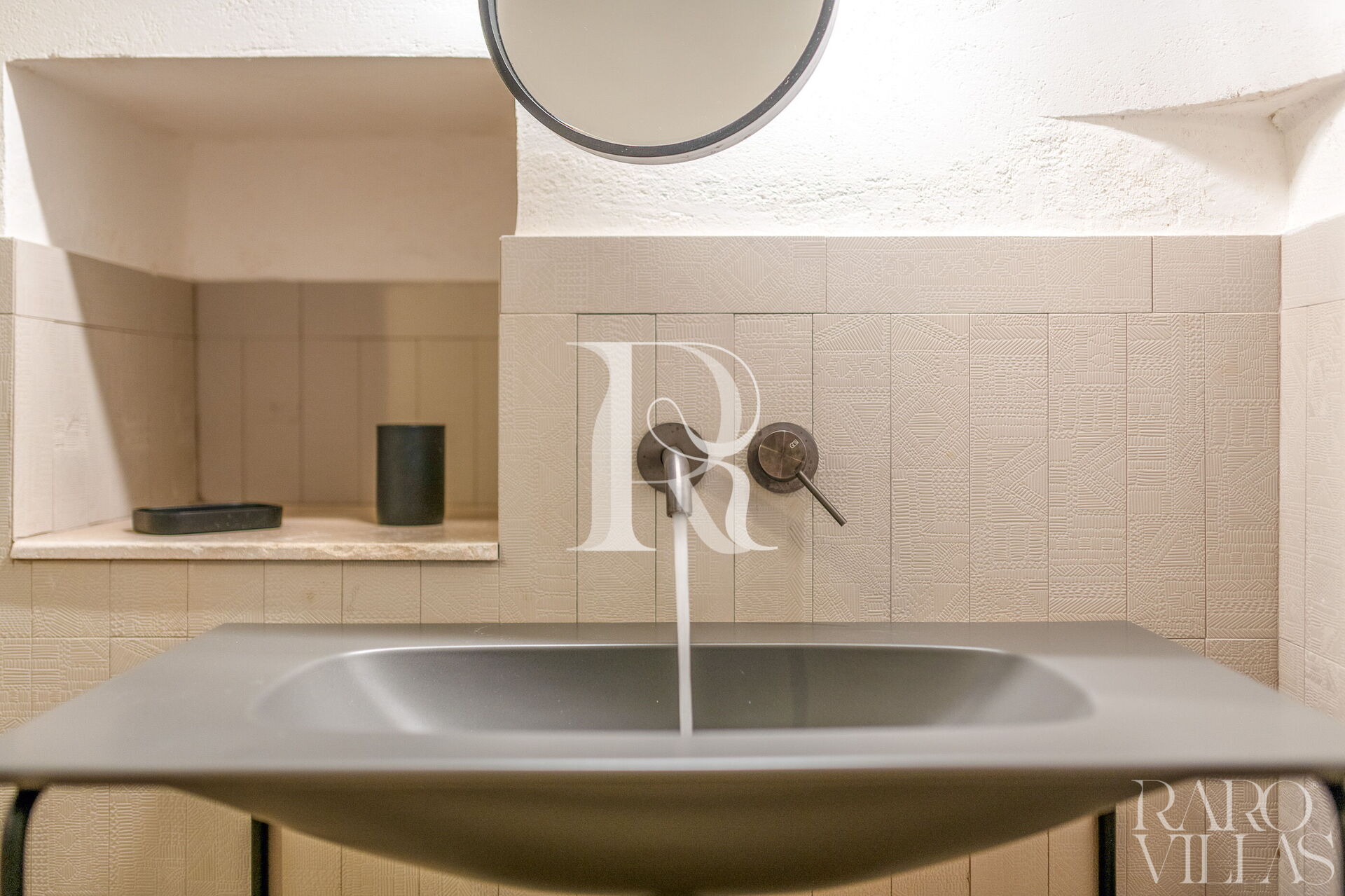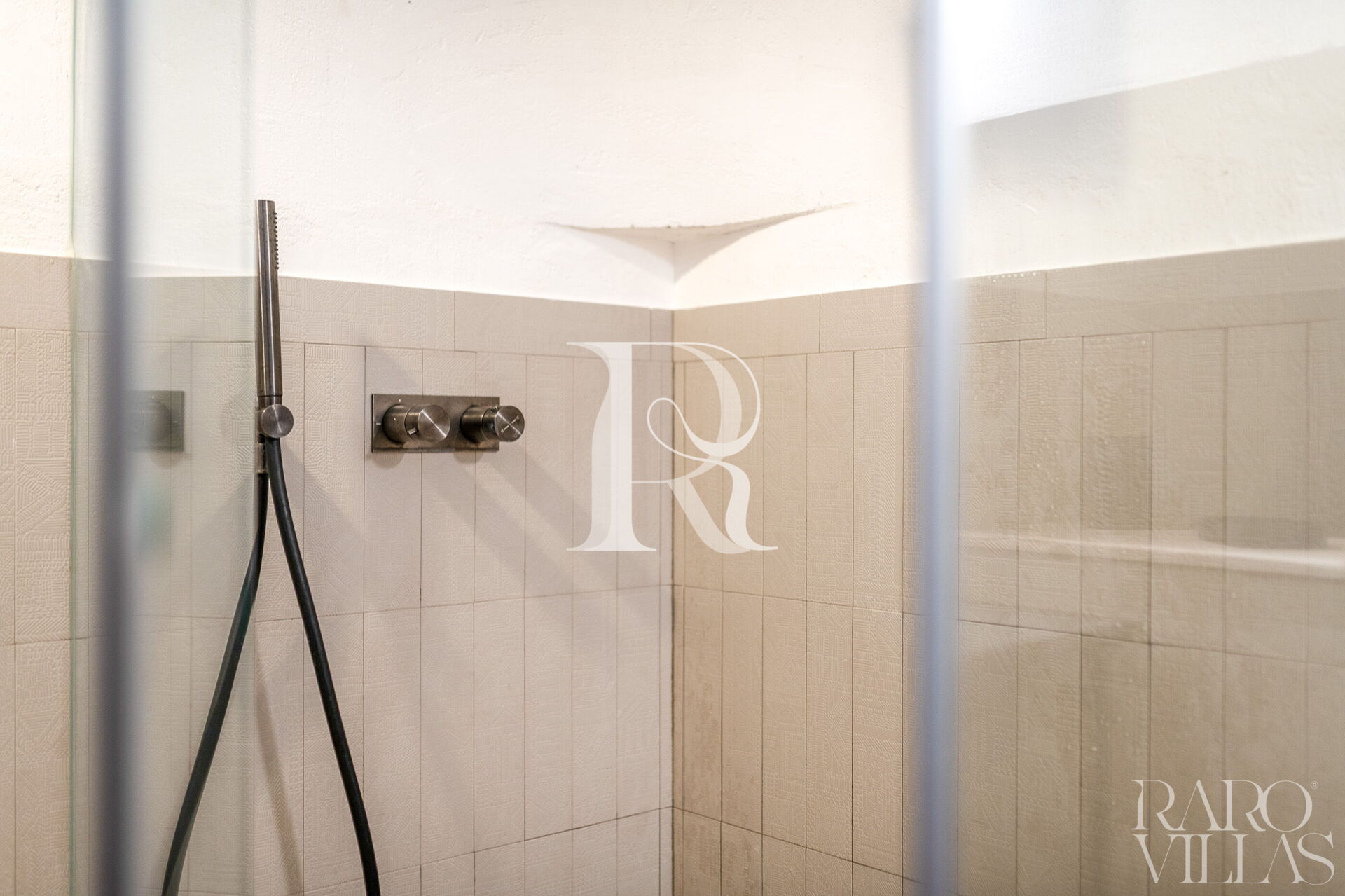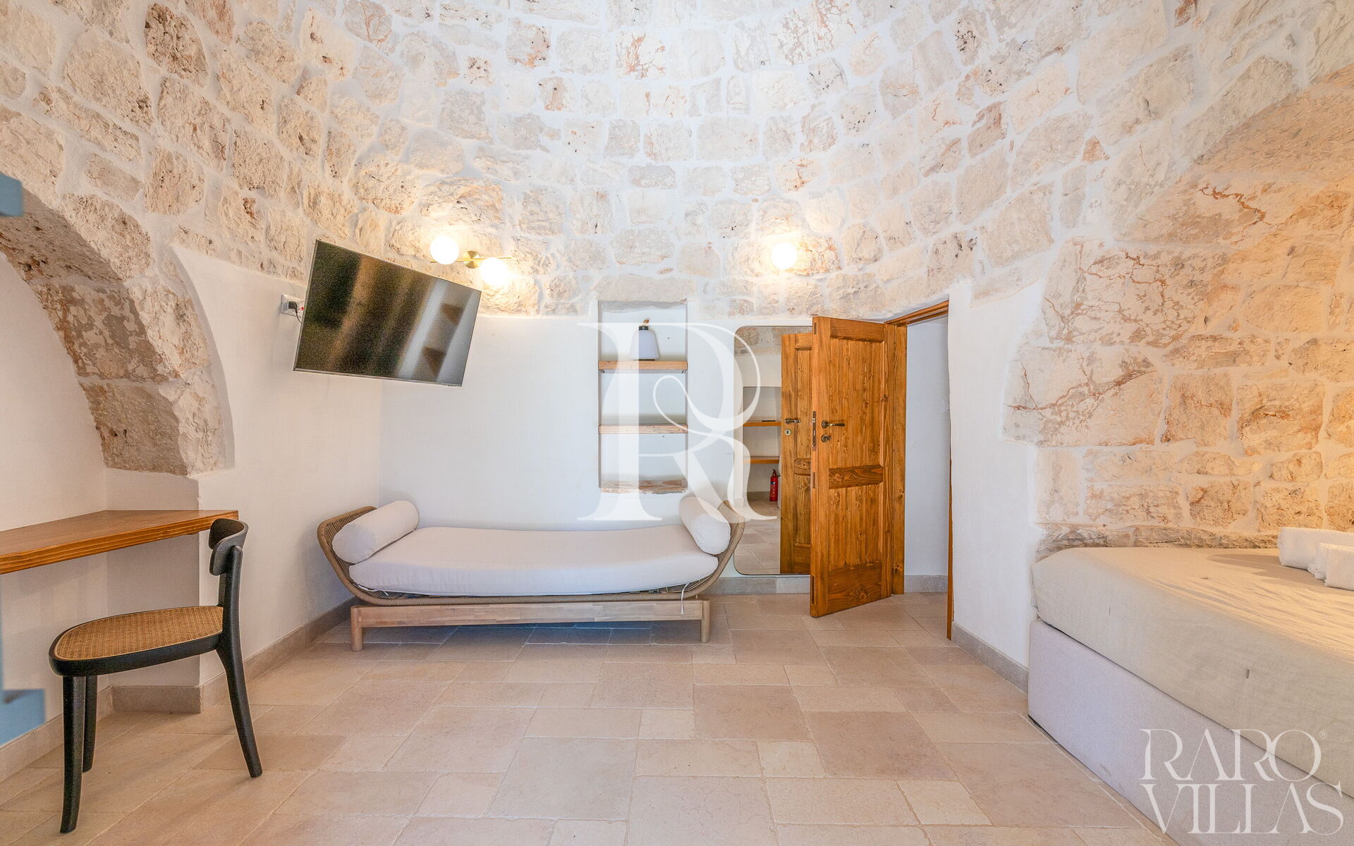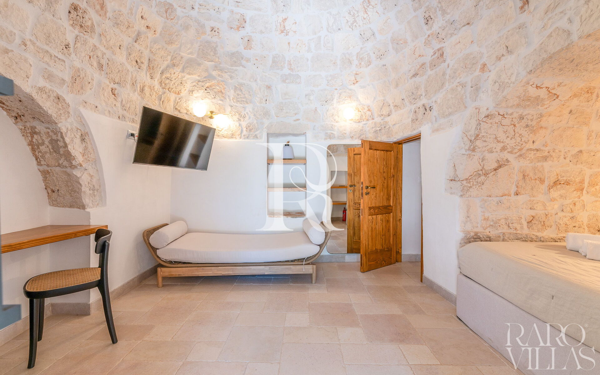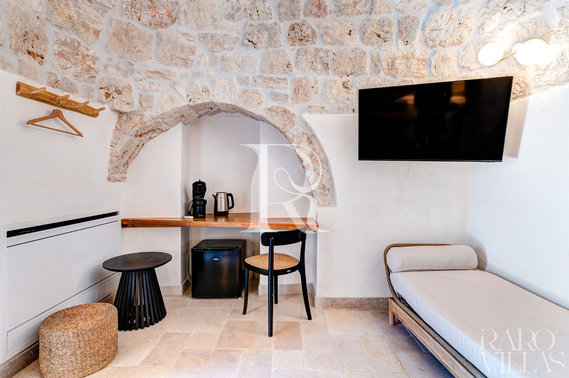The Trullo Suite with independent entrance and consists of a single room with a double bed in an alcove, children’s bed/sofa, small desk and ensuite bathroom. It is fully equipped with a Nespresso Vertuo machine, tea kettle and a 43” smart TV.
