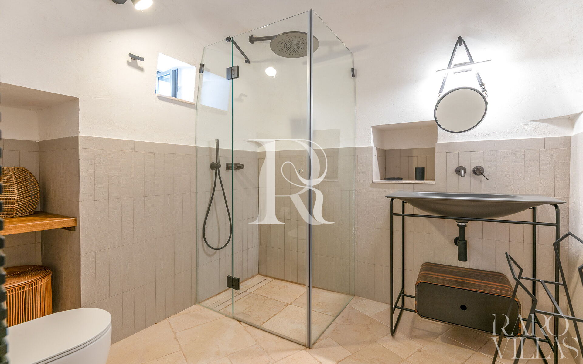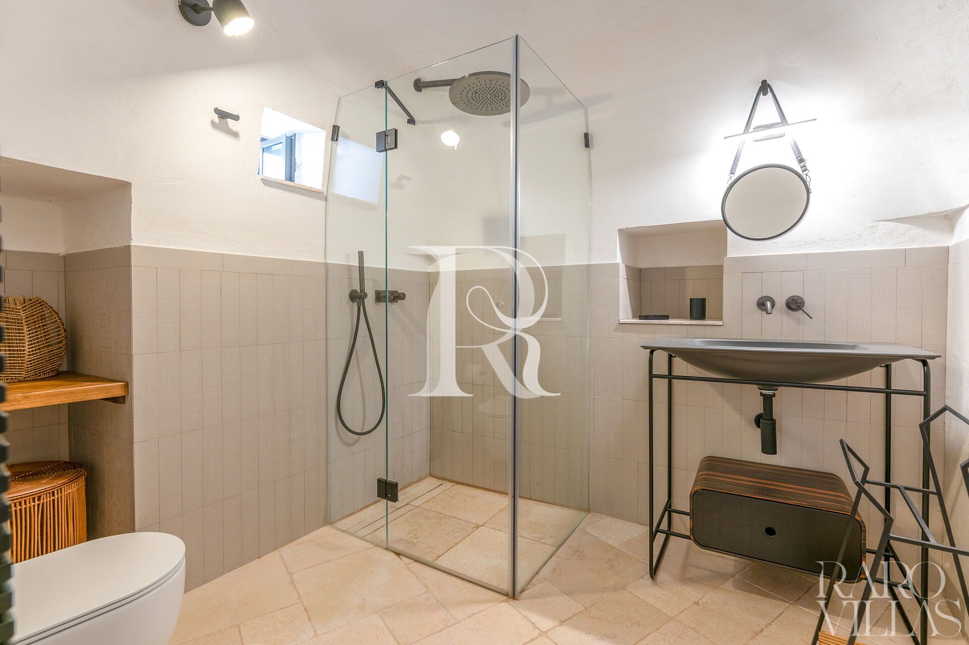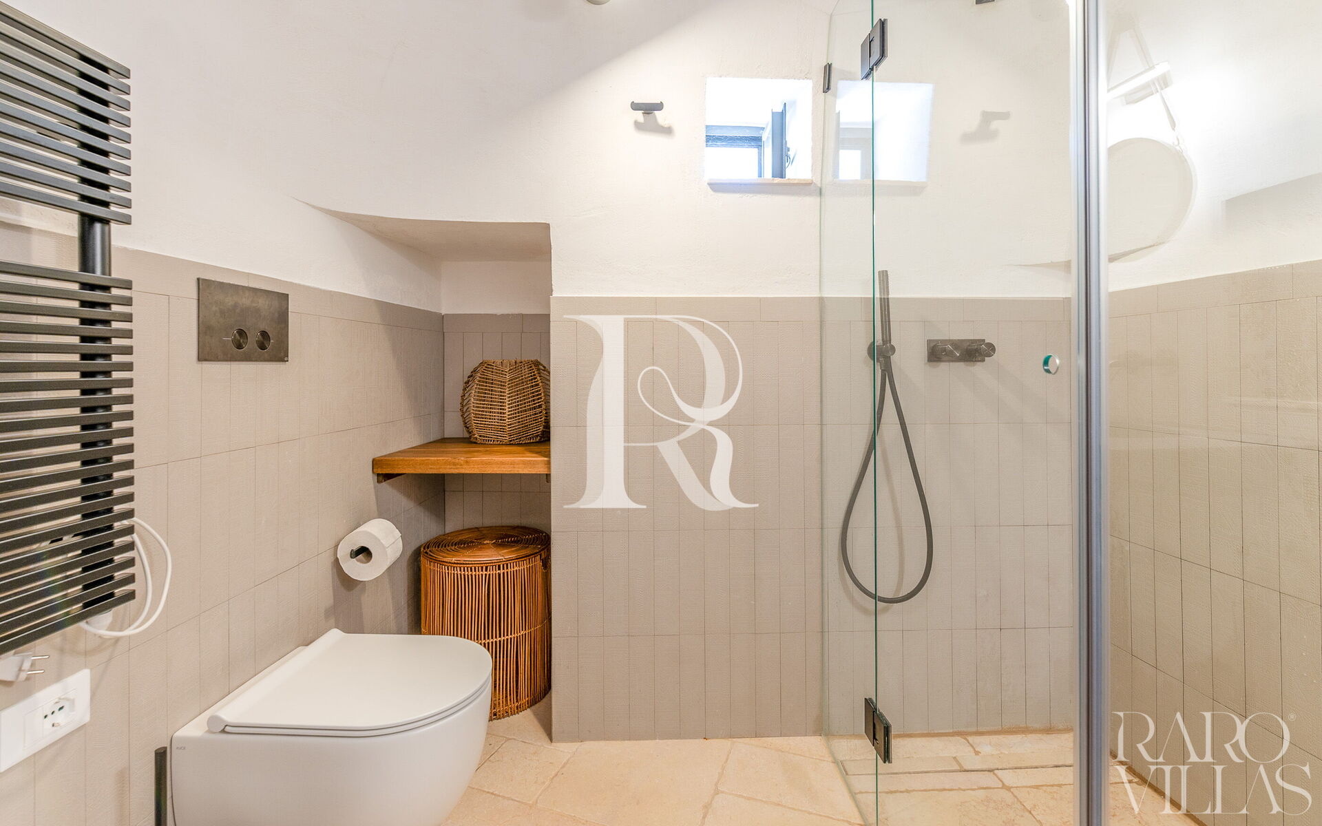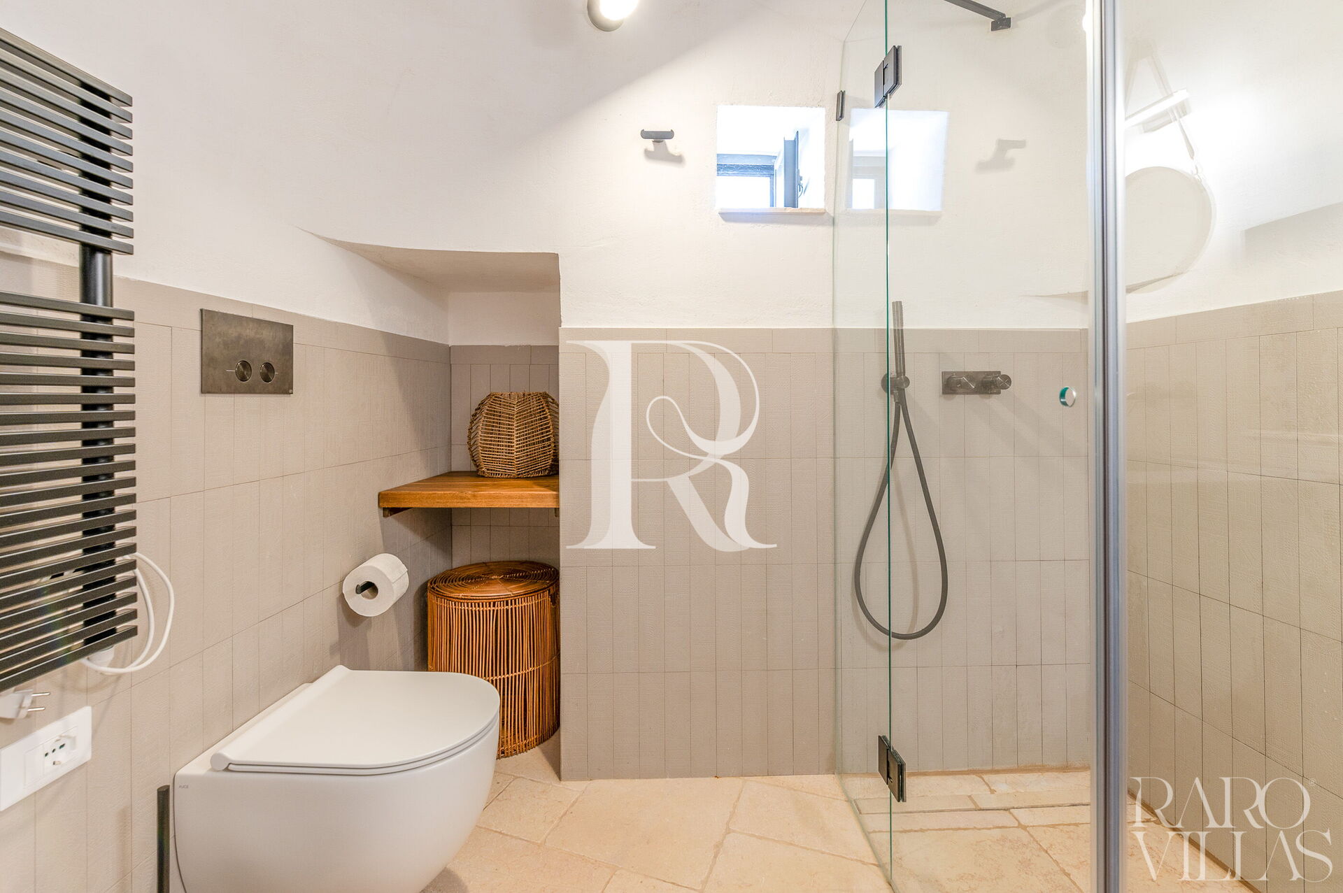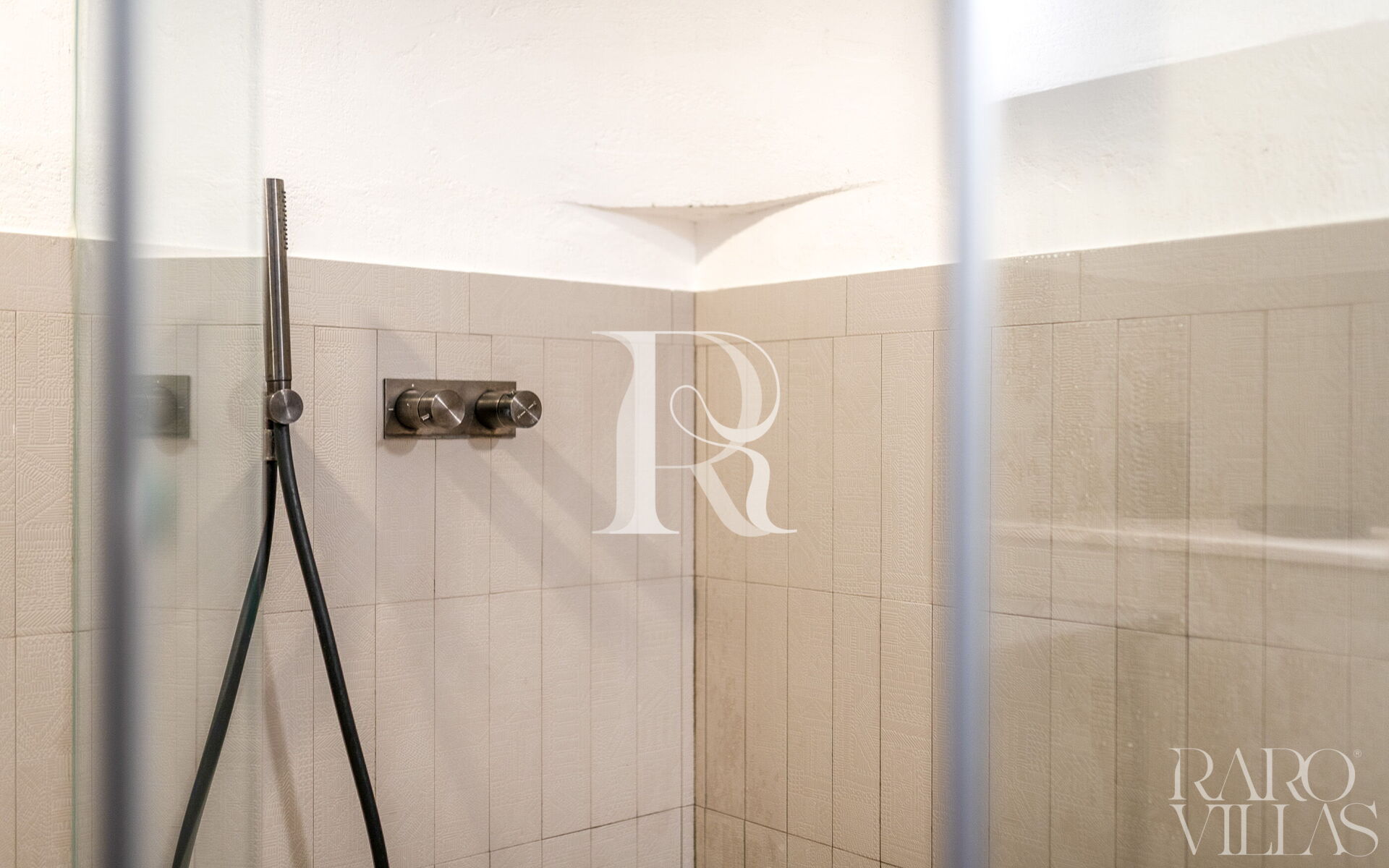 The Trullo Suite with independent entrance and consists of a single room with a double bed in an alcove, children’s bed/sofa, small desk and ensuite bathroom. It is fully equipped with a Nespresso Vertuo machine, tea kettle and a 43” smart TV.
