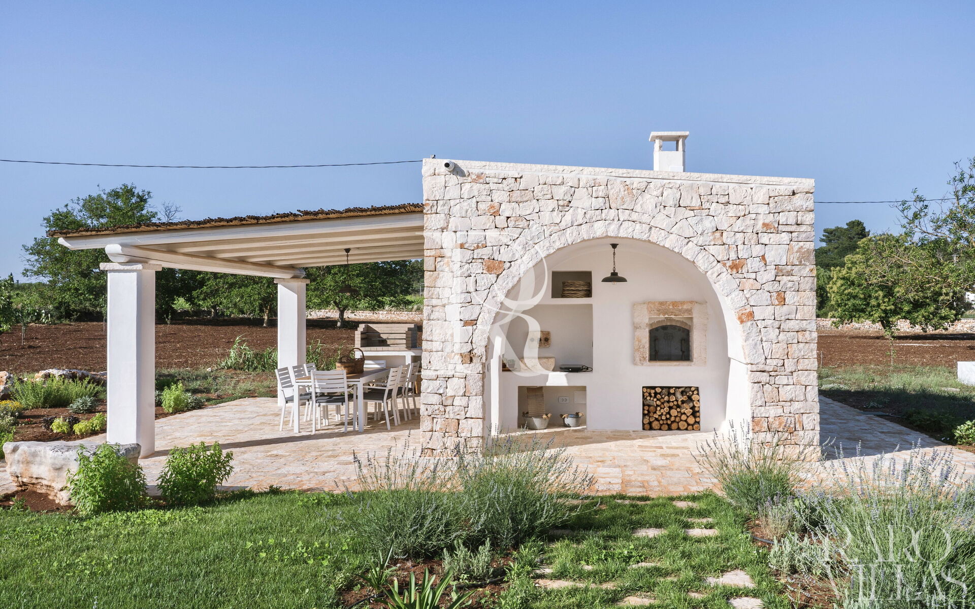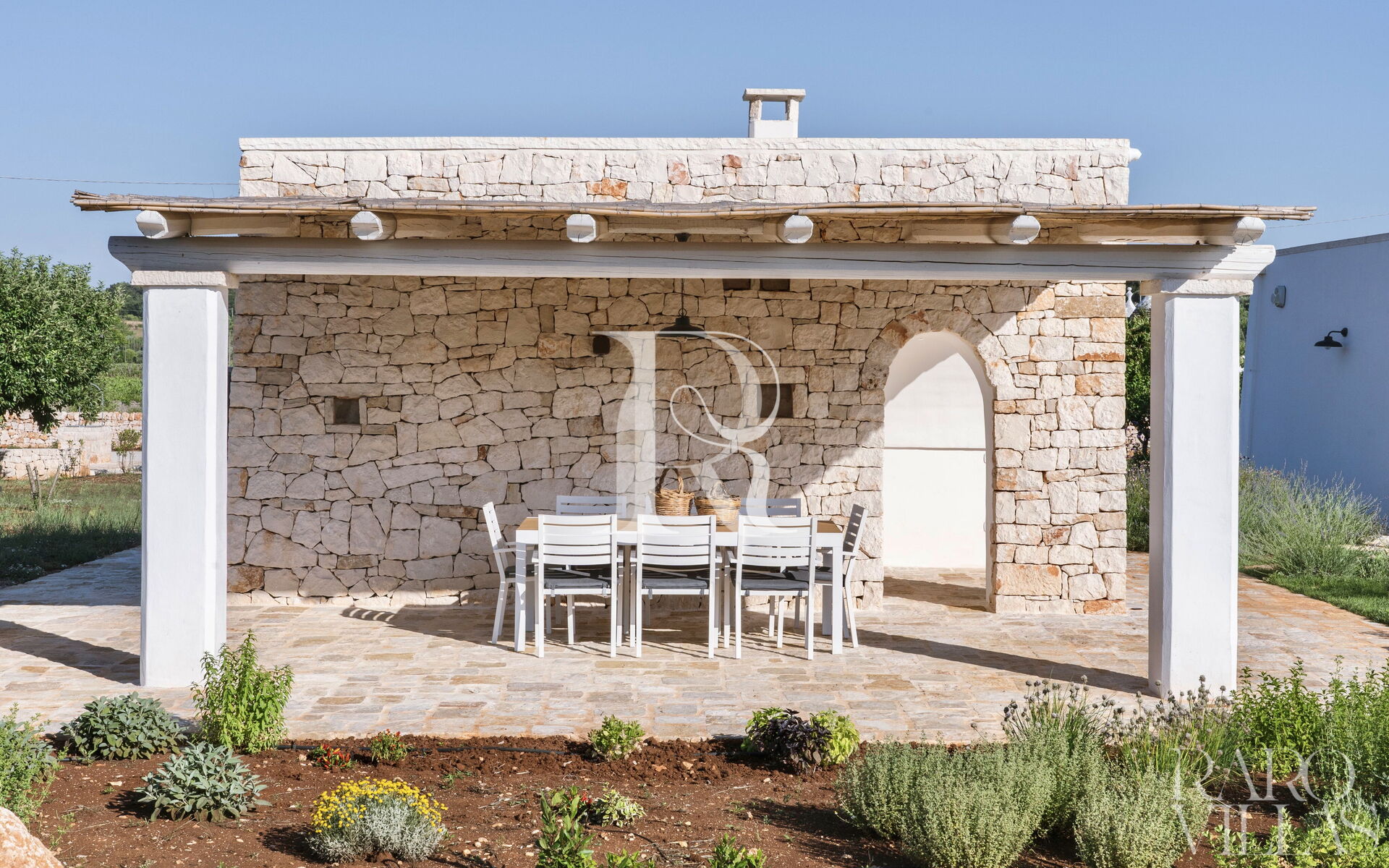 Outside the Trullo with pool for rent is the large garden with barbecue area and the organic vegetable garden with a veranda in the cooler.