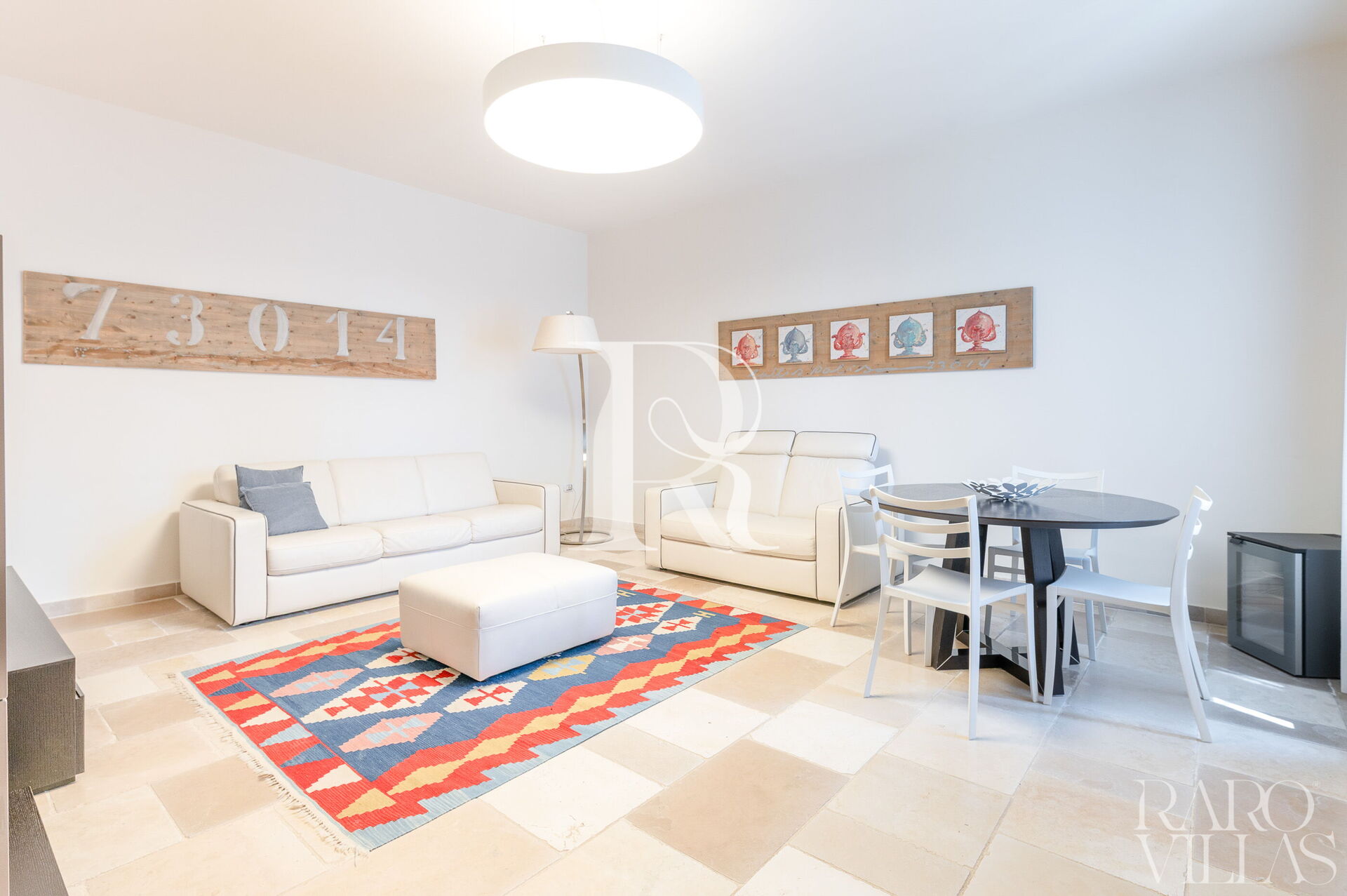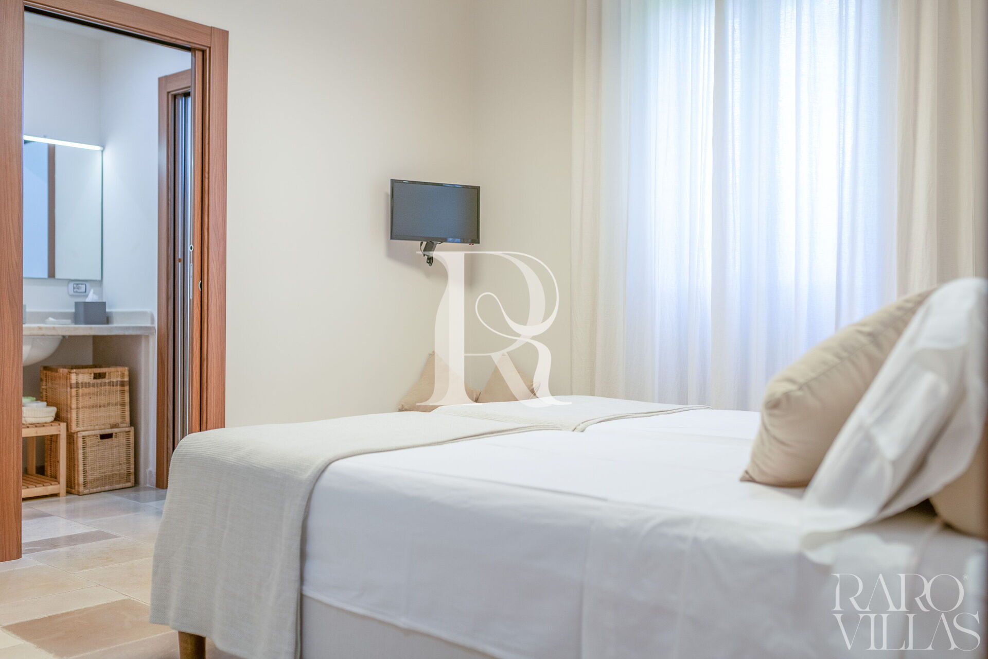 Masseria Ceratonia, is a prestigious villa with swimming pool for rent and services included for your holidays in Puglia. A Masseria with characteristic vaulted attics, local stone and spacious rooms with en suite bathrooms with modern and elegant furnishings to ensure the best comfort.