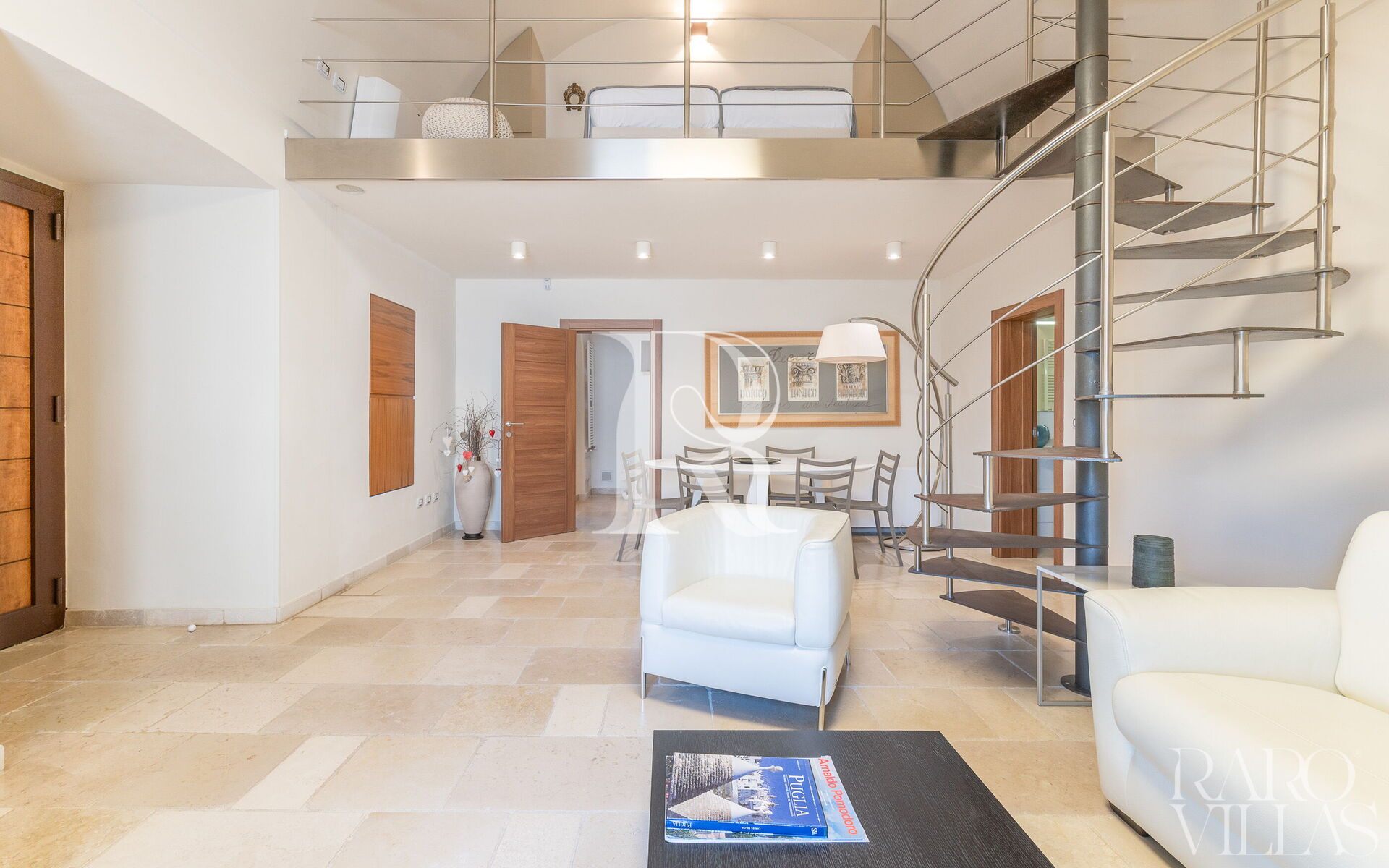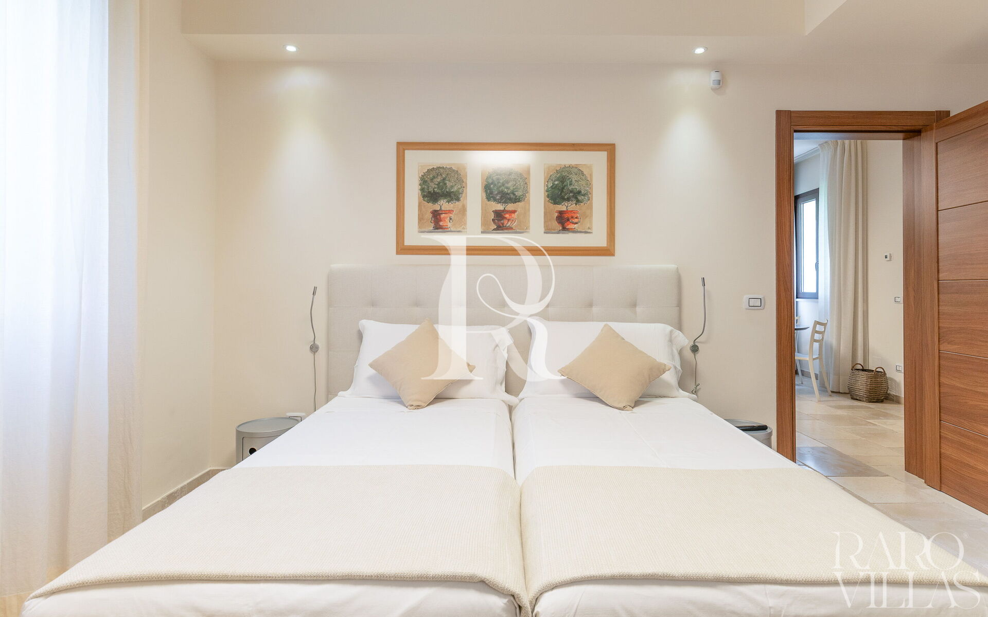 The Capitels Suite is arguably the most distinctive and atmospheric of all our suites. Its impressive internal height allows for a beautiful mezzanine where the bedroom is situated. On the lower level, beyond the stunning lounge overlooking the internal courtyard and pool, this suite is the only one featuring a fully-equipped kitchen and a bathroom with double sinks. Tastefully furnished with attention to detail, the Capitels Suite is our pride and joy, offering a spacious living area ideal for relaxation.
