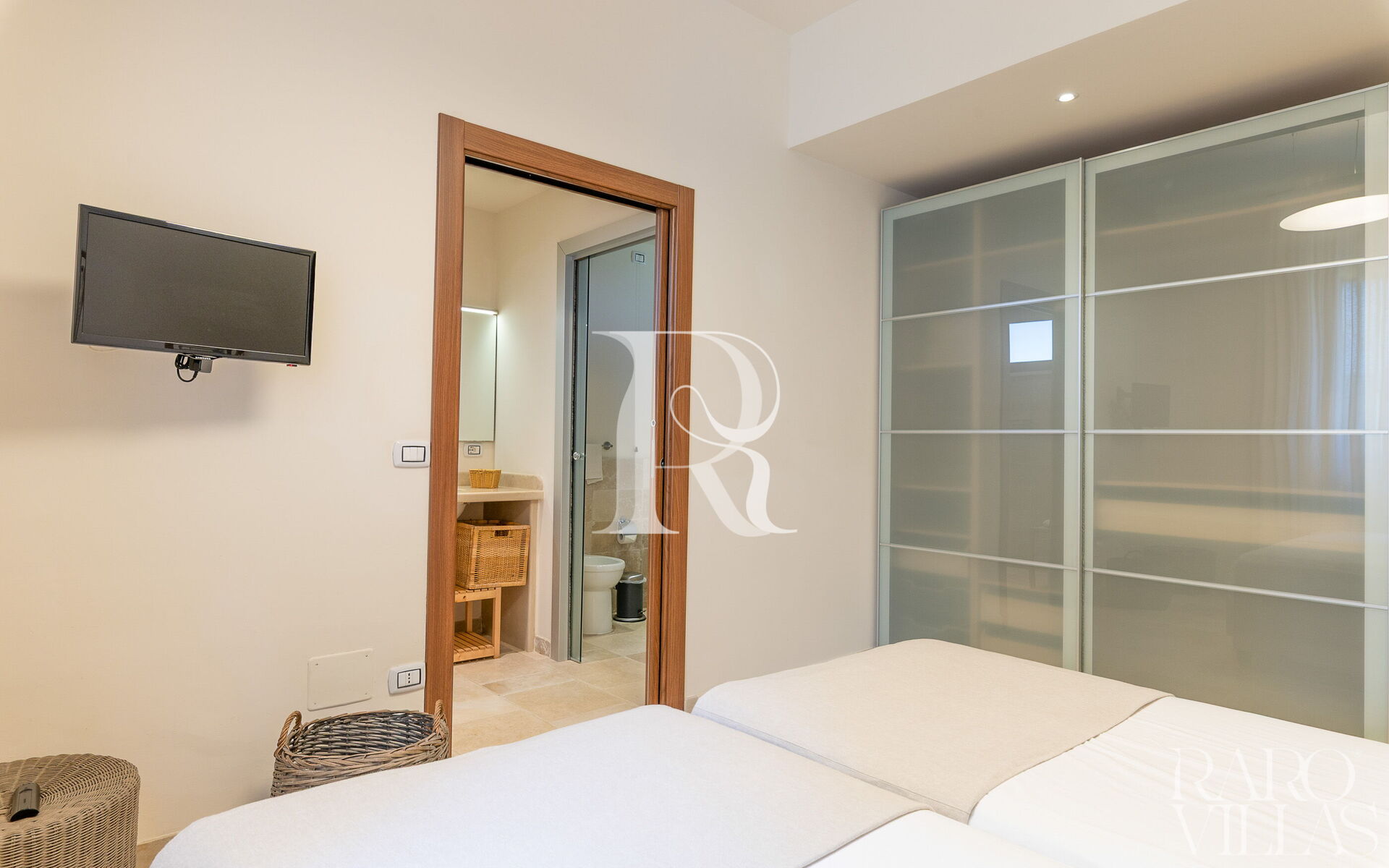 The Coral Suite is the first of three suites situated near the pool. With its independent entrance, it’s ideal for those who want to relax and enjoy the wonders of Masseria Ceratonia in full privacy and luxury. The Coral Suite, like all our suites, is organized into two rooms: a living area with a sofa bed and a spacious master bedroom. A large bathroom divided into three separate areas, including a dedicated shower room, enhances the ambiance and provides the utmost relaxation. Located just steps from the pool, this stunning suite offers an exceptional sense of vacation and well-being.