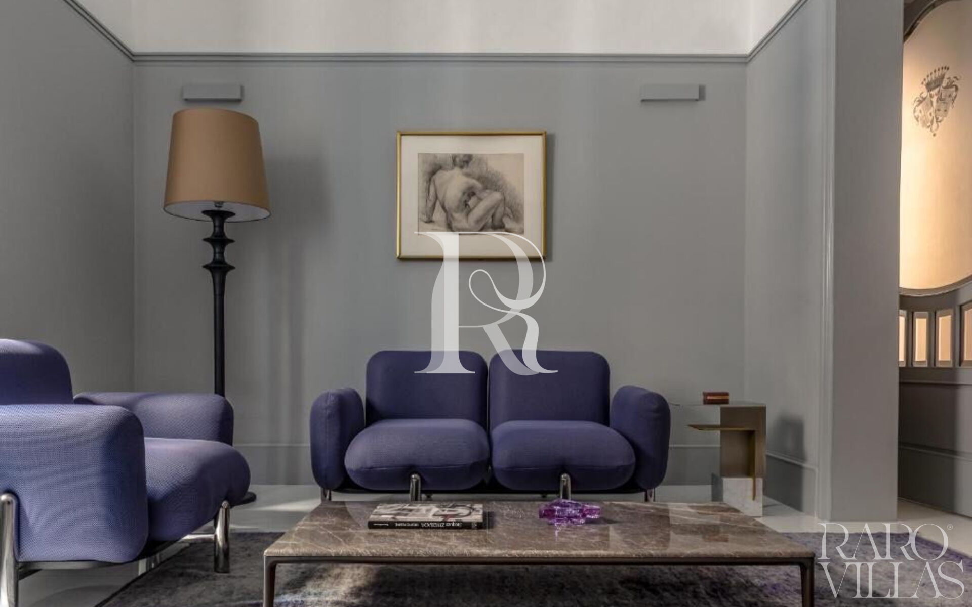 The rooms, enriched by antique ceilings, original stuccoes and a color palette that ranges from soft tones to bright colors such as plum and cobalt blue, integrate harmoniously with pieces of art such as the Callimaco lamp by Ettore Sottsass for Artemide, Superleggera chair by Gio Ponti by Cassina, Escargot lamps by Le Corbusier produced by Nemo and creations by Carlo Scarpa.