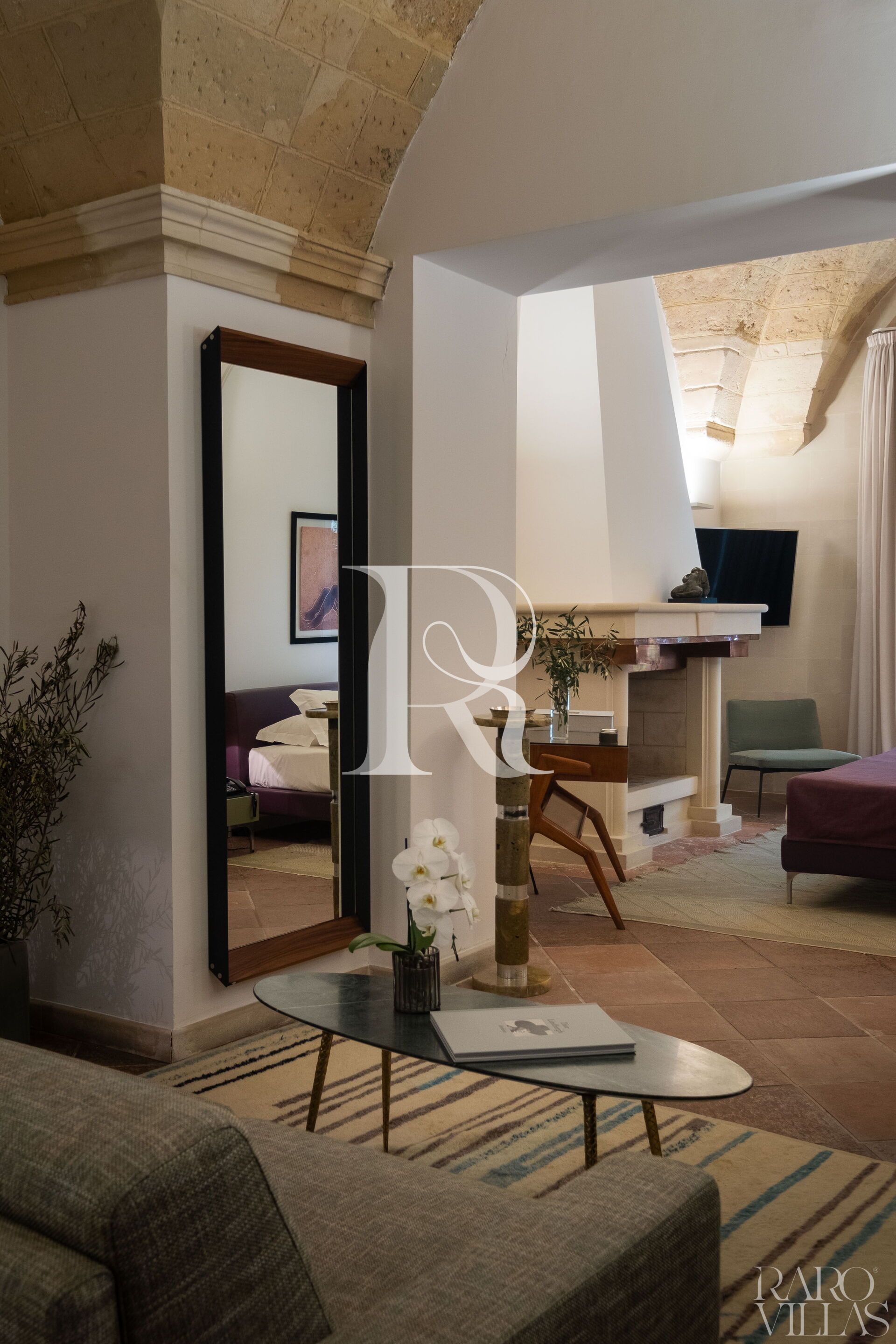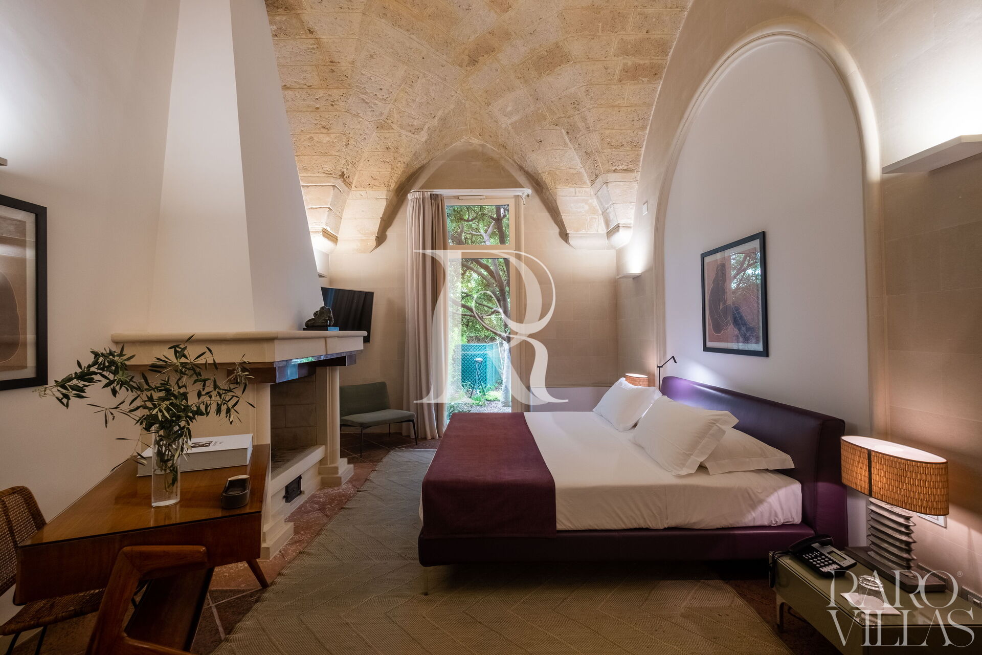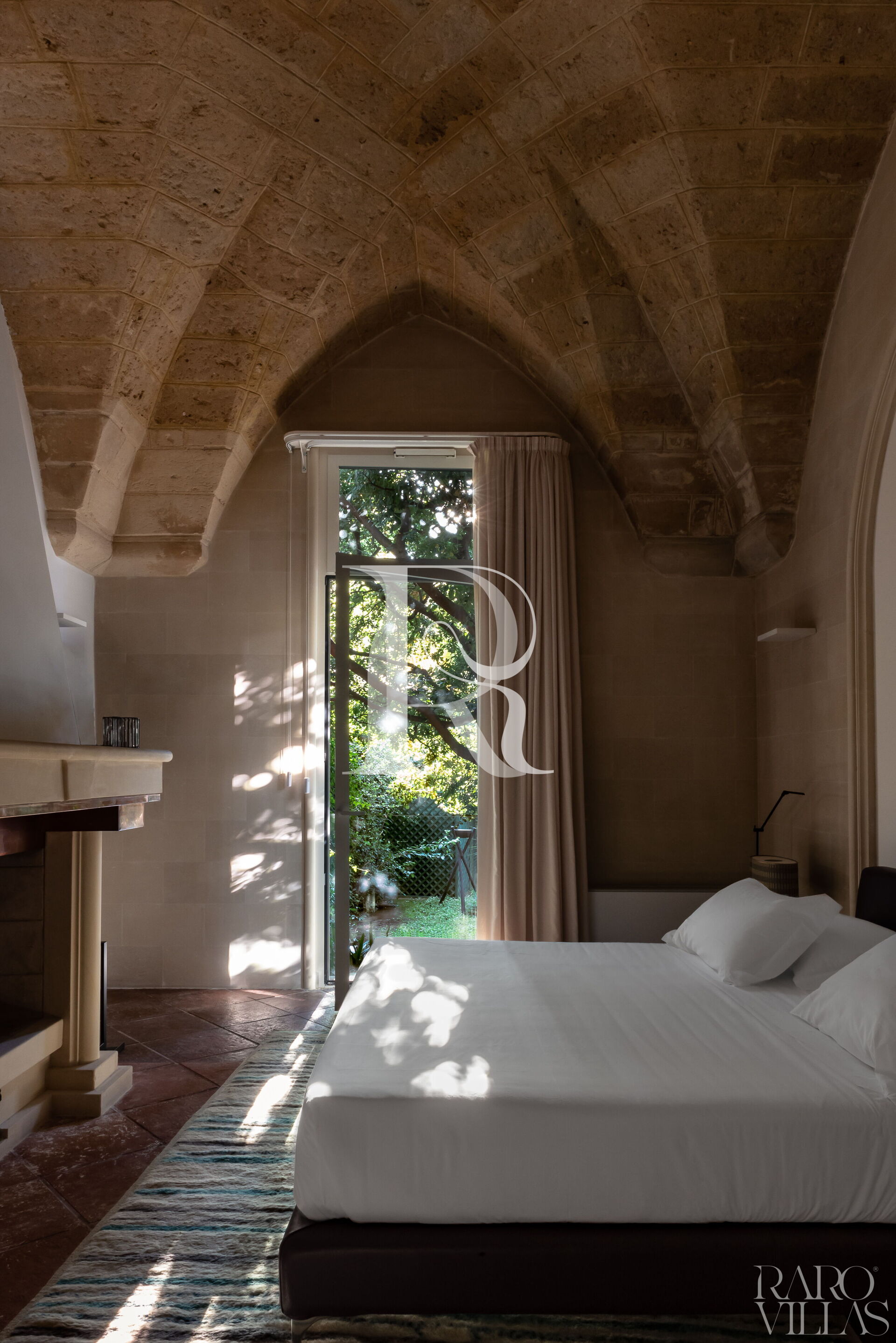 The master bedroom, enriched with a charming original fireplace, creates a romantic atmosphere.
