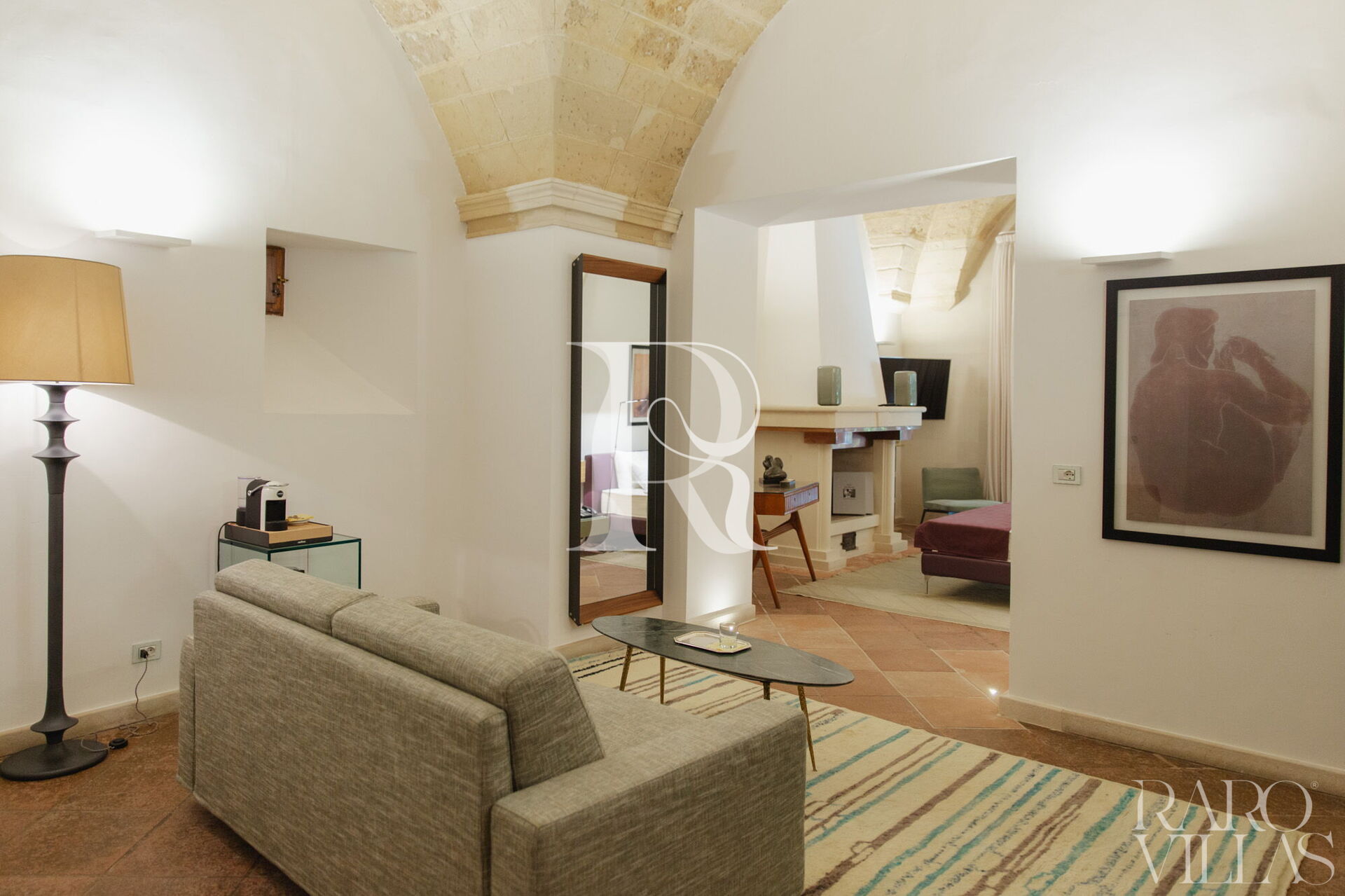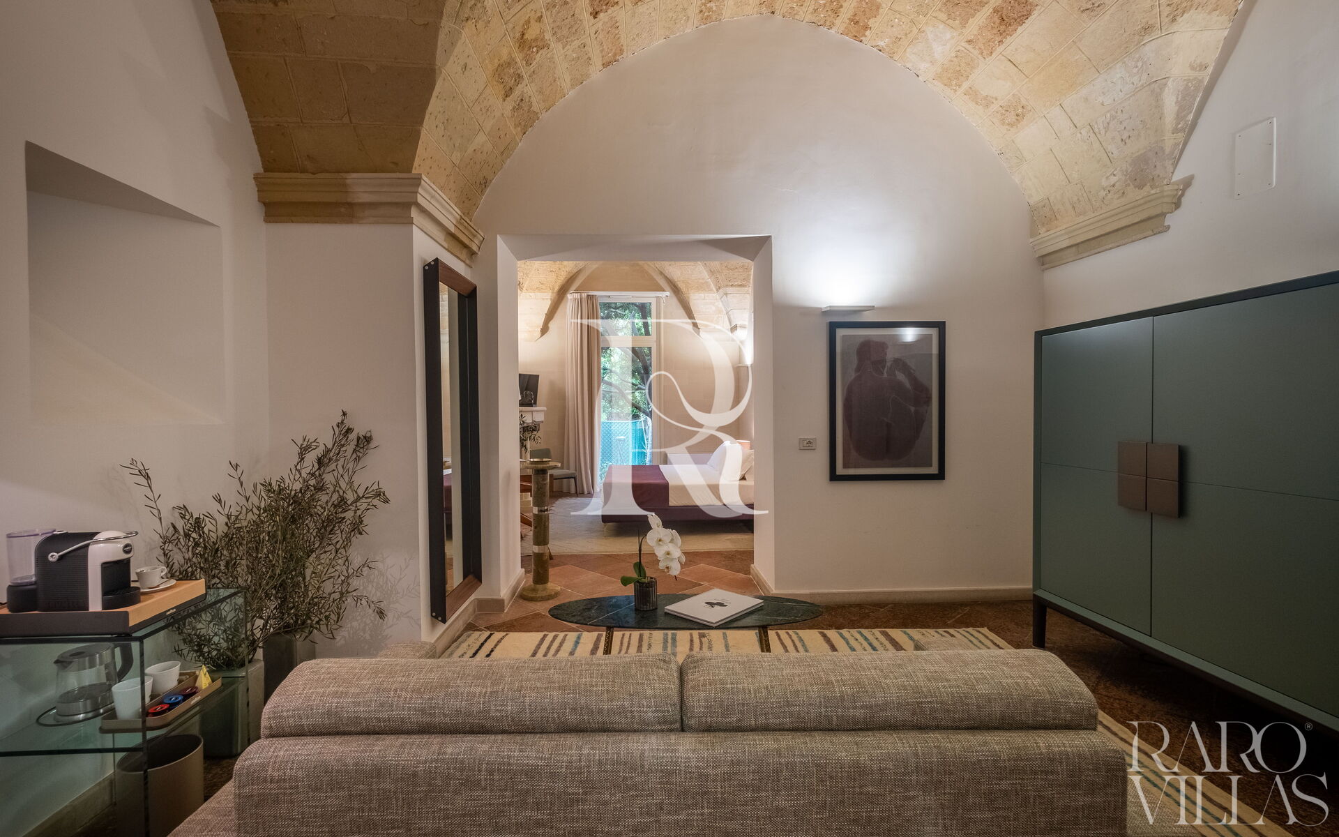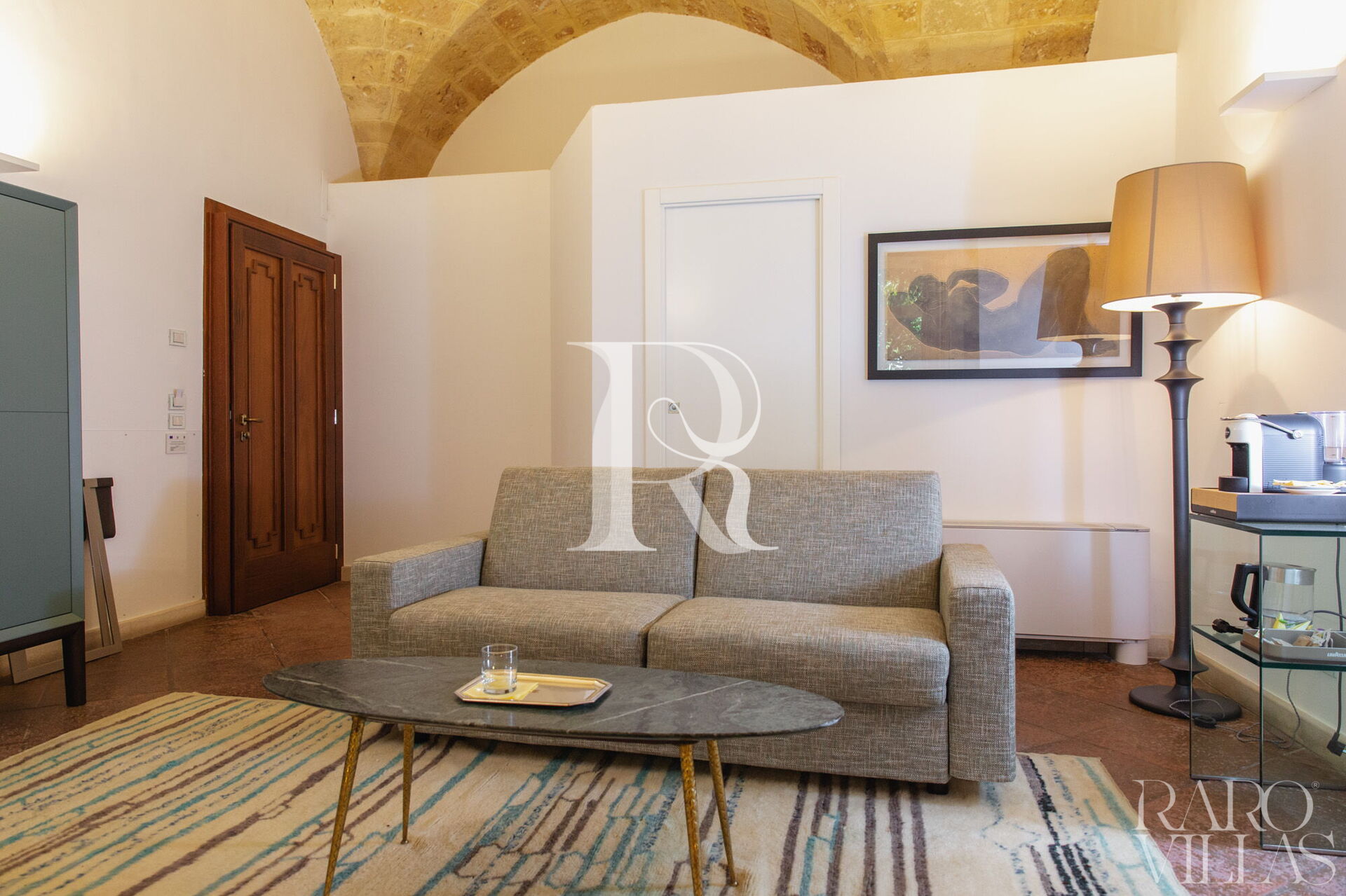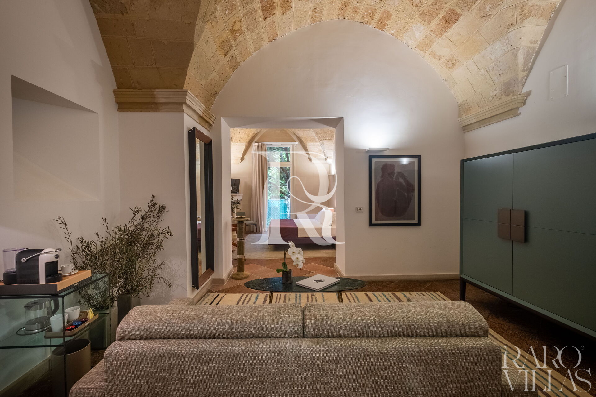 The living room, with a sophisticated sofa bed, welcomes one or two extra guests for a complete stay experience.