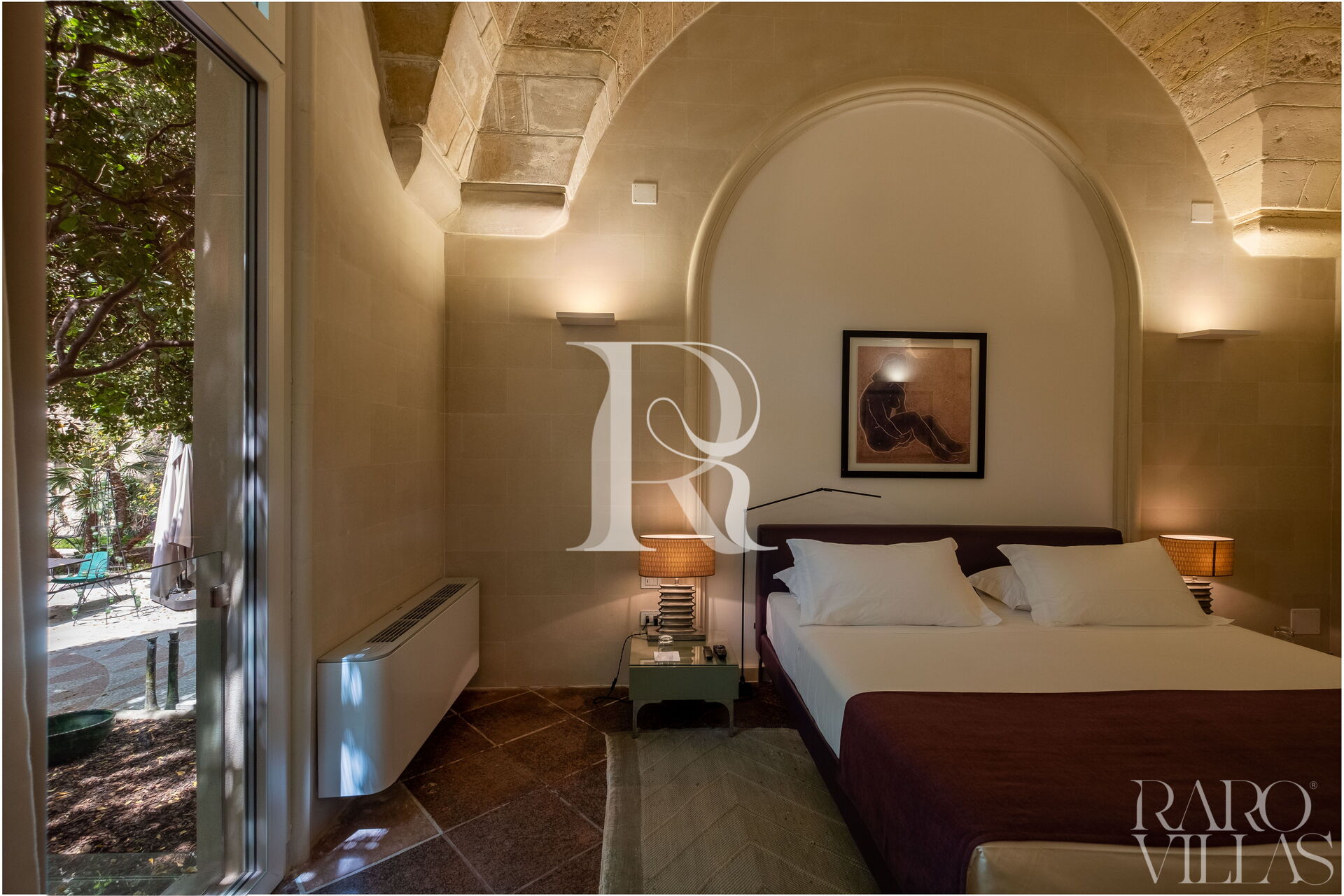 Bedroom (50 m2): air conditioning, fireplace, safe, fridge, internet WIFI, double bed, armchair, television, exit to the garden.