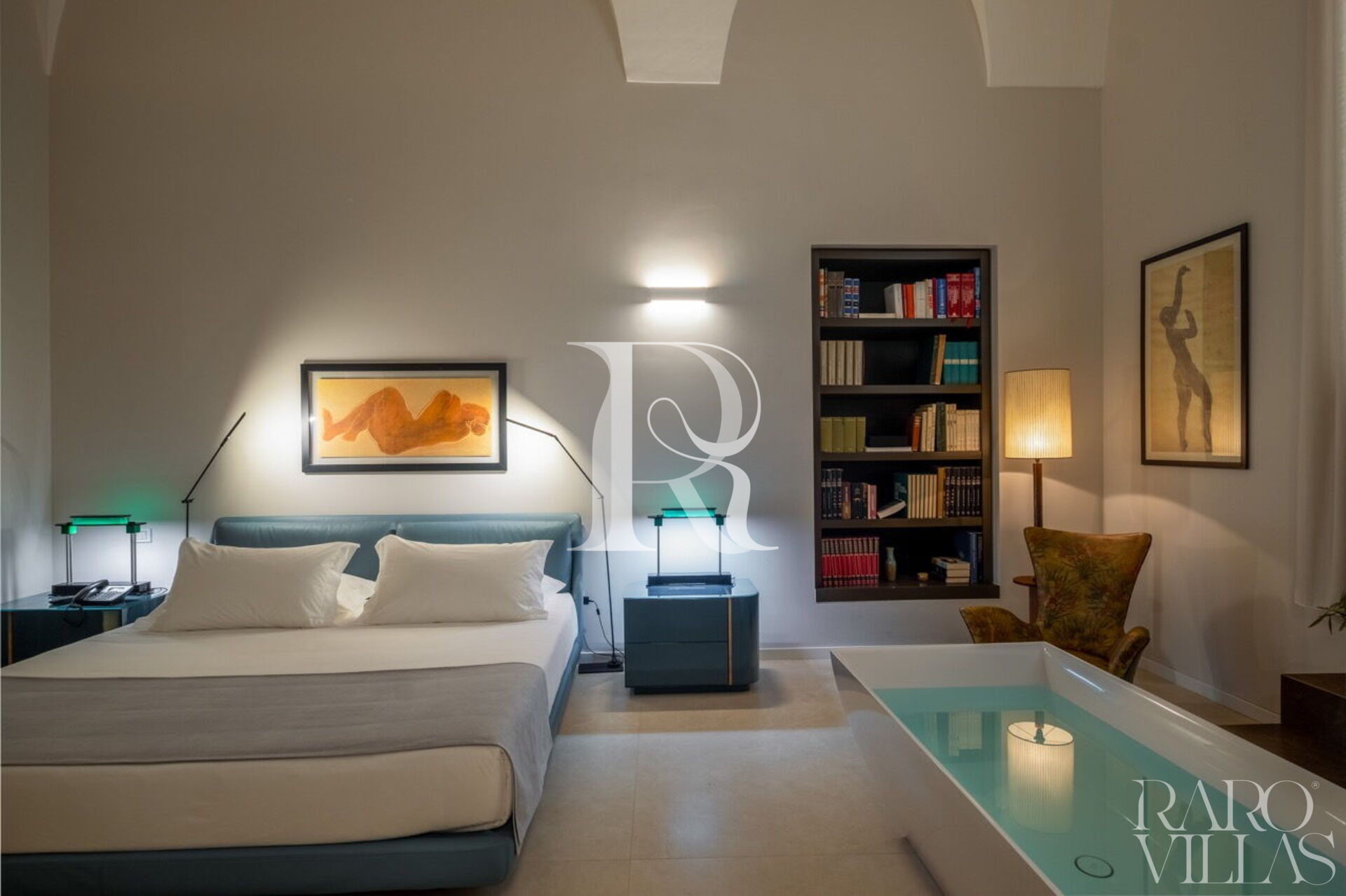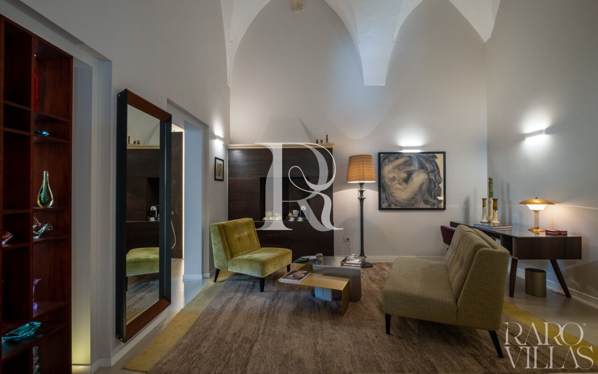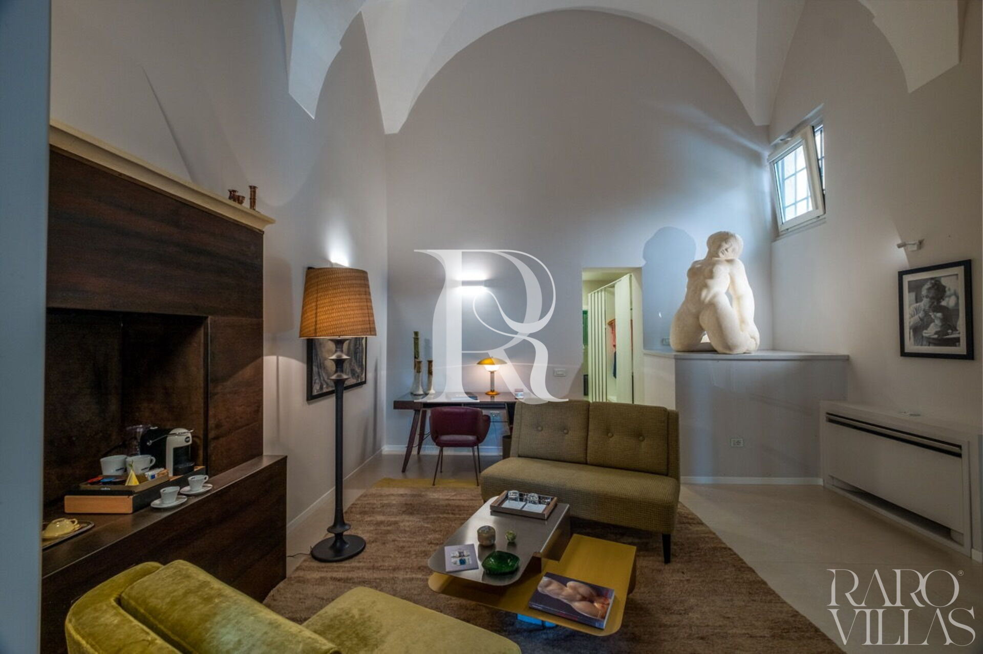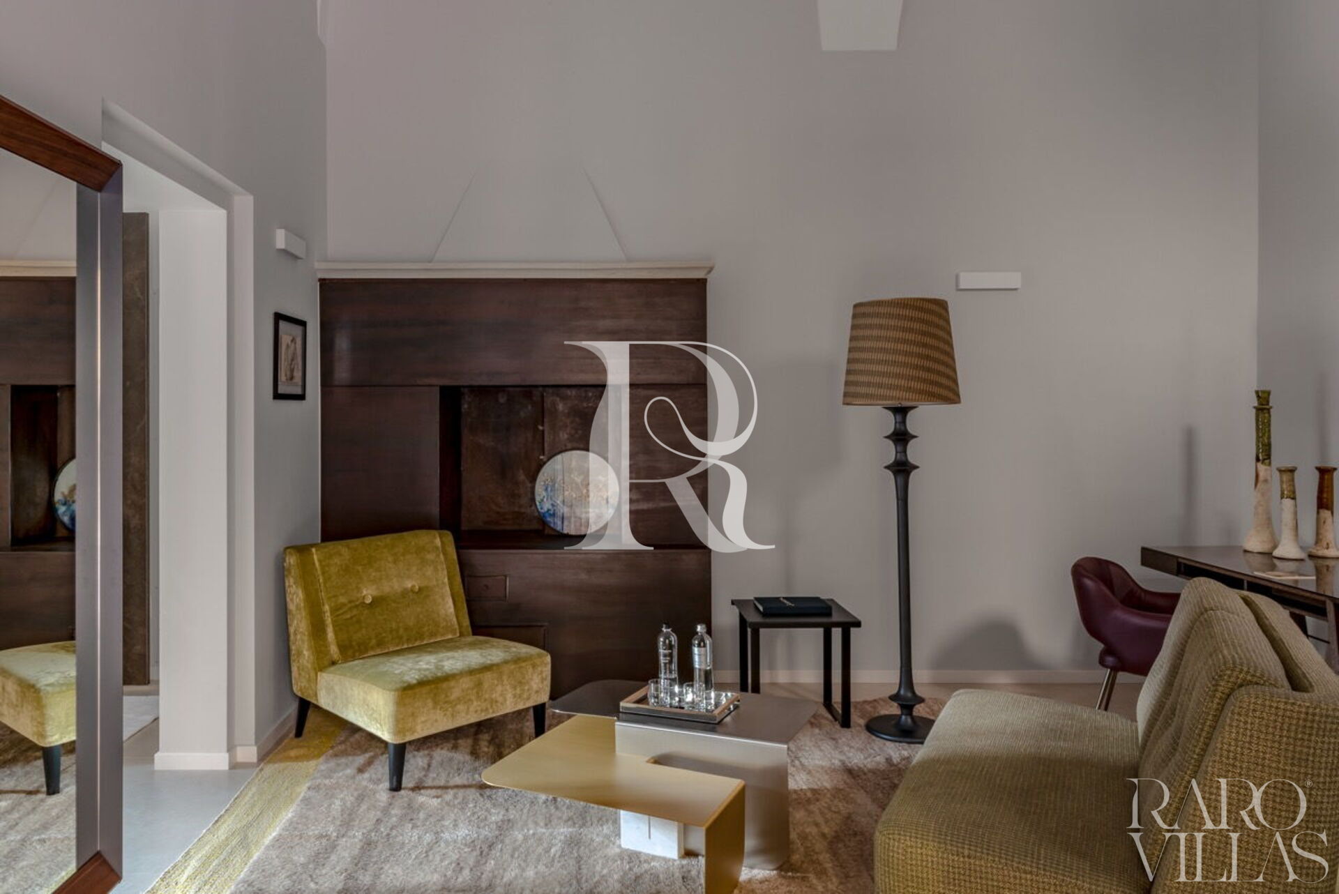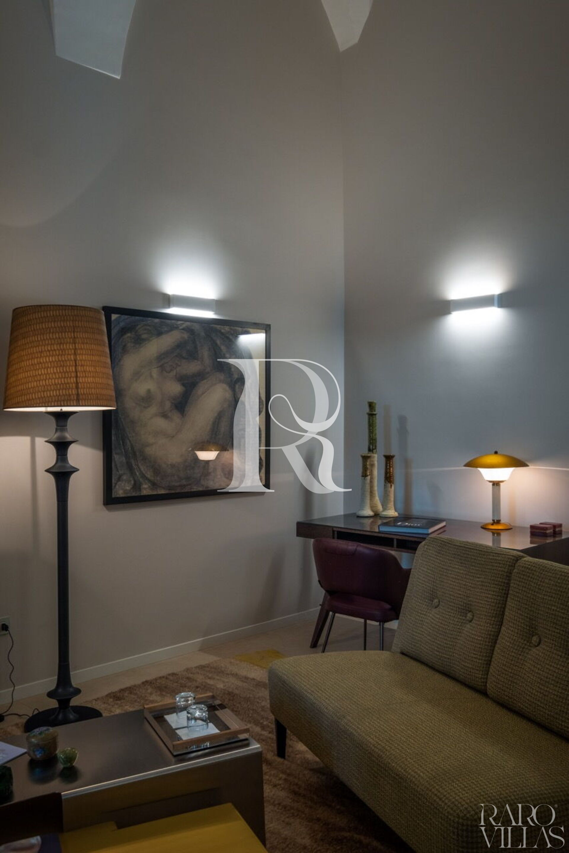 The separate lounge, equipped with a charming period fireplace, offers a cozy space for relaxation and socializing. Here, guests can enjoy moments of tranquility or entertain friends and family in an exclusive and enveloping atmosphere.