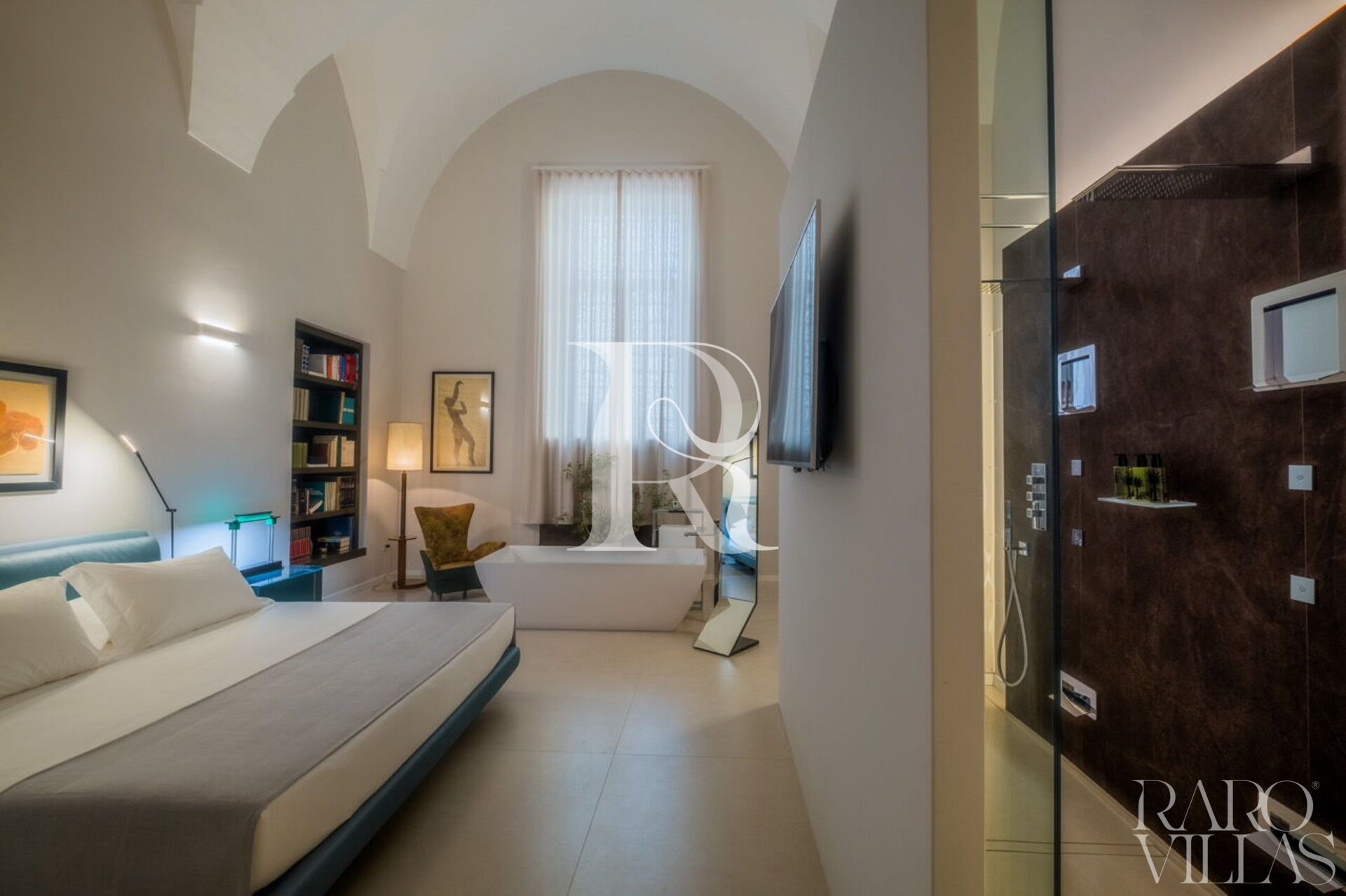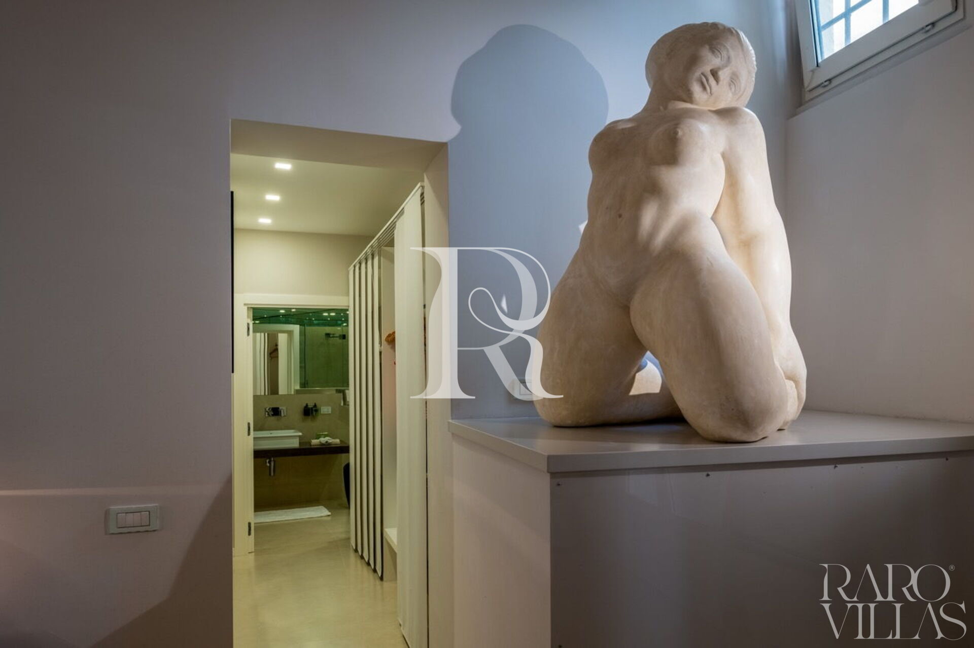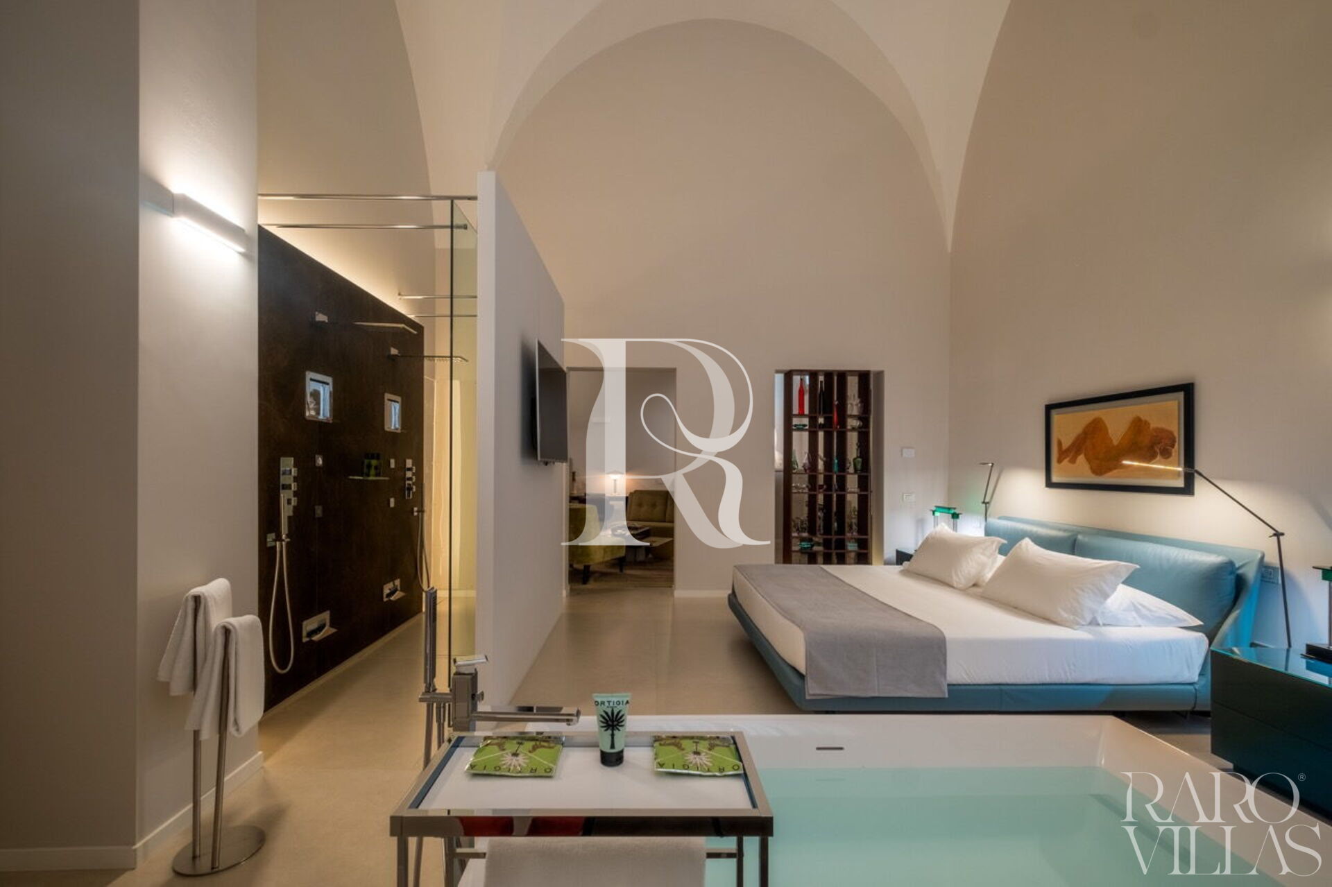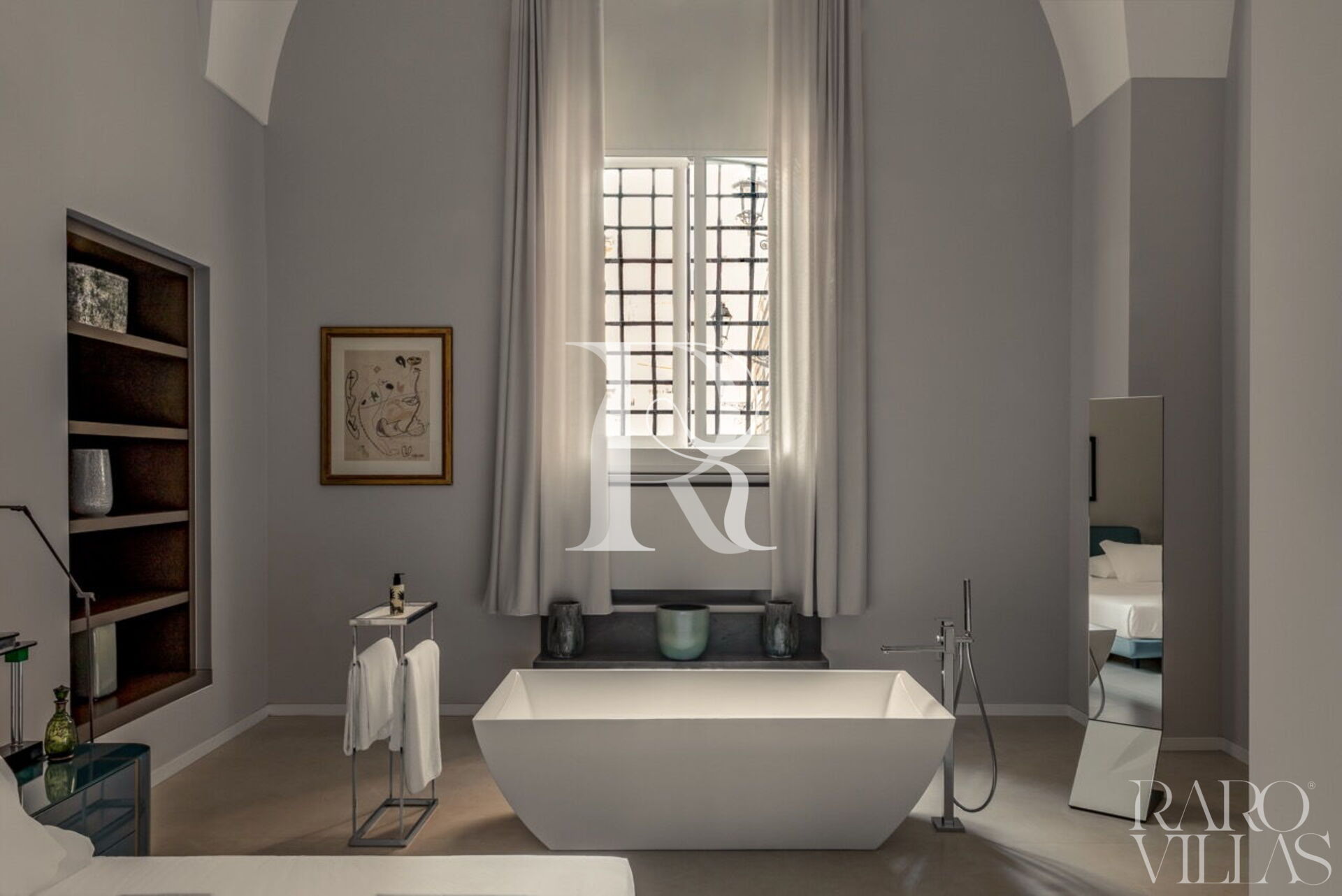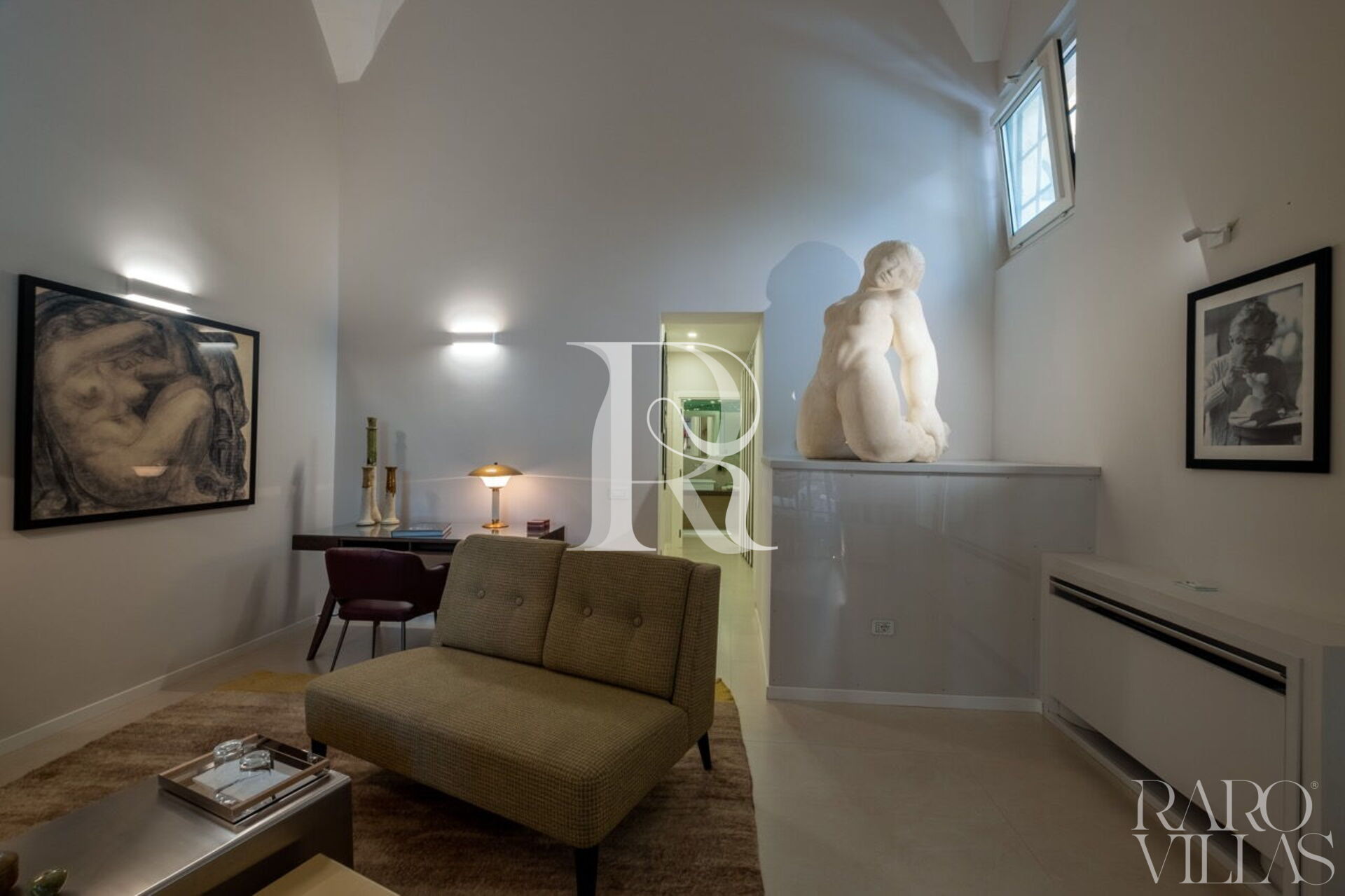 The separate lounge, equipped with a charming period fireplace, offers a cozy space for relaxation and socializing. Here, guests can enjoy moments of tranquility or entertain friends and family in an exclusive and enveloping atmosphere.