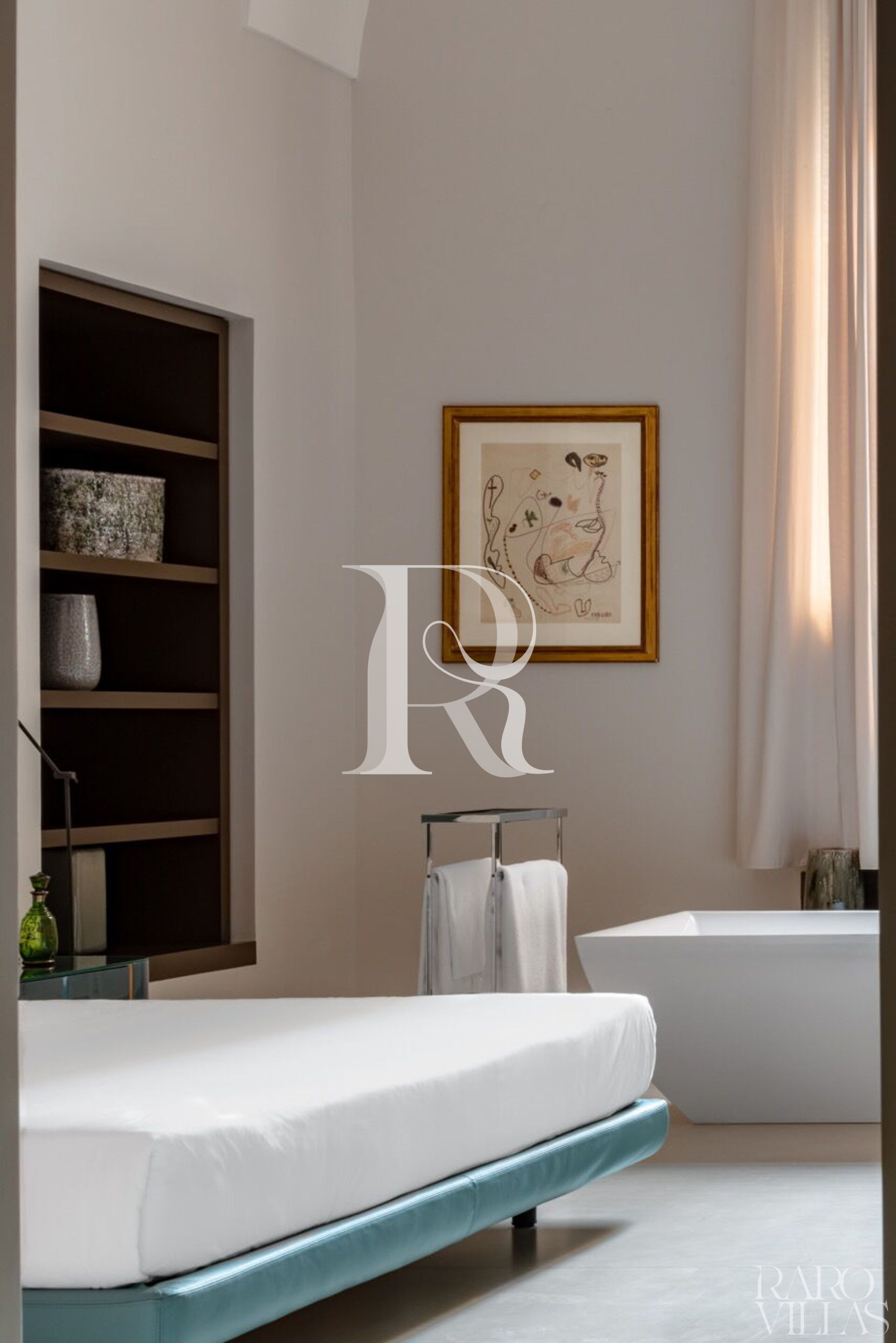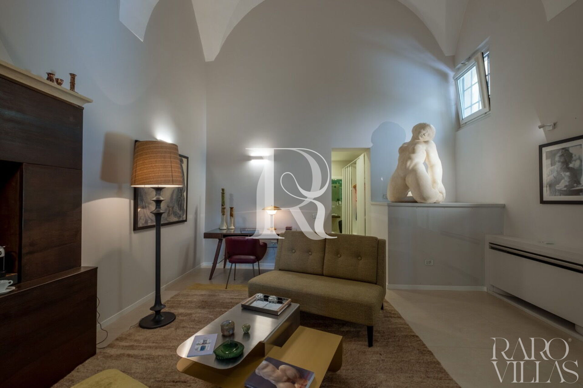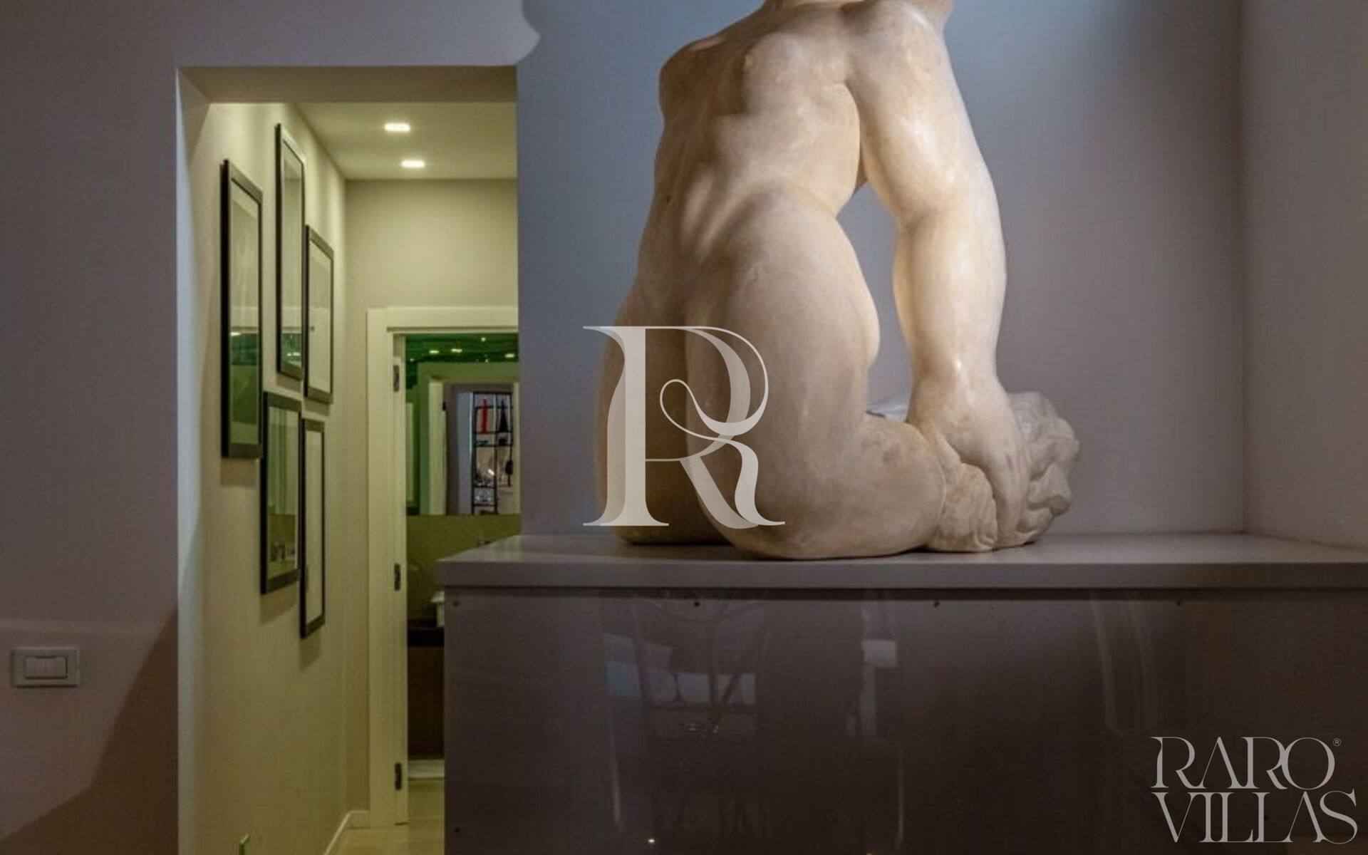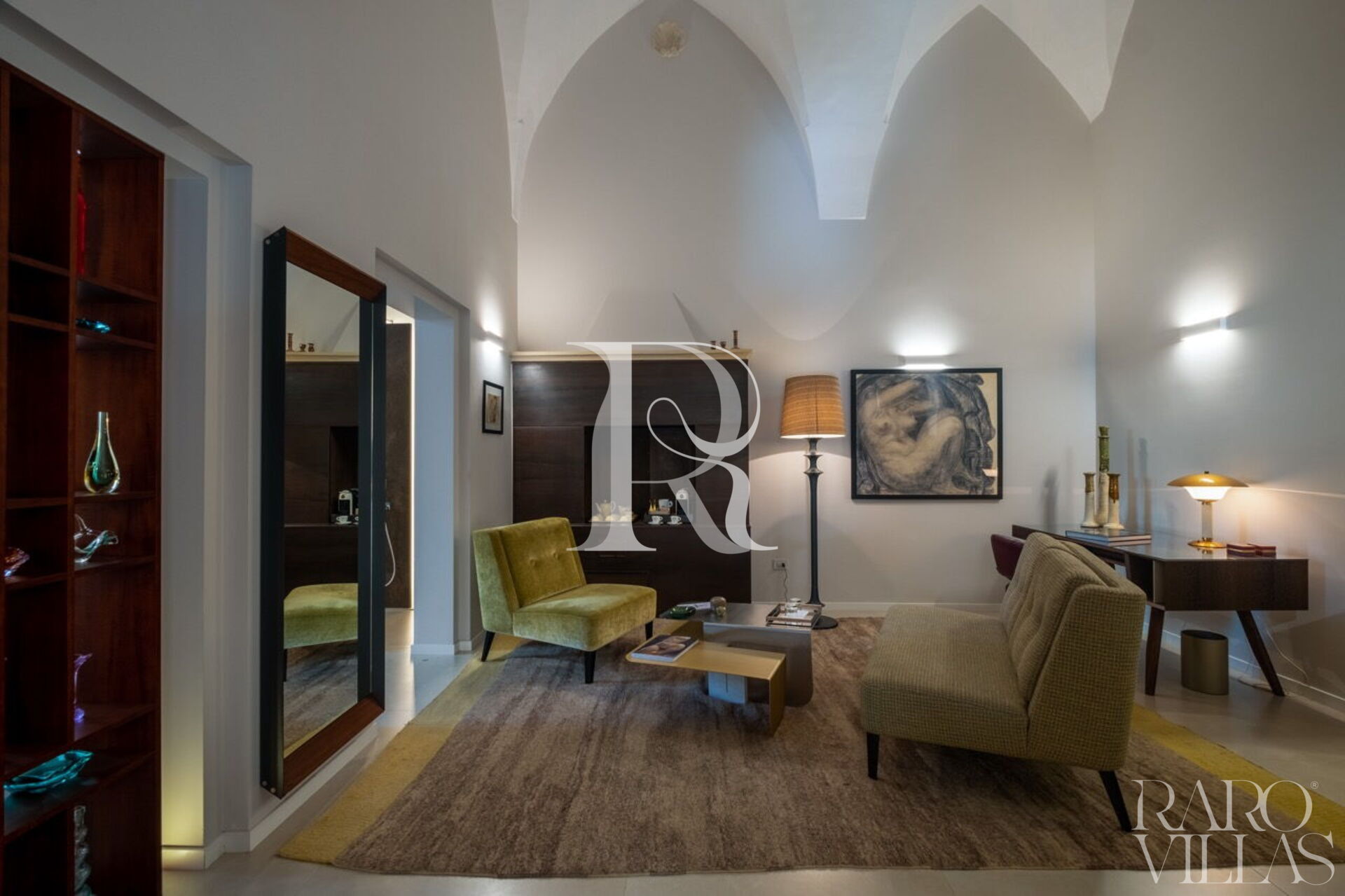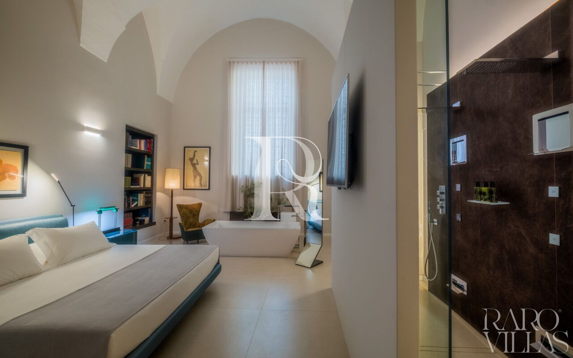 The separate lounge, equipped with a charming period fireplace, offers a cozy space for relaxation and socializing. Here, guests can enjoy moments of tranquility or entertain friends and family in an exclusive and enveloping atmosphere.
