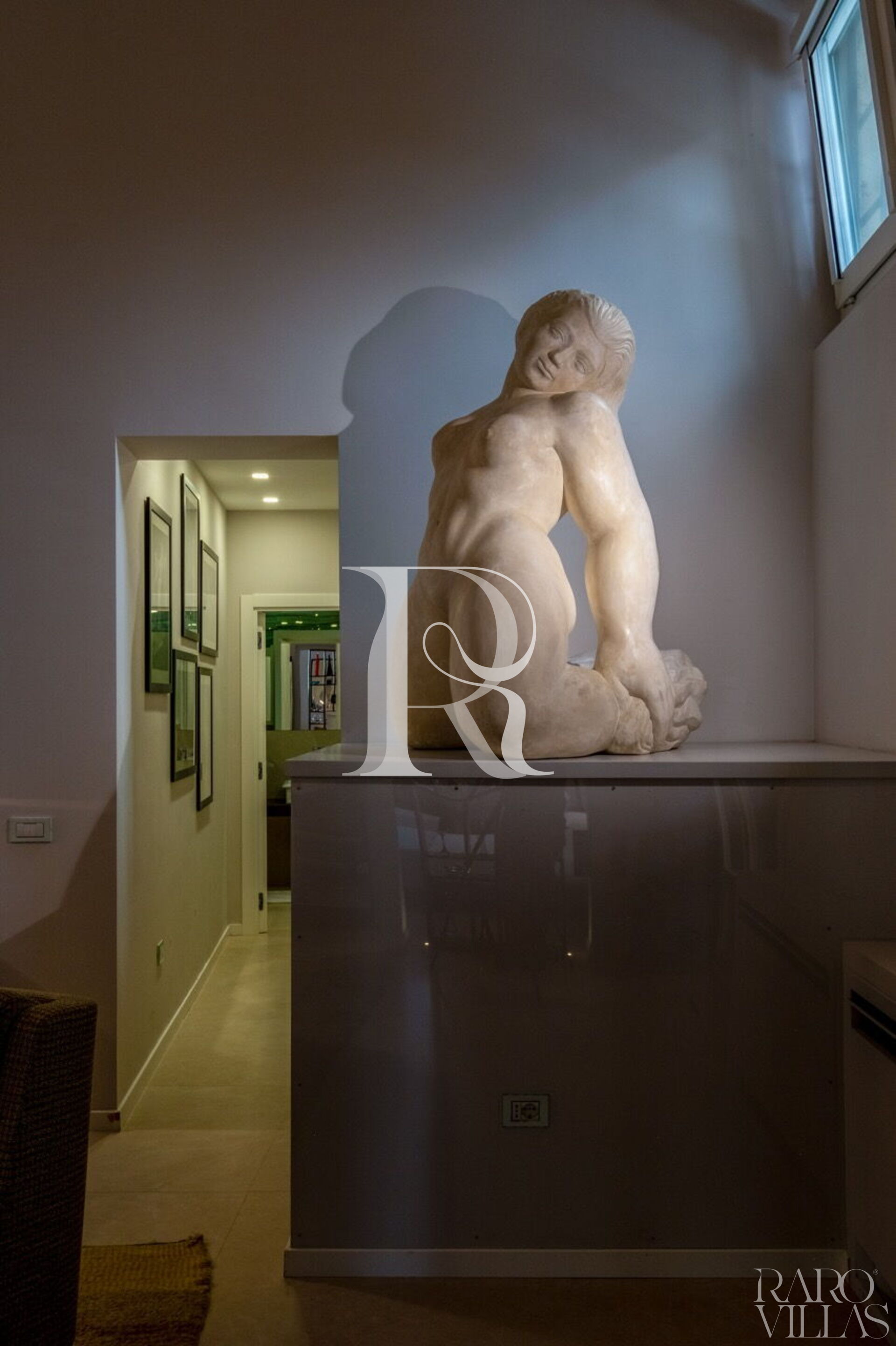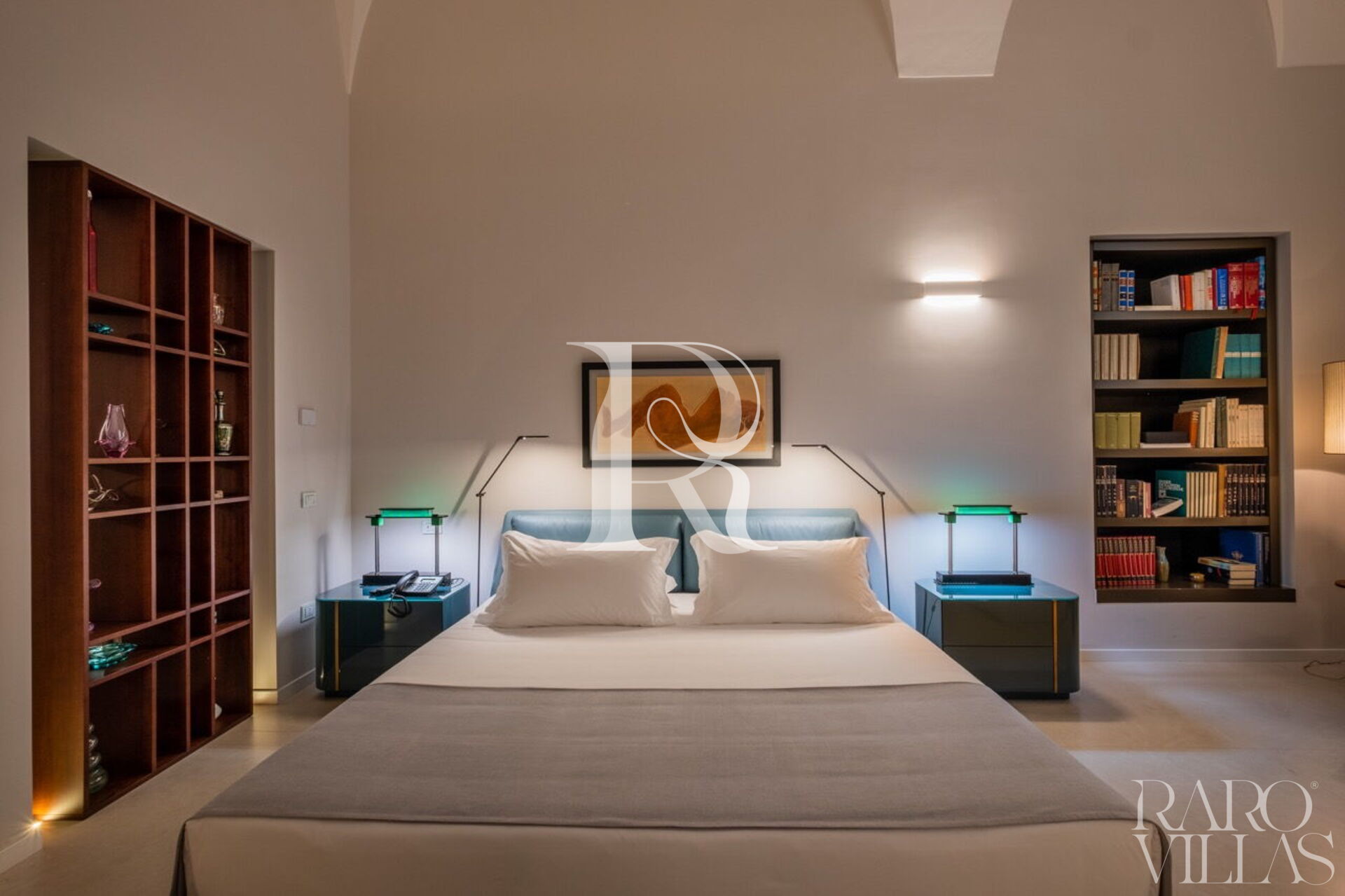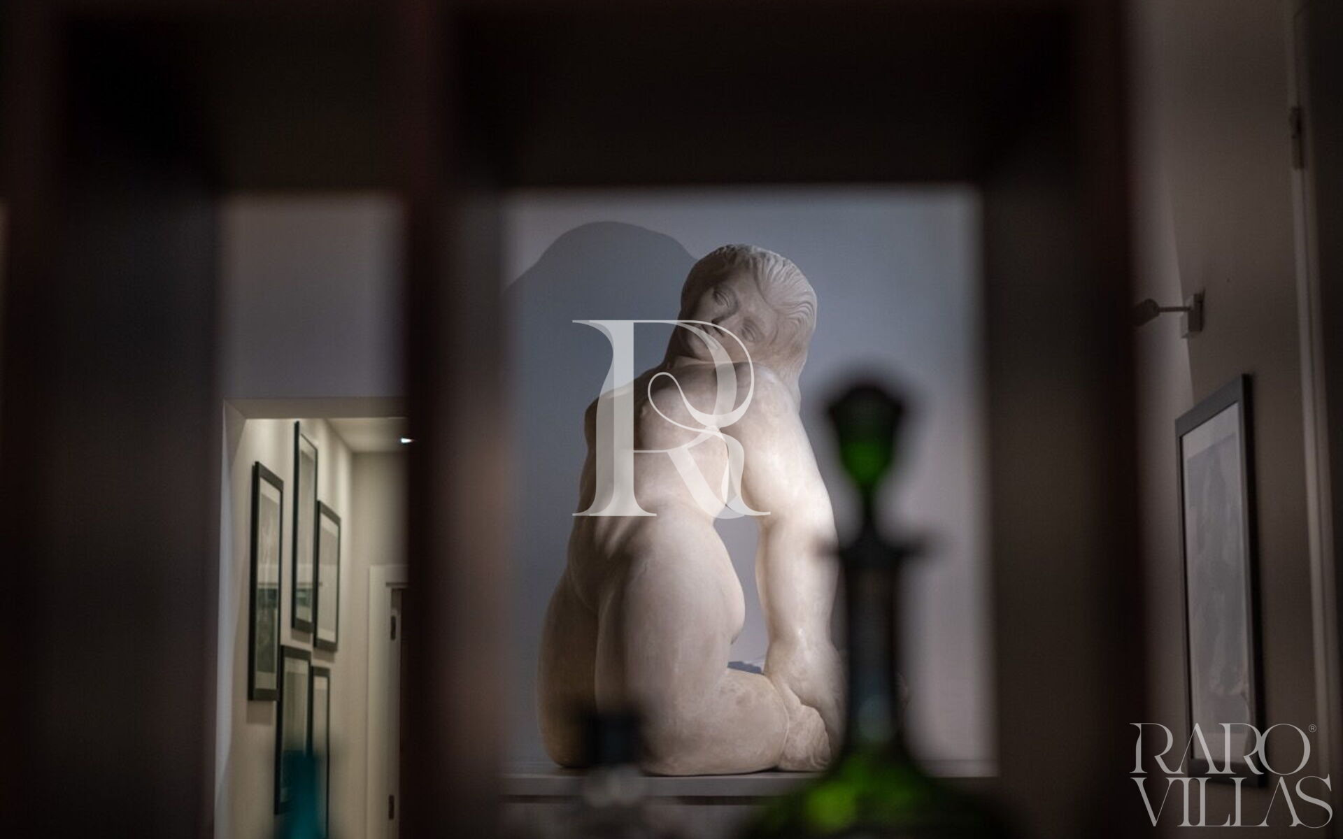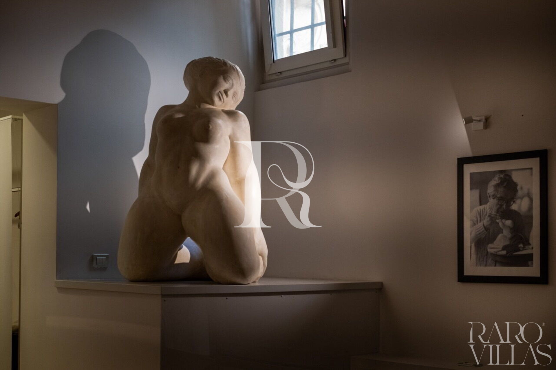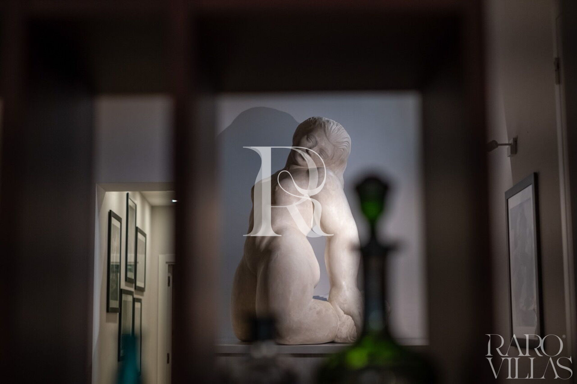 The separate lounge, equipped with a charming period fireplace, offers a cozy space for relaxation and socializing. Here, guests can enjoy moments of tranquility or entertain friends and family in an exclusive and enveloping atmosphere.