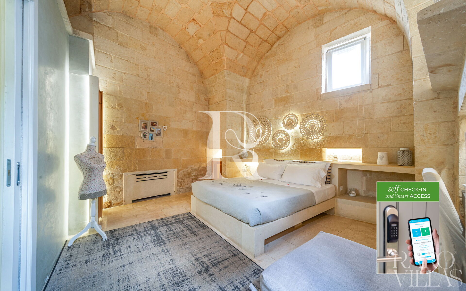 The Meridiano room, made with the processing and treatment of Lecce stone, has strong references to the classic rose windows of Apulian churches both in the living and sleeping areas, with design elements that capture attention, and in the bathroom area. The furnishings are simple and refined, essential and comfortable, suitable for couples looking for a relaxing stay.