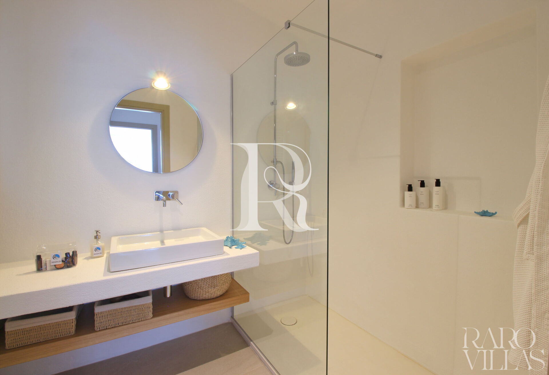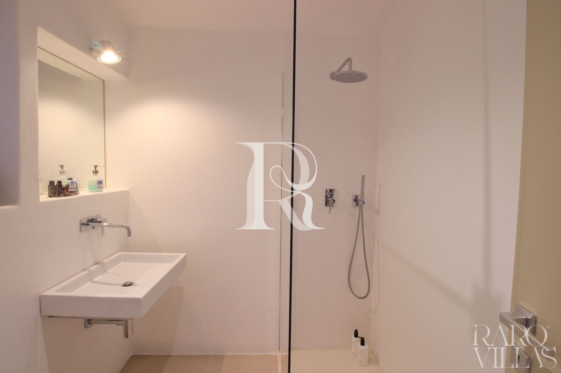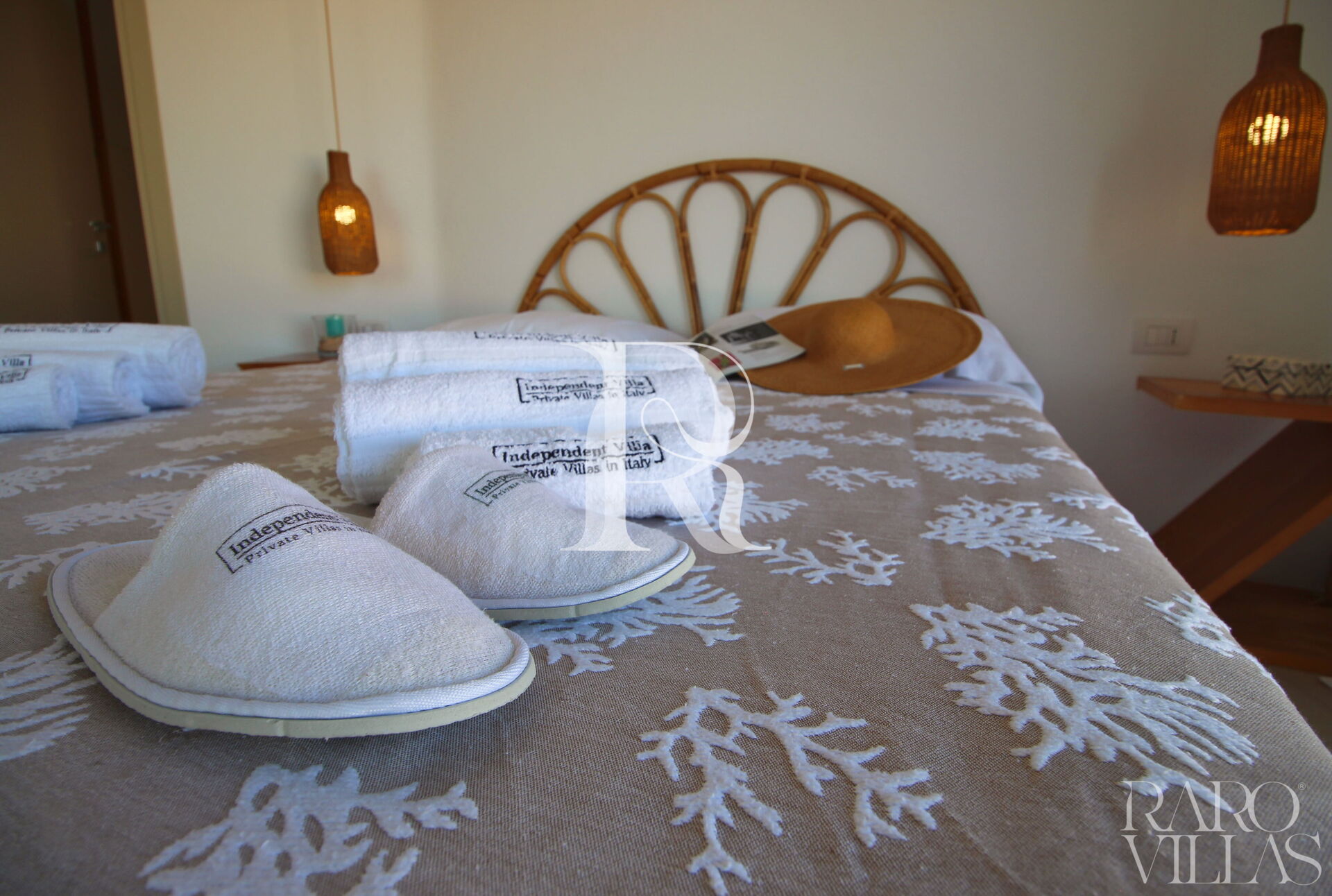 The sleeping area includes a double bedroom with private entrance, sea view, working fireplace, walk-in closet and ensuite bathroom with shower. There is a double bedroom with sea view and a bedroom with three single beds in masonry that share a bathroom, also equipped with shower. The last room can be configured as either double or twin beds, offers a breathtaking view of the sea and has an ensuite bathroom with shower.
