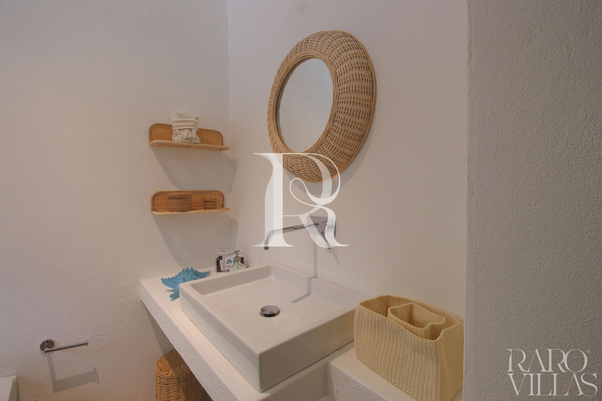 The interior has a bright living room overlooking the sea, elegantly furnished and a traditional working fireplace. The kitchen, separated by a retractable sliding door, is complete with modern equipment and has a spacious pantry. The sleeping area includes double rooms with sea view, walk-in closet and ensuite bathrooms, while a twin bedroom shares a bathroom. The basement, accessible by external stairs, houses a cellar, laundry area and water cisterns.