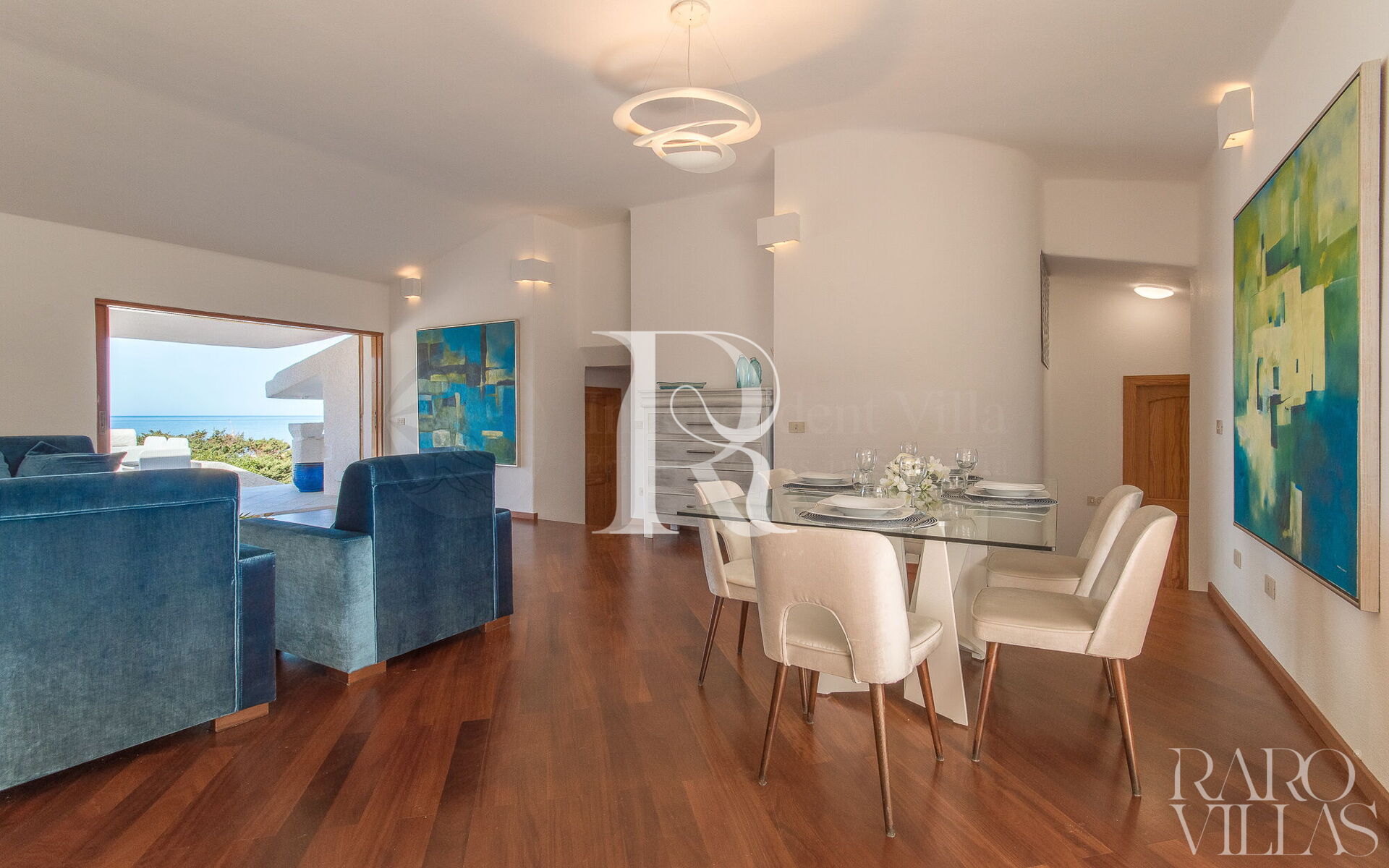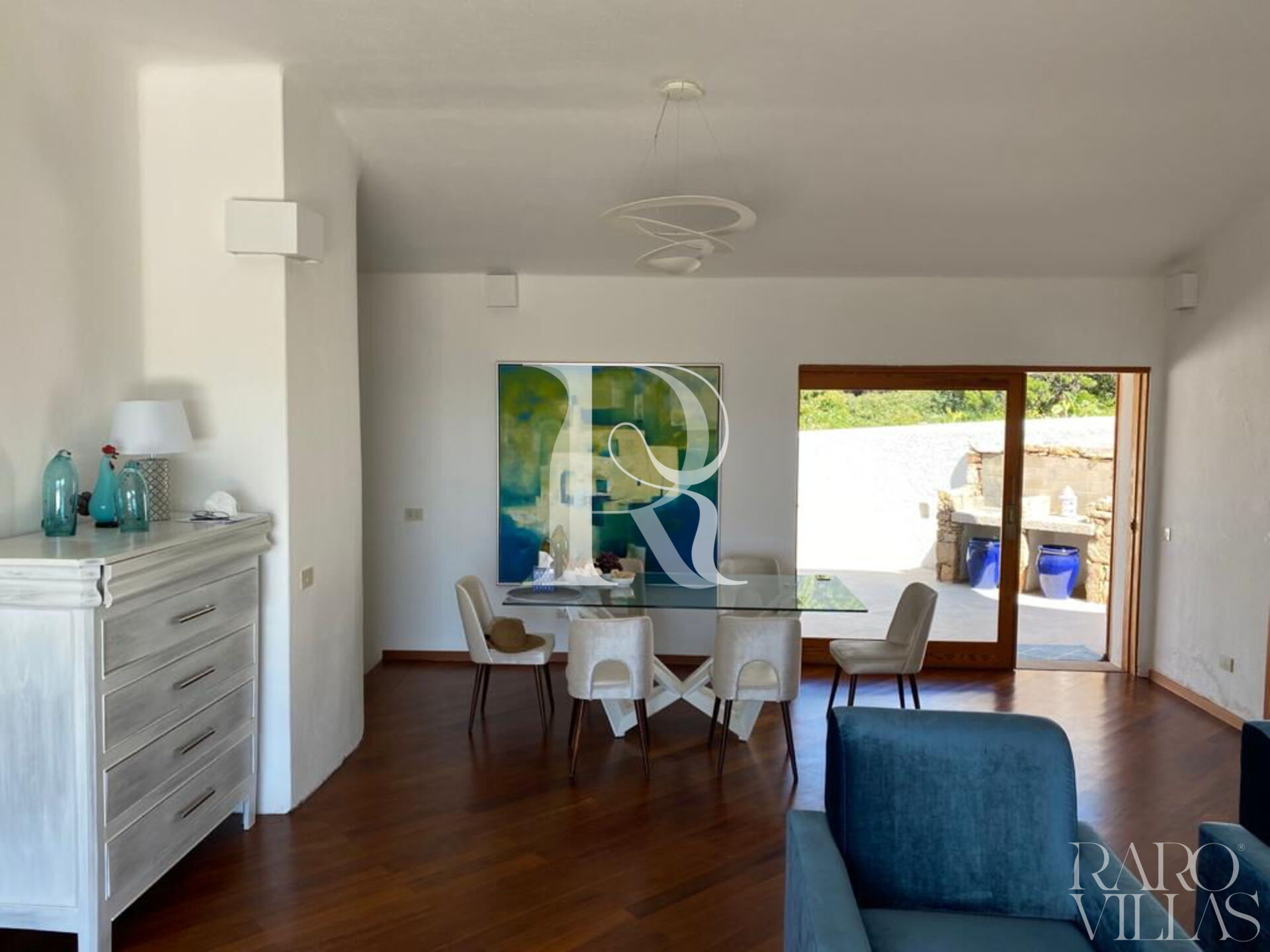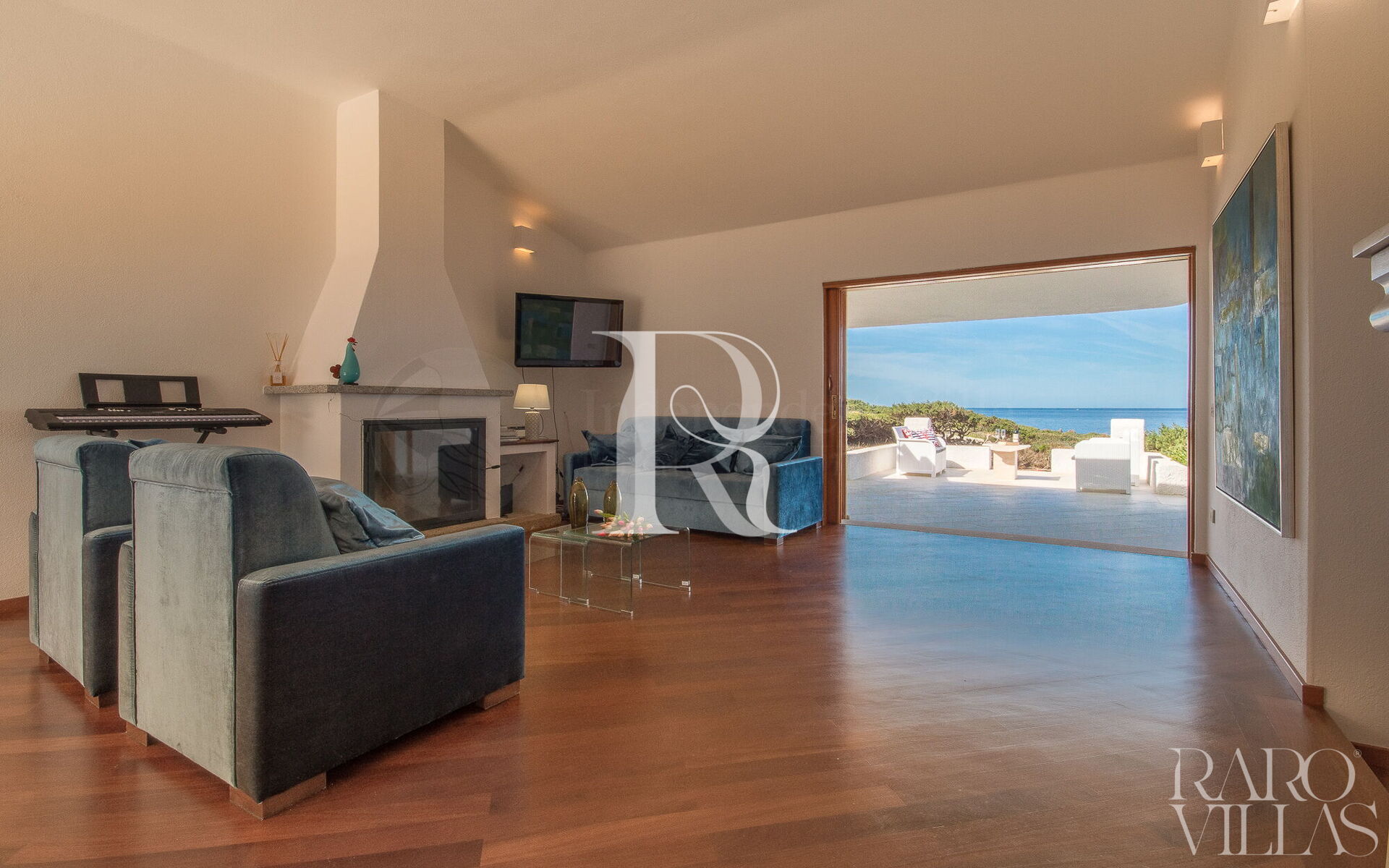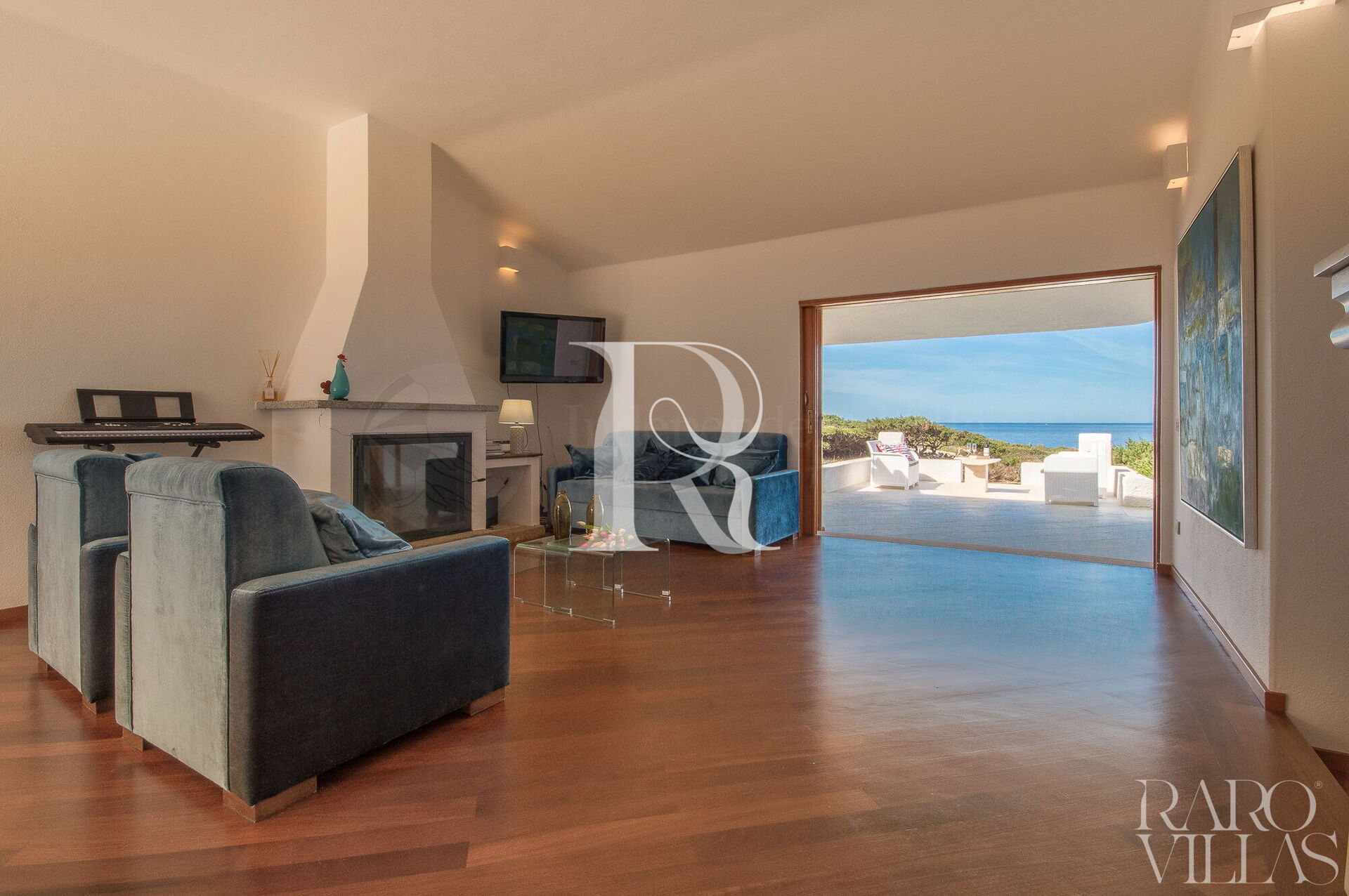 From the patio, guests can either ascend to the rooftop sunbathing area—offering a spectacular panorama stretching from Corsica to Asinara—or step into the spacious double living room, which includes a secondary dining area, a fireplace, and a flat-screen TV. The sea view extends from the living room to the front terrace with an infinity pool, seamlessly blending into the garden.