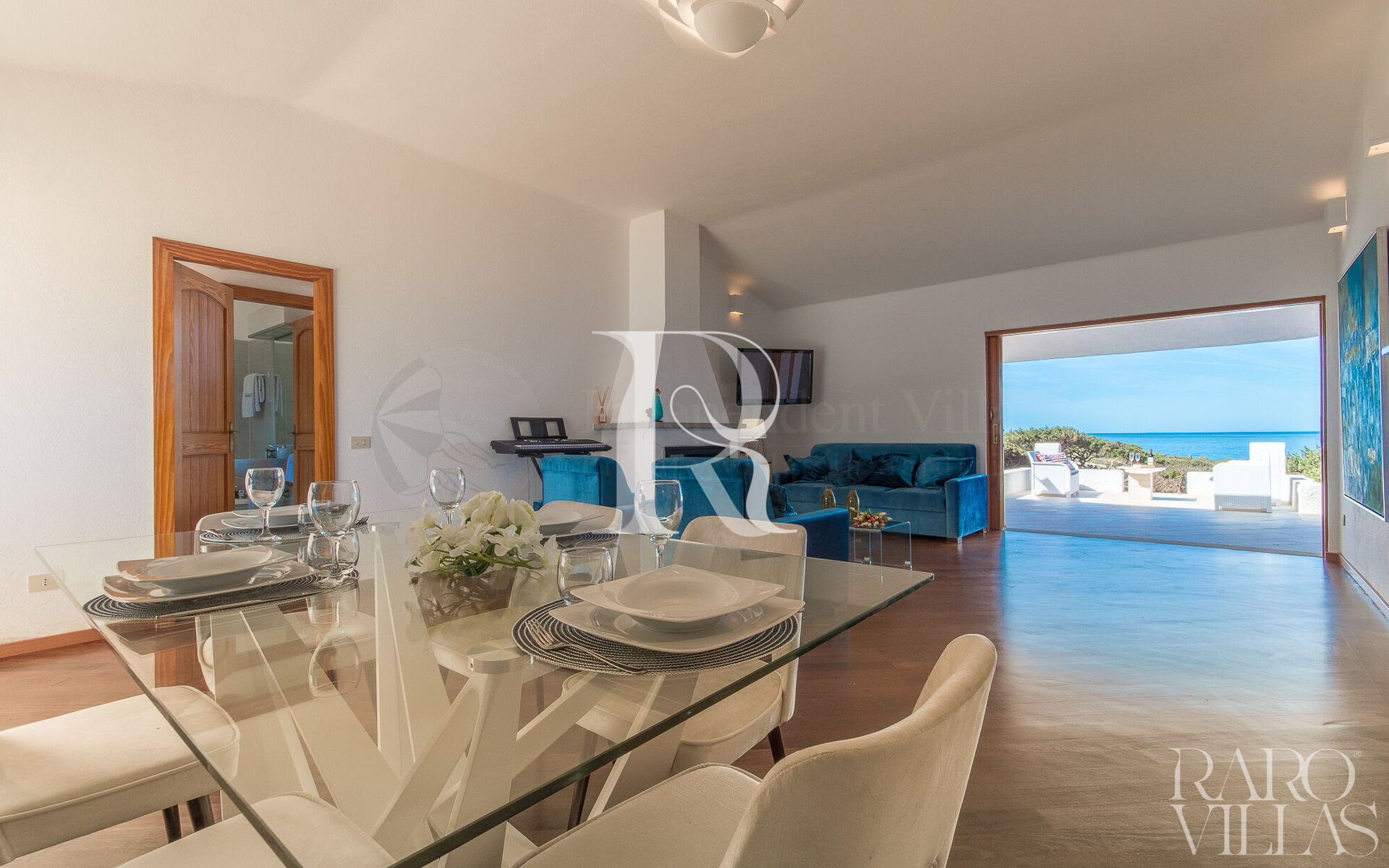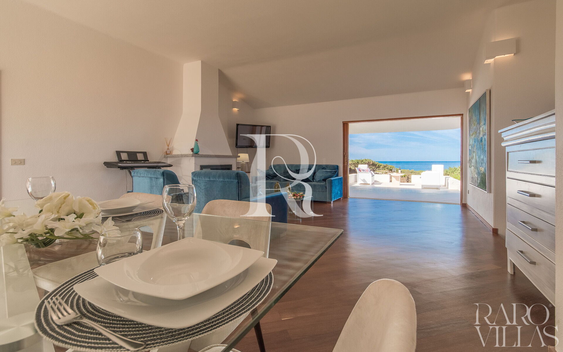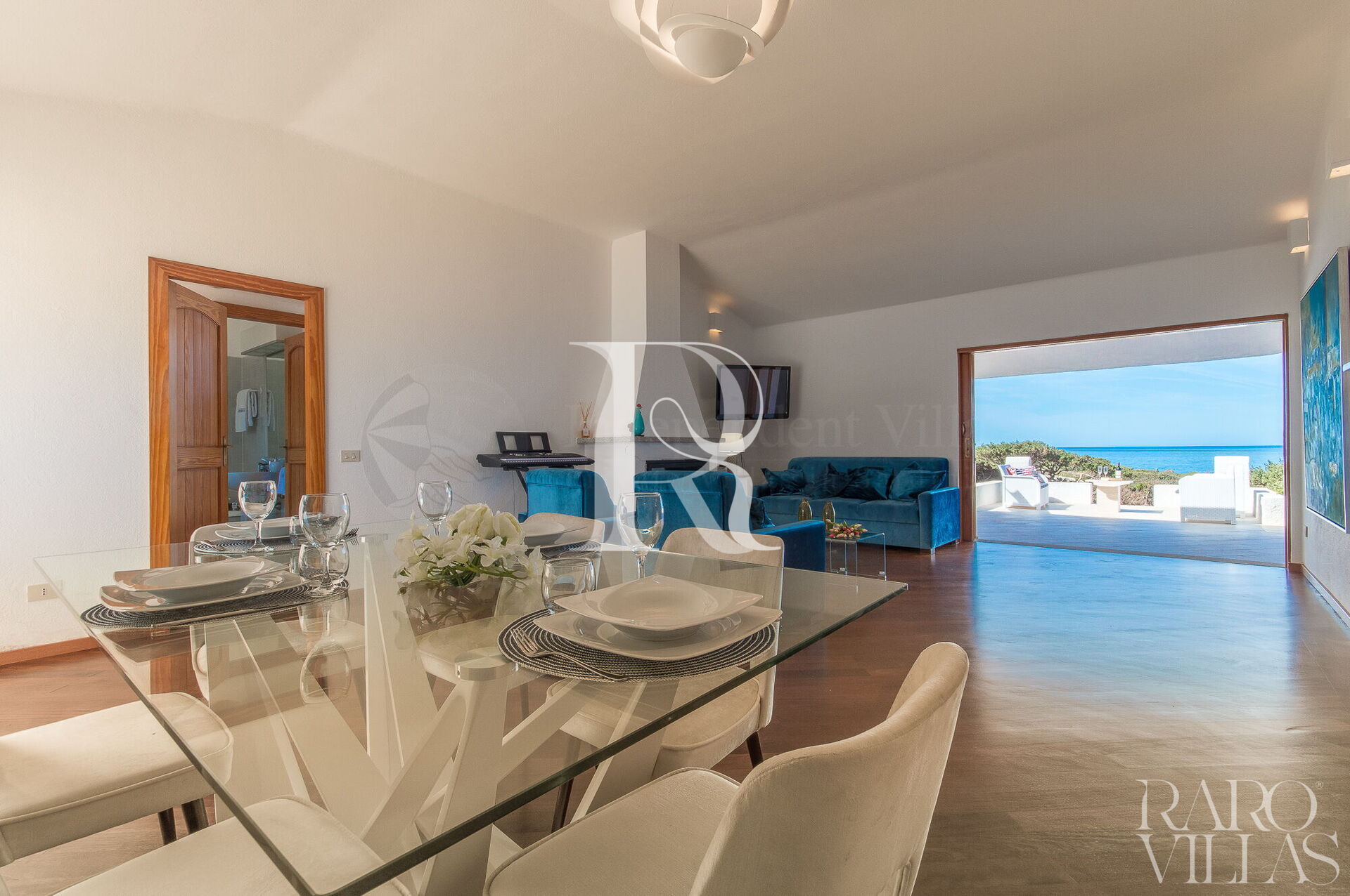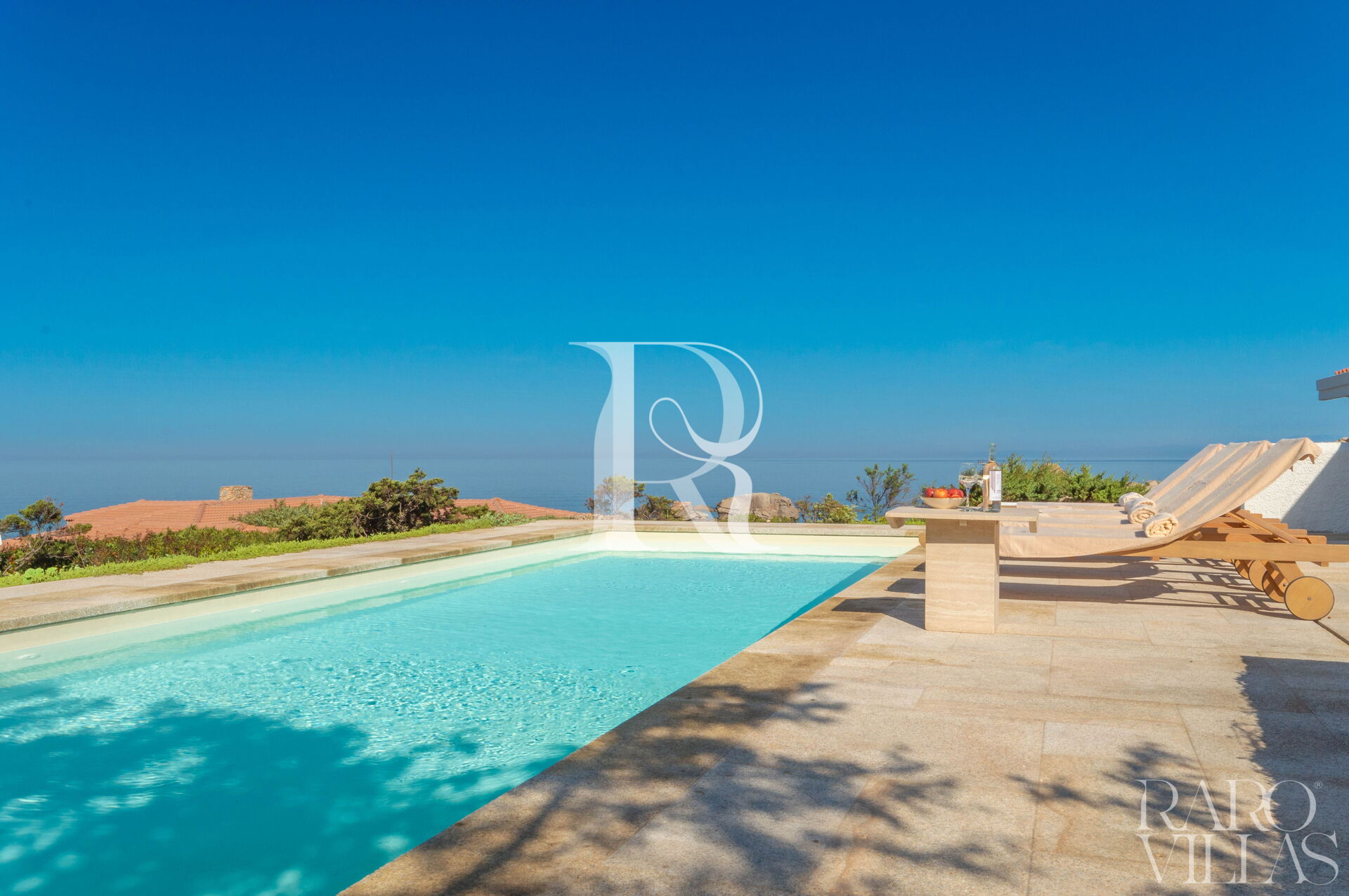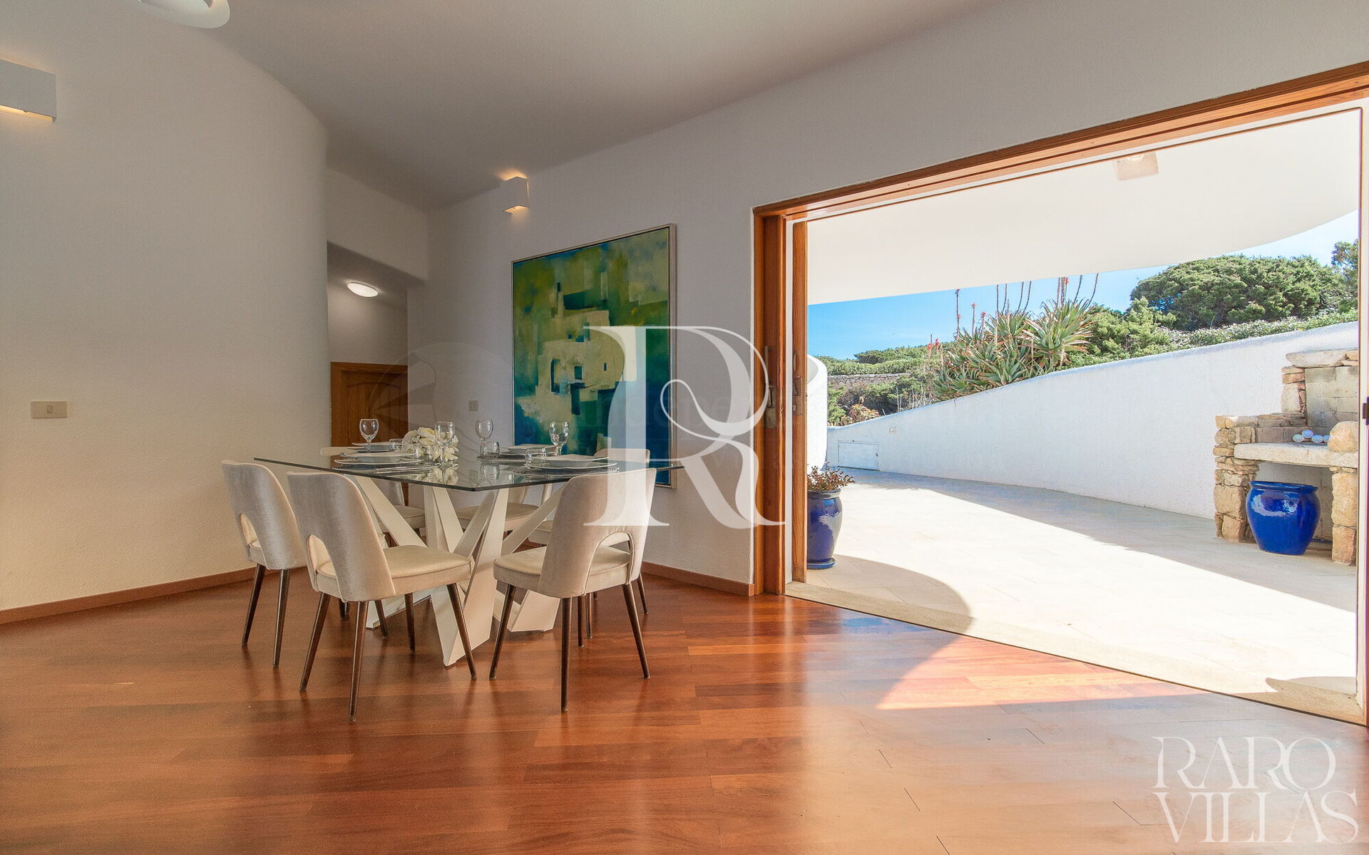 From the patio, guests can either ascend to the rooftop sunbathing area—offering a spectacular panorama stretching from Corsica to Asinara—or step into the spacious double living room, which includes a secondary dining area, a fireplace, and a flat-screen TV. The sea view extends from the living room to the front terrace with an infinity pool, seamlessly blending into the garden.