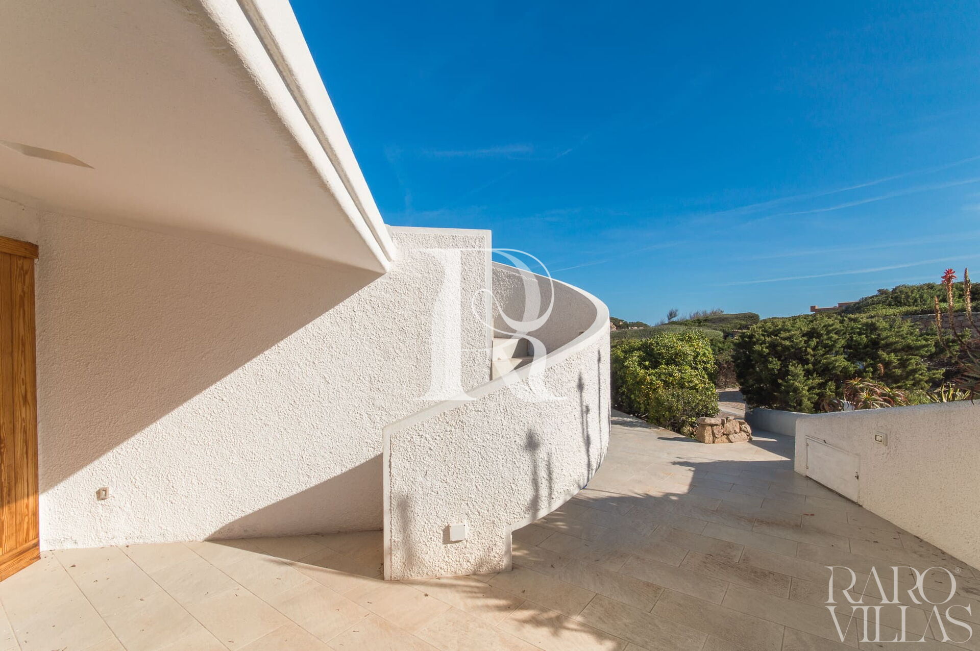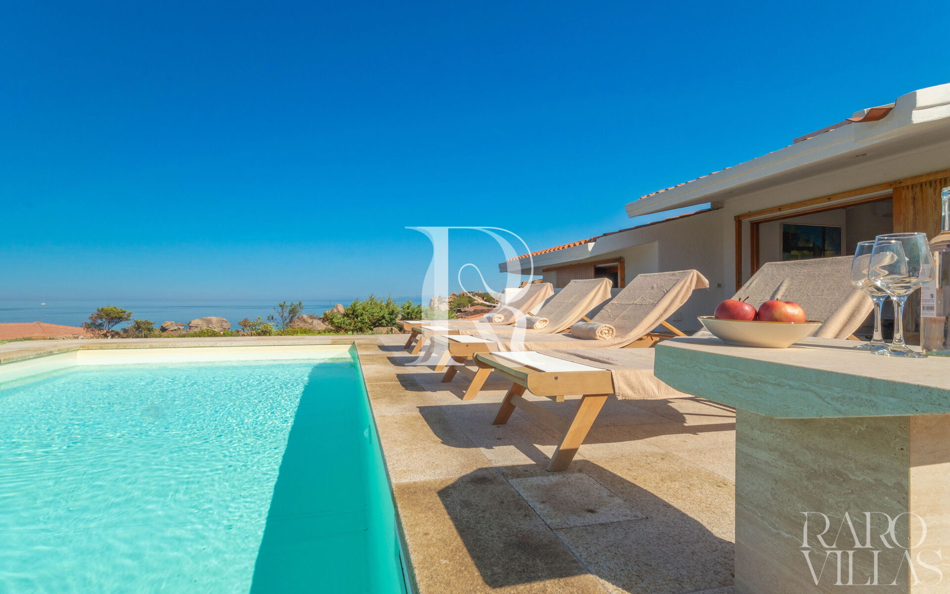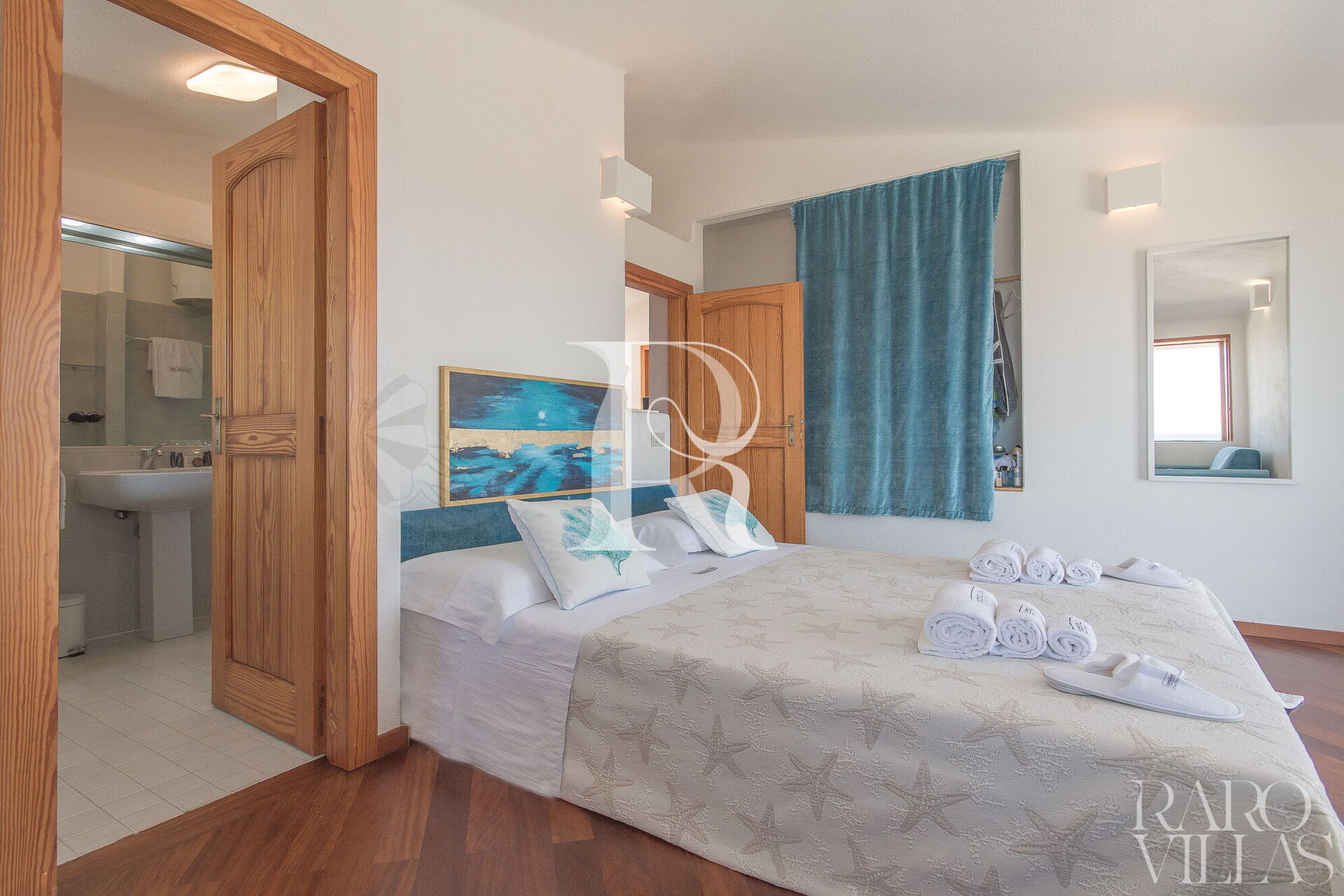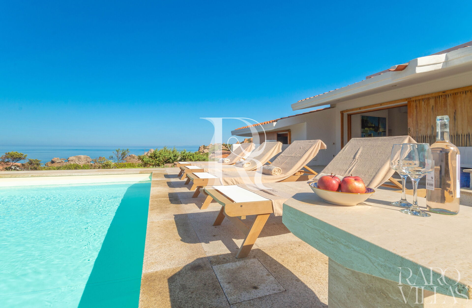From the patio, guests can either ascend to the rooftop sunbathing area—offering a spectacular panorama stretching from Corsica to Asinara—or step into the spacious double living room, which includes a secondary dining area, a fireplace, and a flat-screen TV. The sea view extends from the living room to the front terrace with an infinity pool, seamlessly blending into the garden.