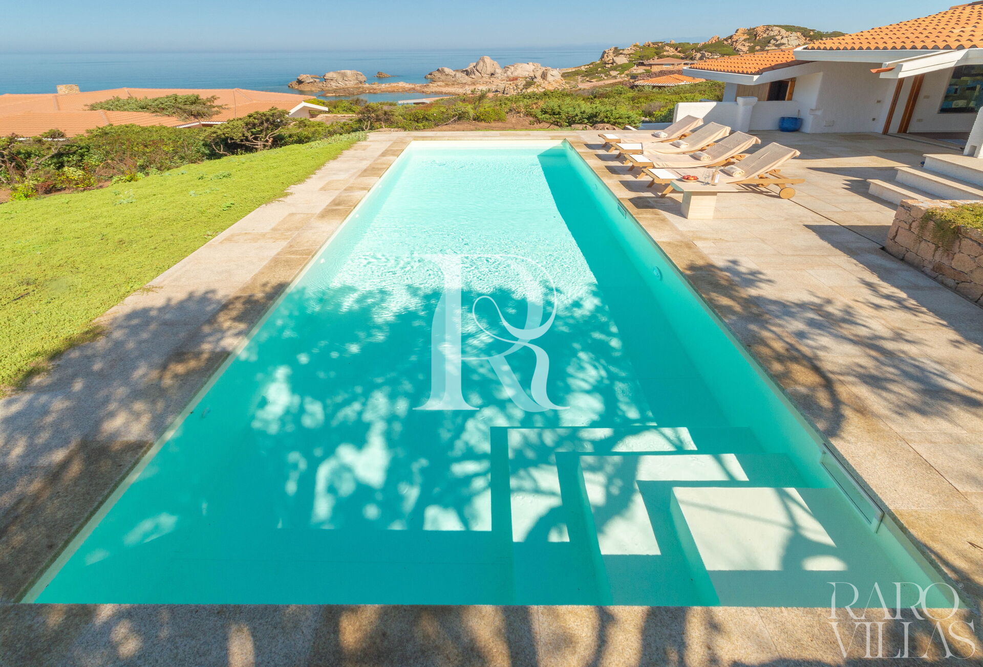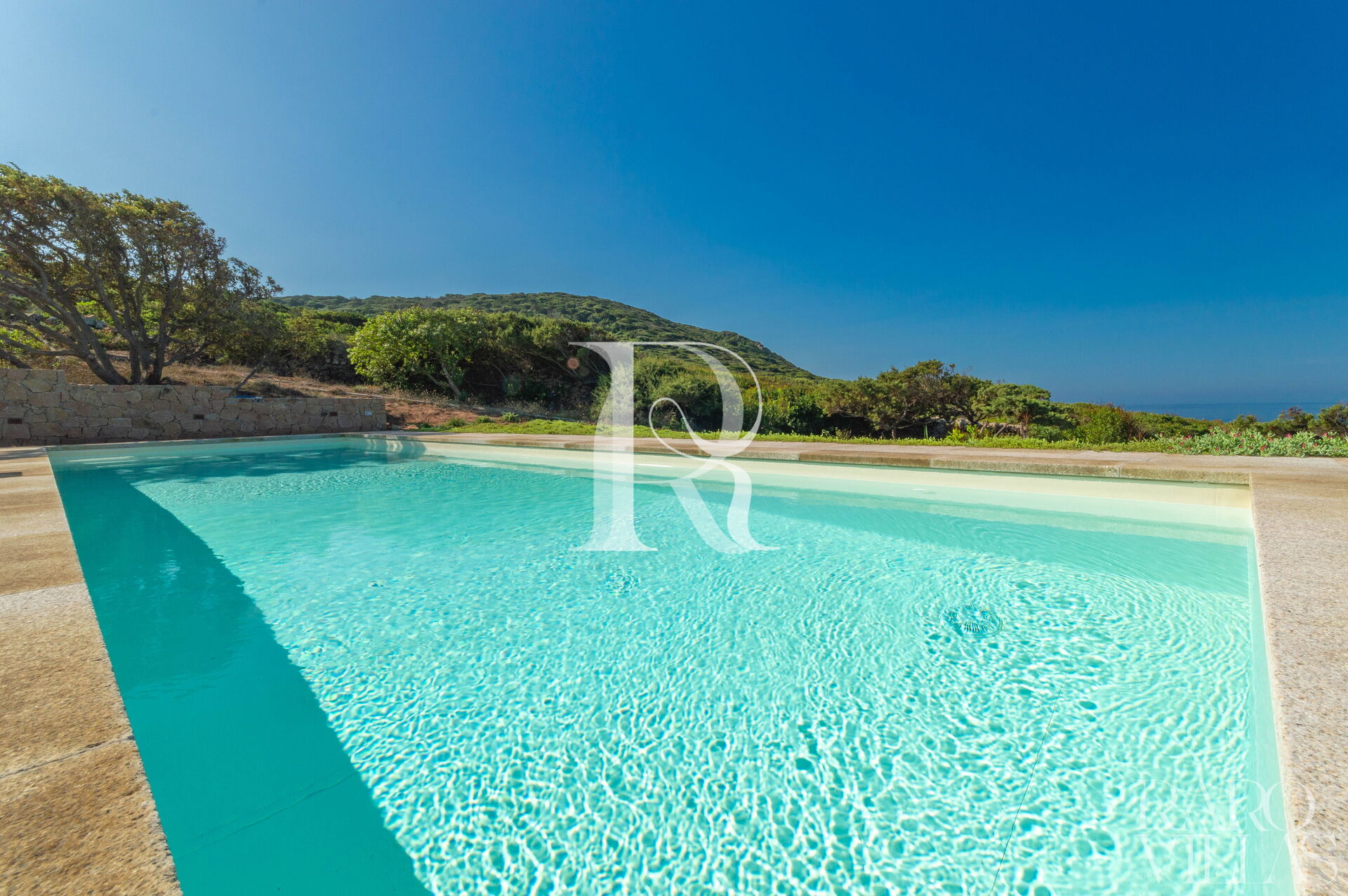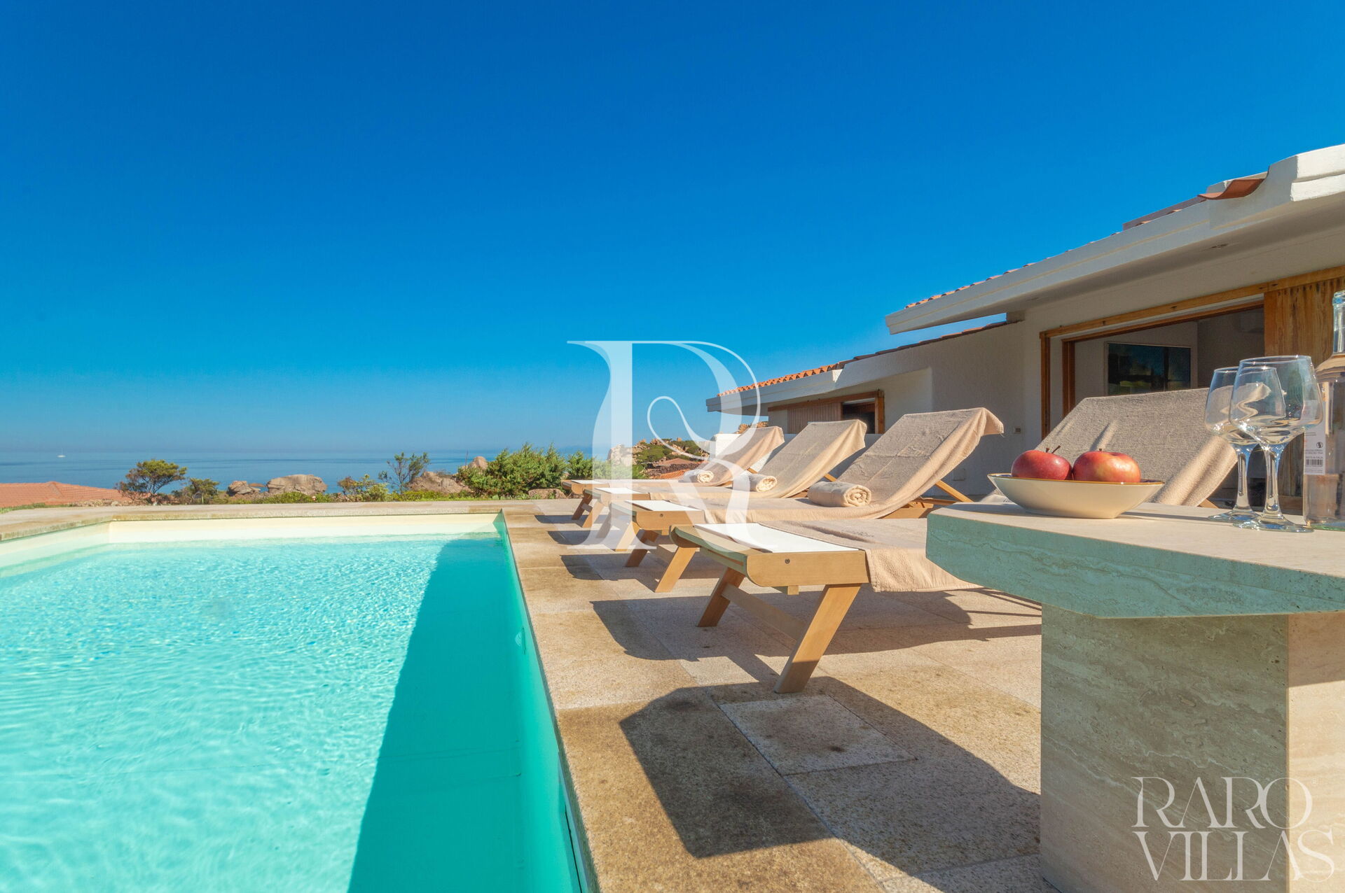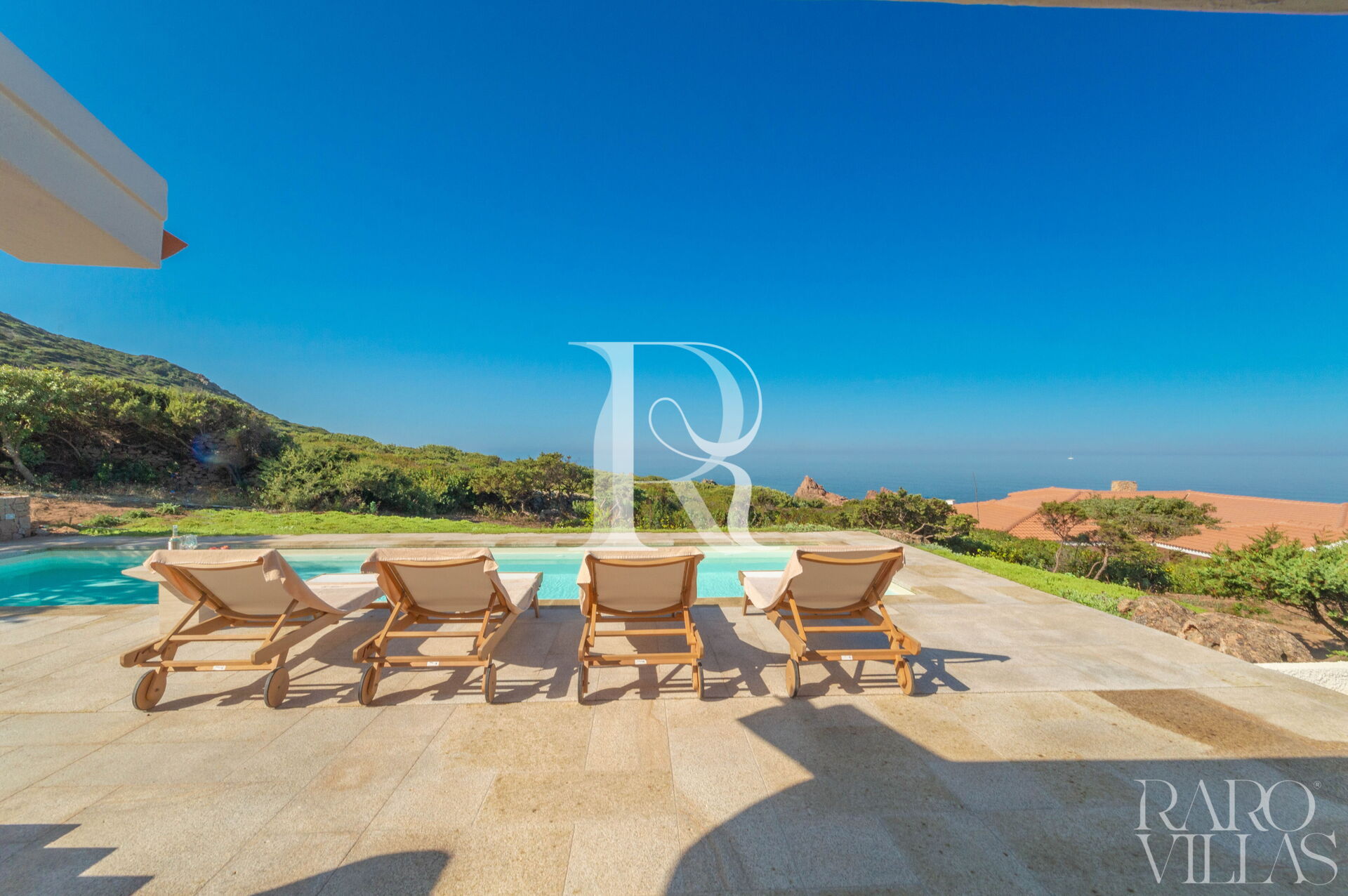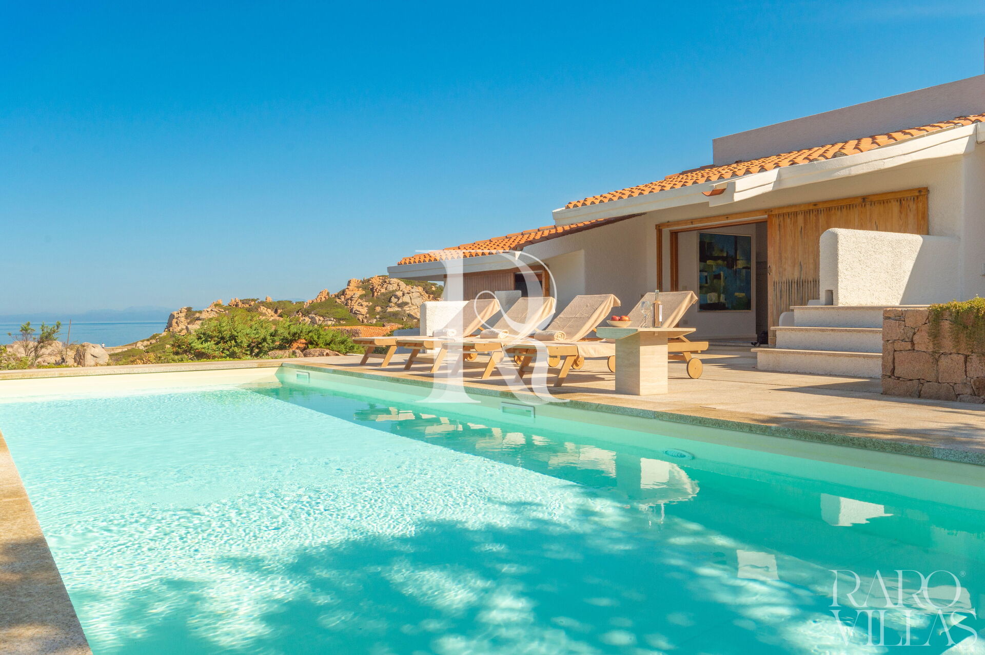 From the patio, guests can either ascend to the rooftop sunbathing area—offering a spectacular panorama stretching from Corsica to Asinara—or step into the spacious double living room, which includes a secondary dining area, a fireplace, and a flat-screen TV. The sea view extends from the living room to the front terrace with an infinity pool, seamlessly blending into the garden.