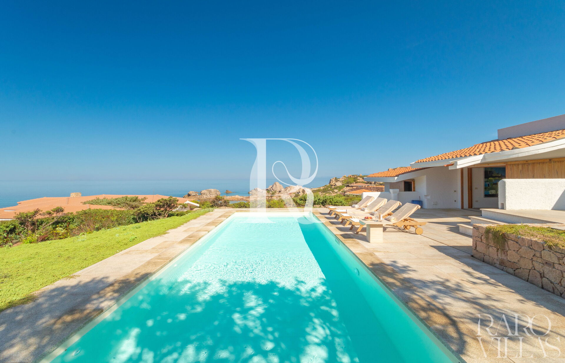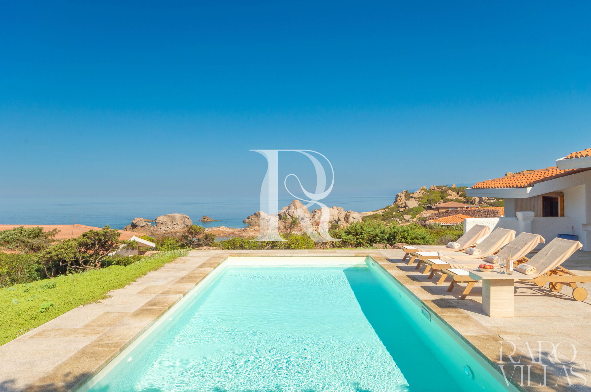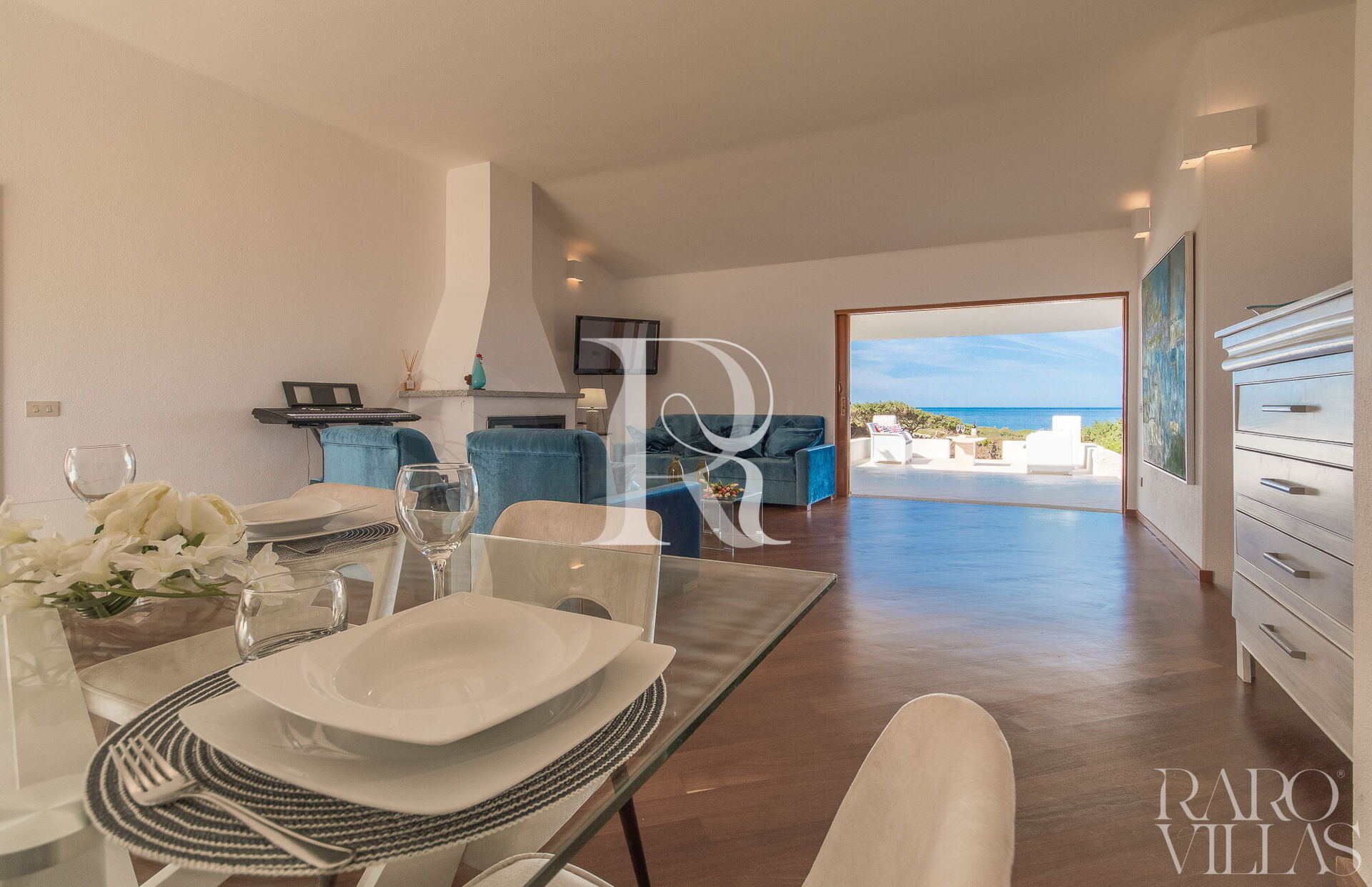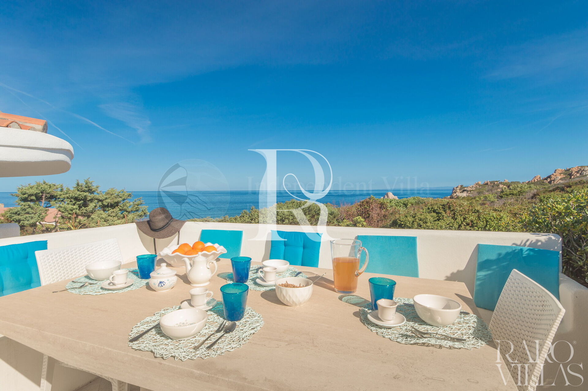 From the patio, guests can either ascend to the rooftop sunbathing area—offering a spectacular panorama stretching from Corsica to Asinara—or step into the spacious double living room, which includes a secondary dining area, a fireplace, and a flat-screen TV. The sea view extends from the living room to the front terrace with an infinity pool, seamlessly blending into the garden.