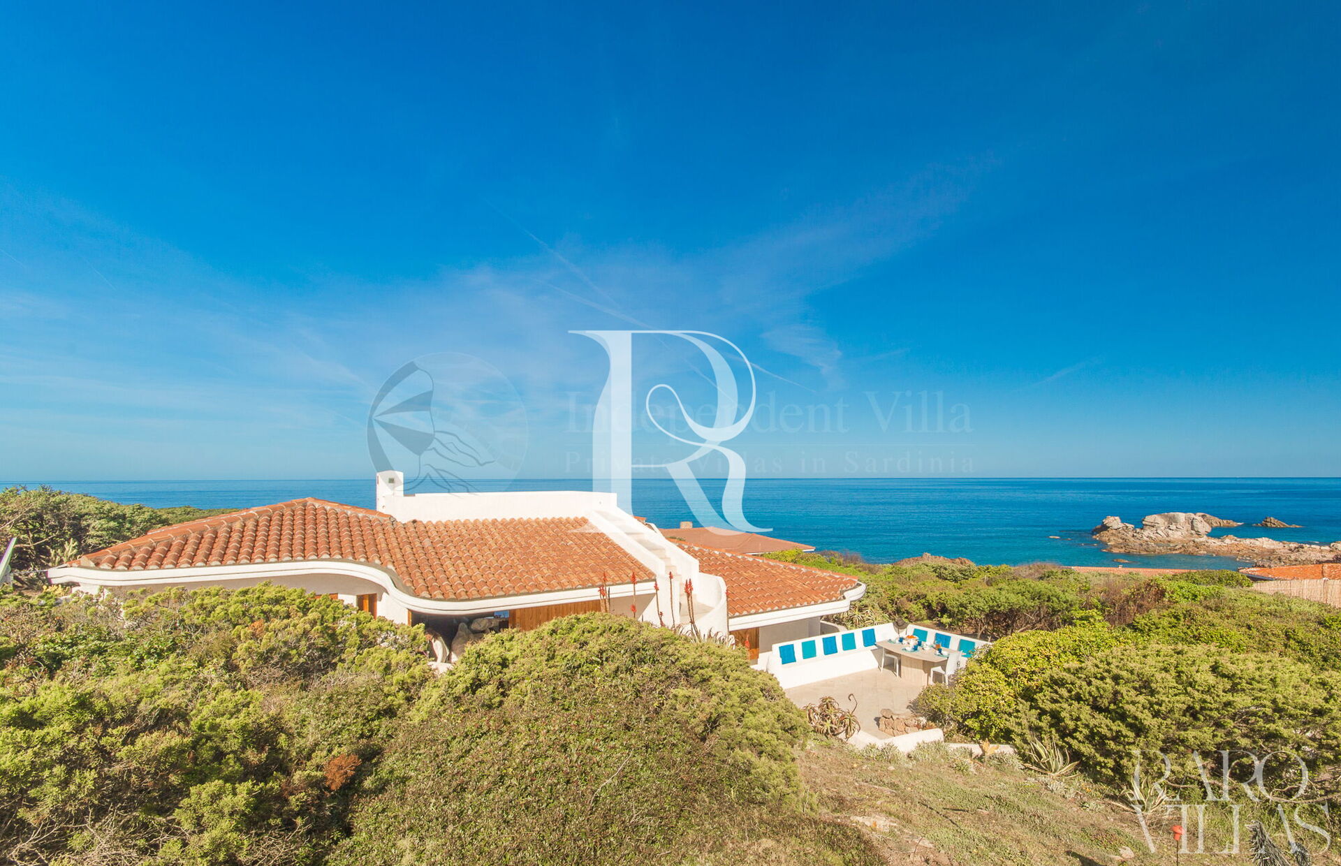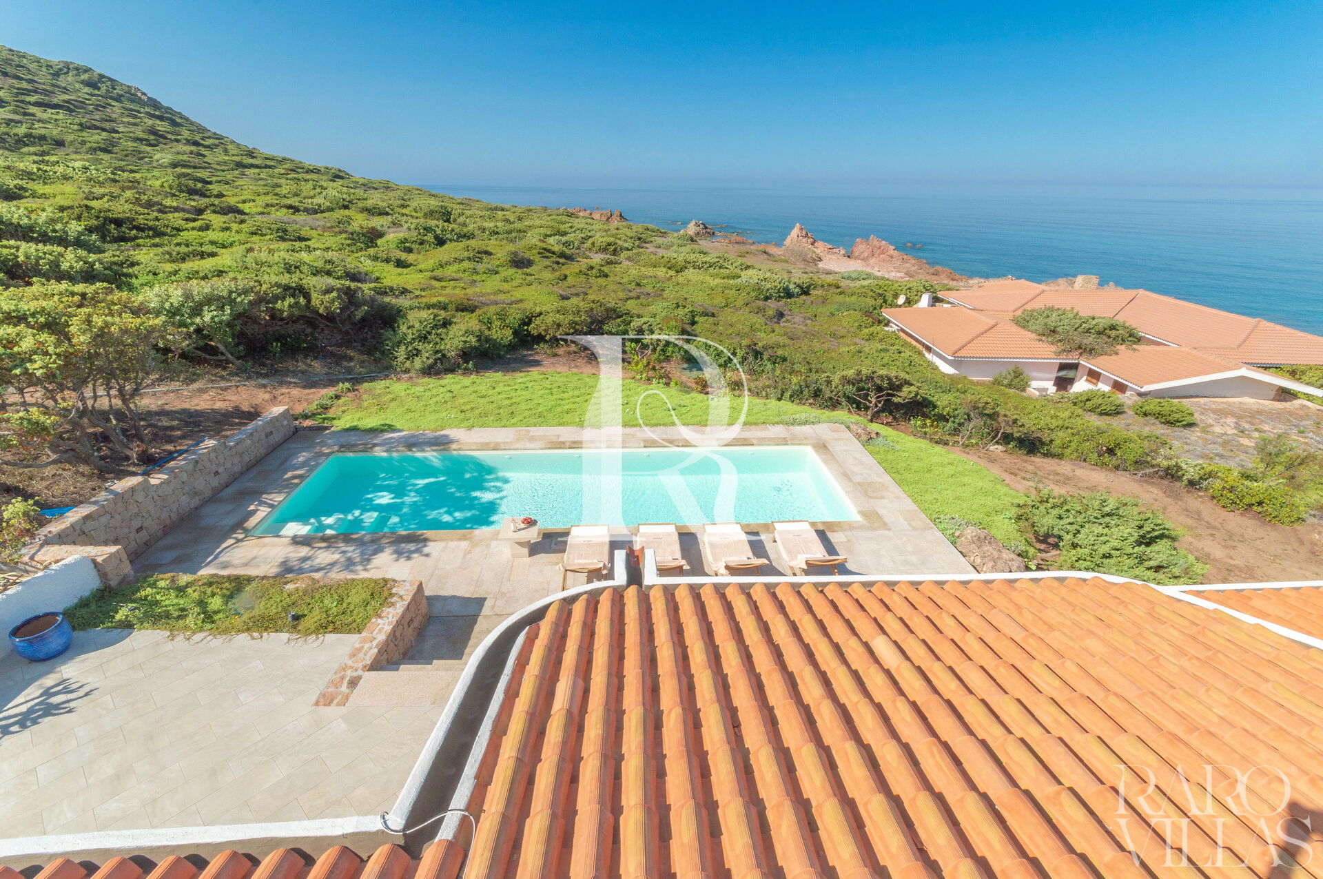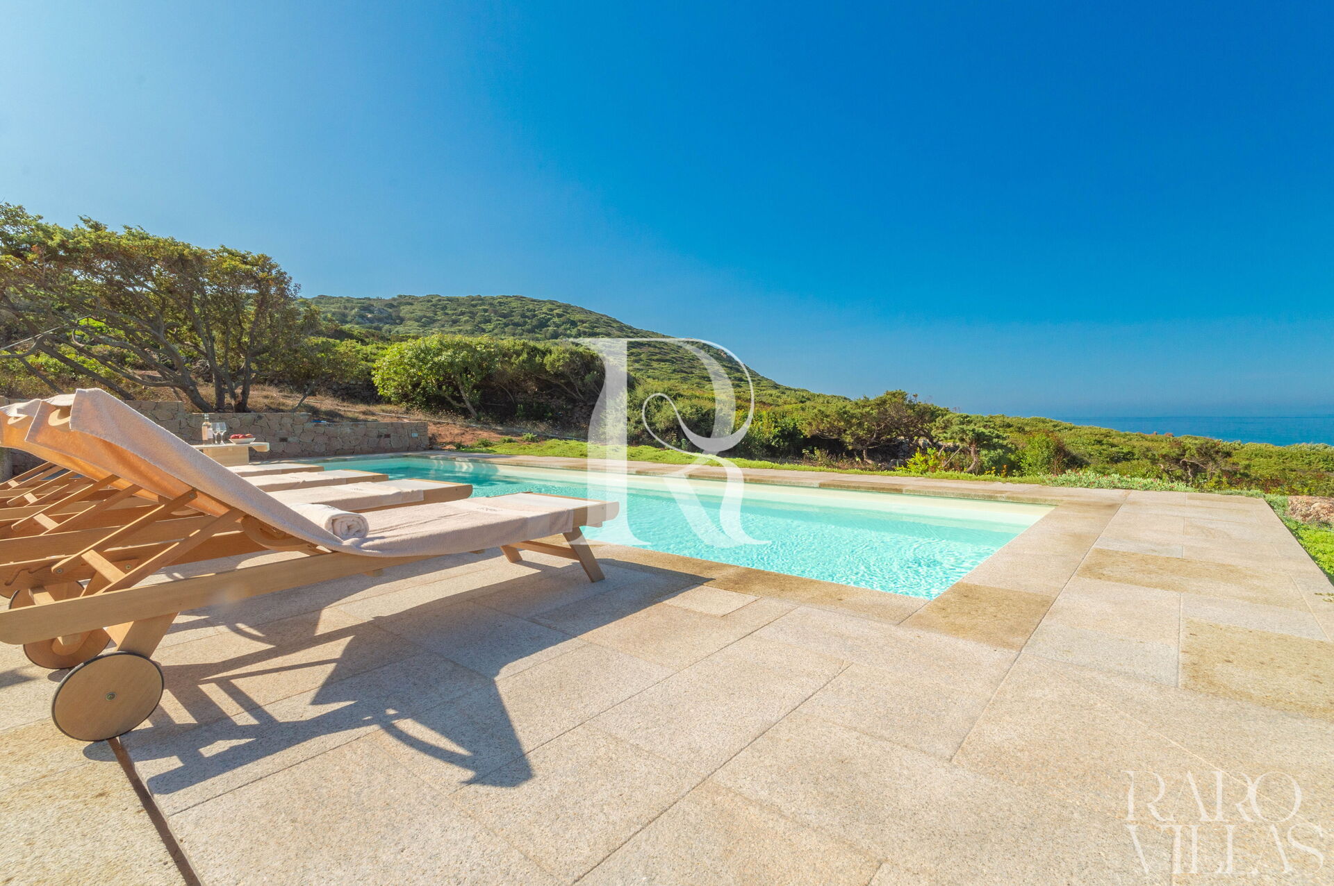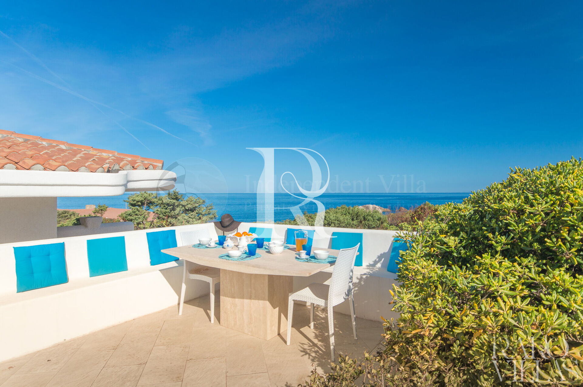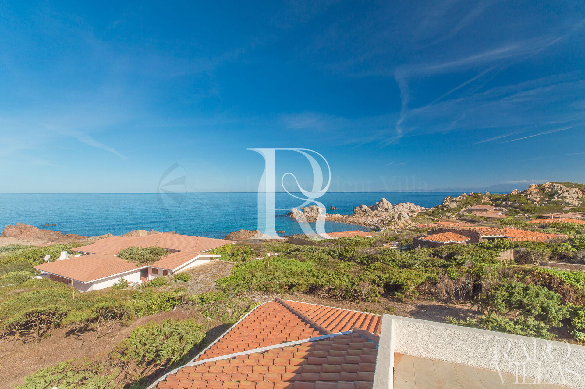 From the patio, guests can either ascend to the rooftop sunbathing area—offering a spectacular panorama stretching from Corsica to Asinara—or step into the spacious double living room, which includes a secondary dining area, a fireplace, and a flat-screen TV. The sea view extends from the living room to the front terrace with an infinity pool, seamlessly blending into the garden.