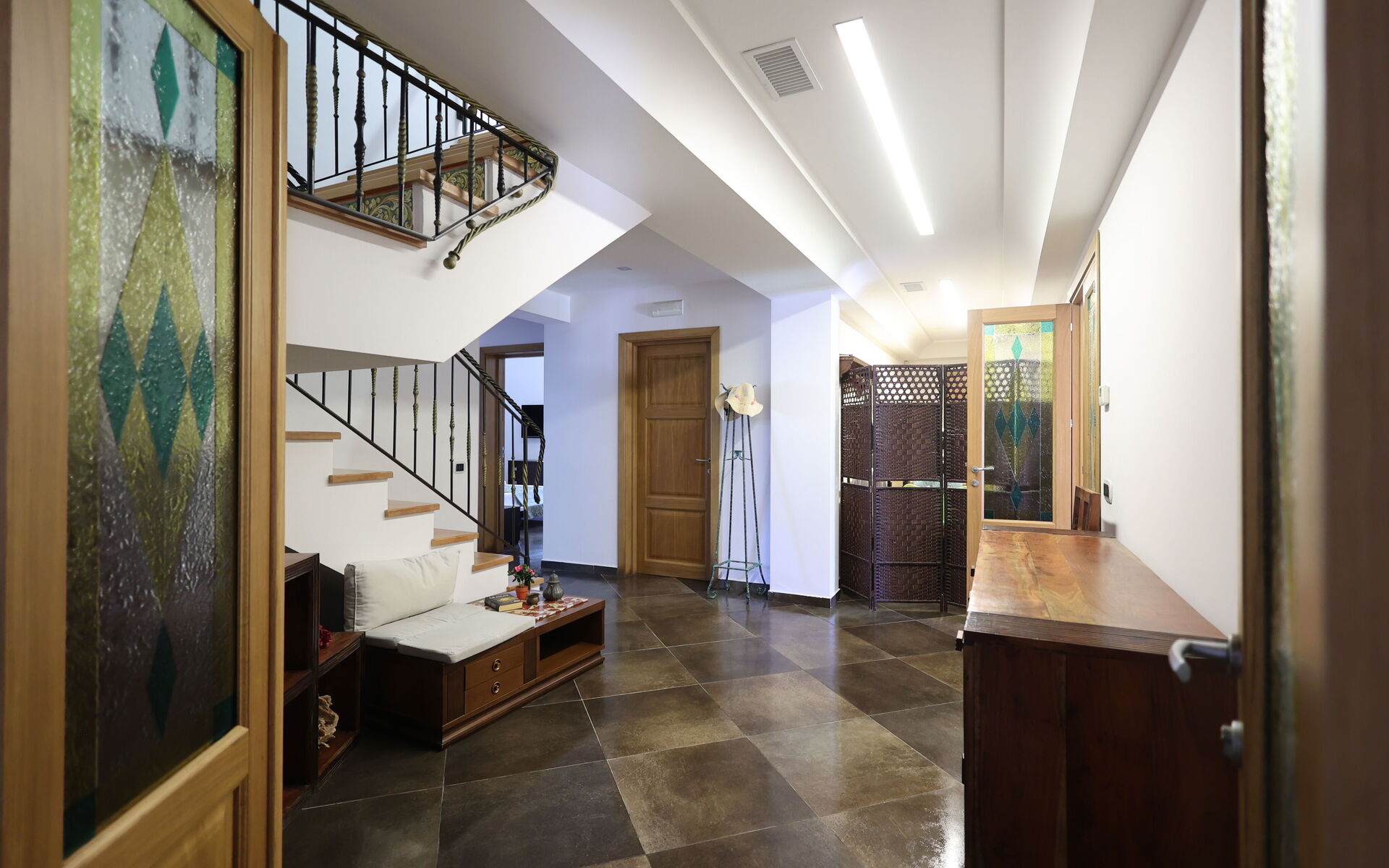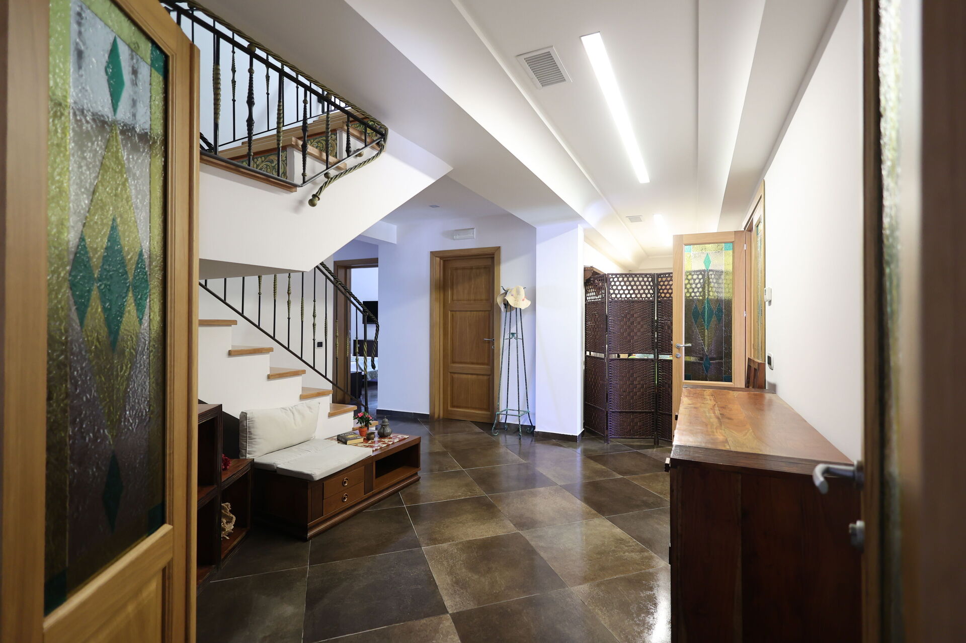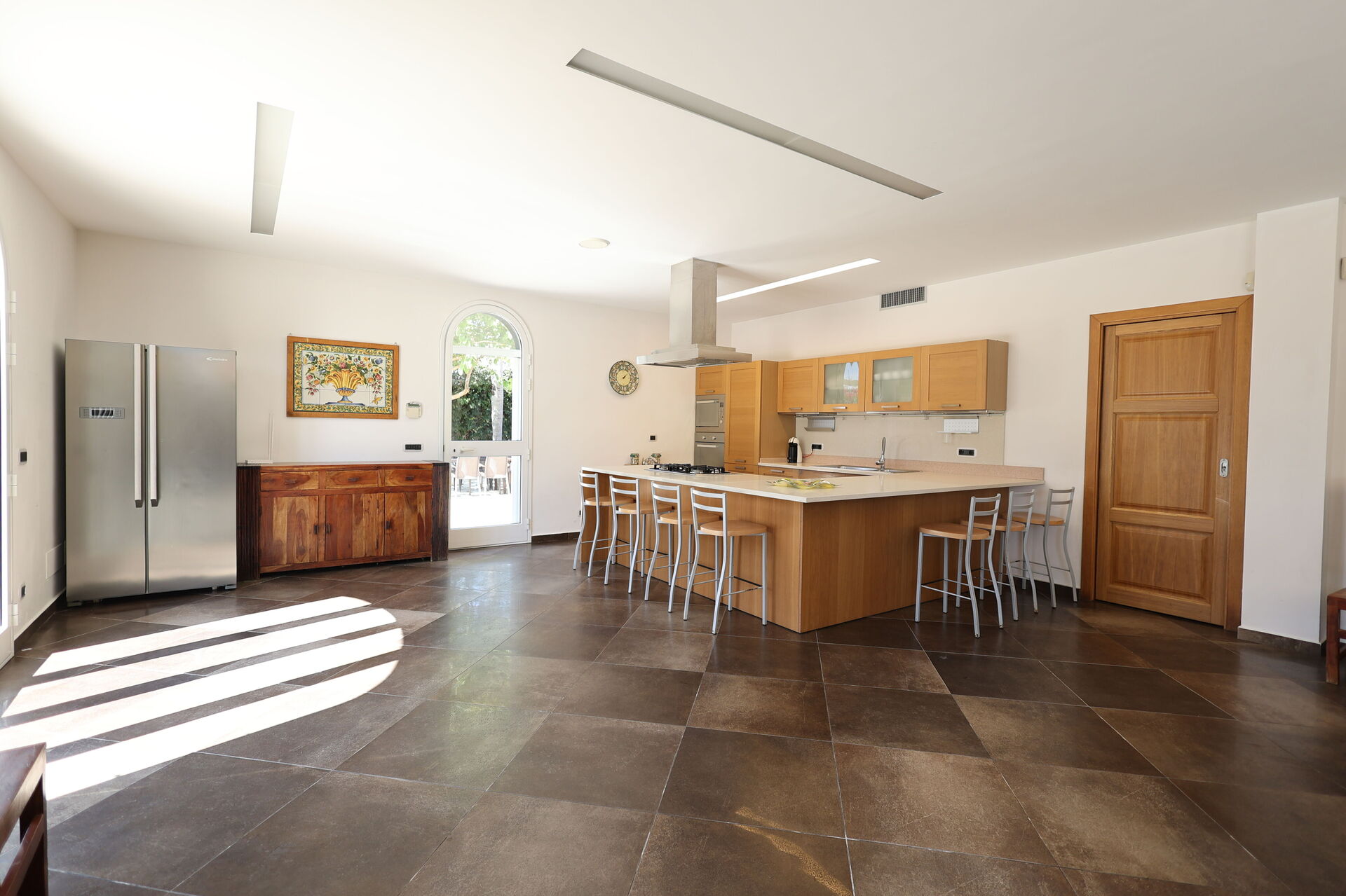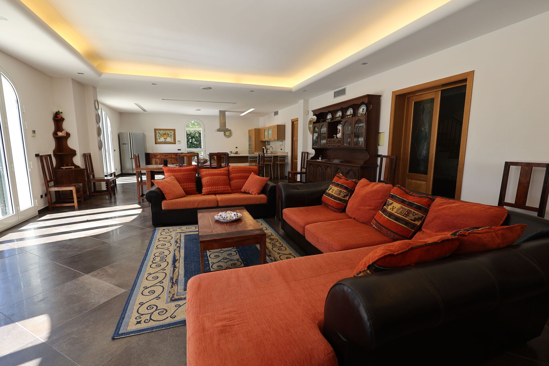 Cuisine – salle de séjour (150 m2): cuisine bien équipée, table à manger, lave-vaisselle, réfrigérateur, congélateur, four micro-onde, cuisinière, four, grille-pain, machine à café italienne, canapé, fauteuil, bureau, internet WIFI, climatisation, télévision, sortie sur le jardin.
