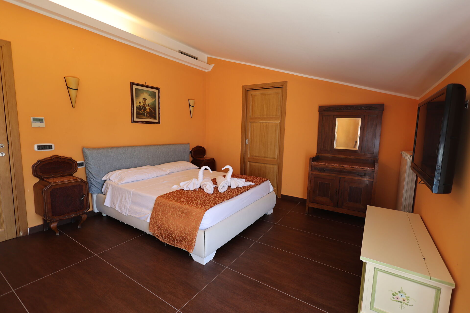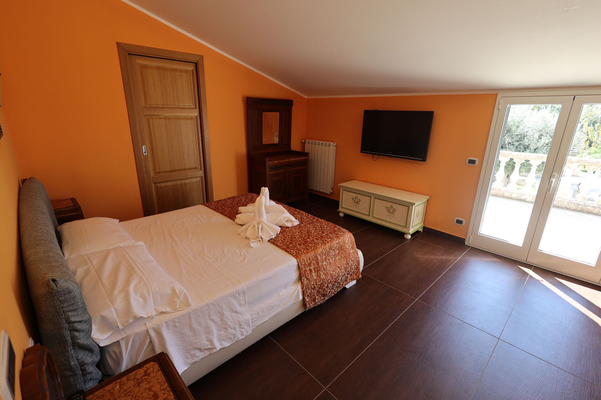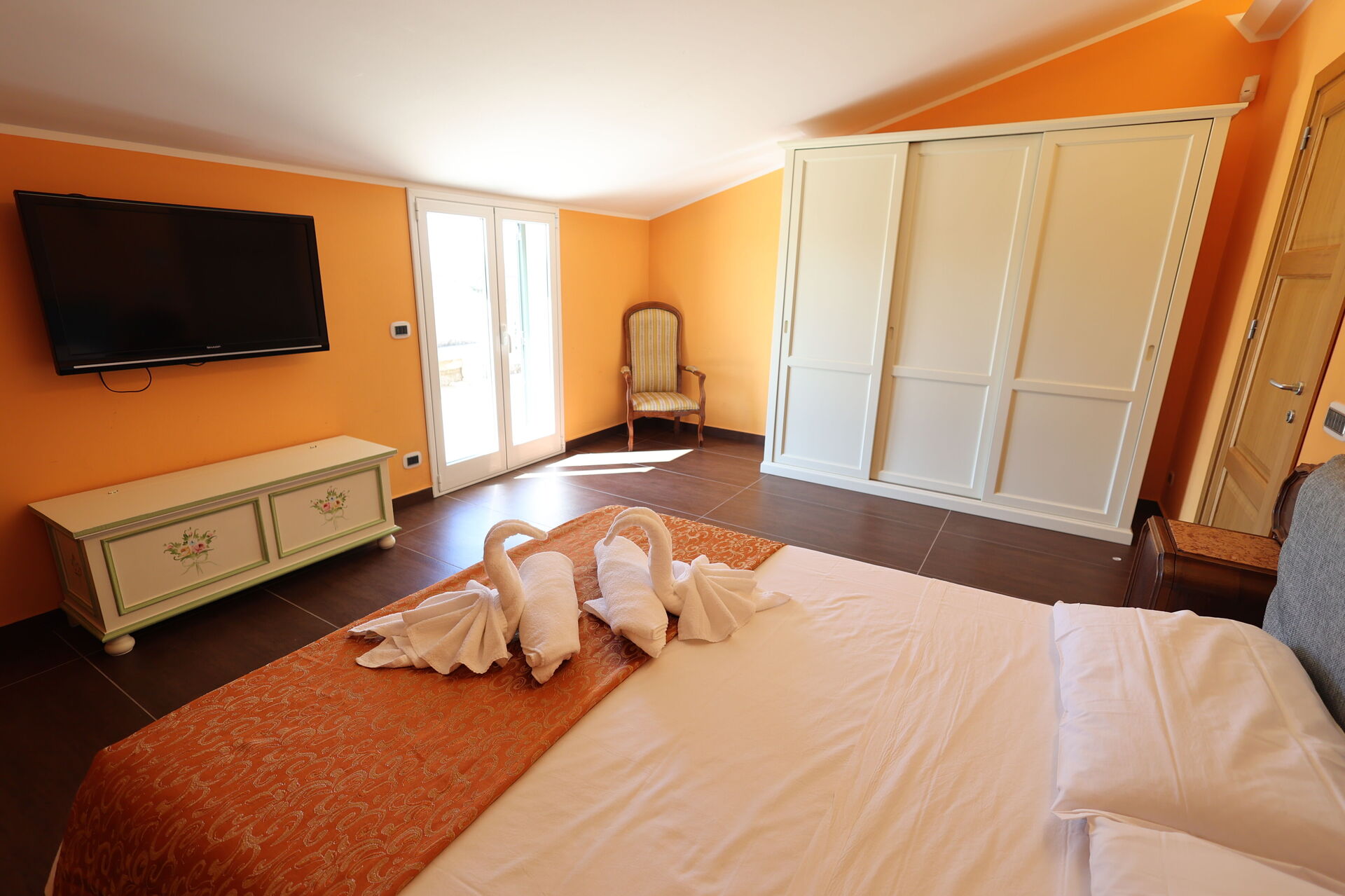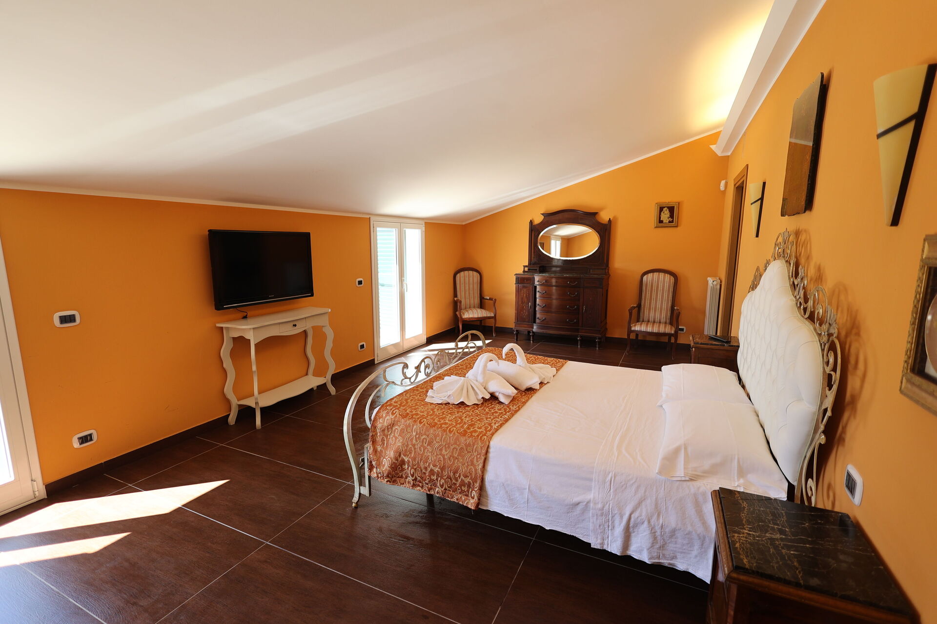 chambre avec salle de bain 2 (40 m2): lit double (largeur: 1.6m, longueur: 1.9m), lit de bébé, internet WIFI, climatisation, tv satellitaire, télévision, coffre-fort, bassin, wc, bidet, douche, sèche-cheveux, détecteur de fumée, sortie sur la terrasse.