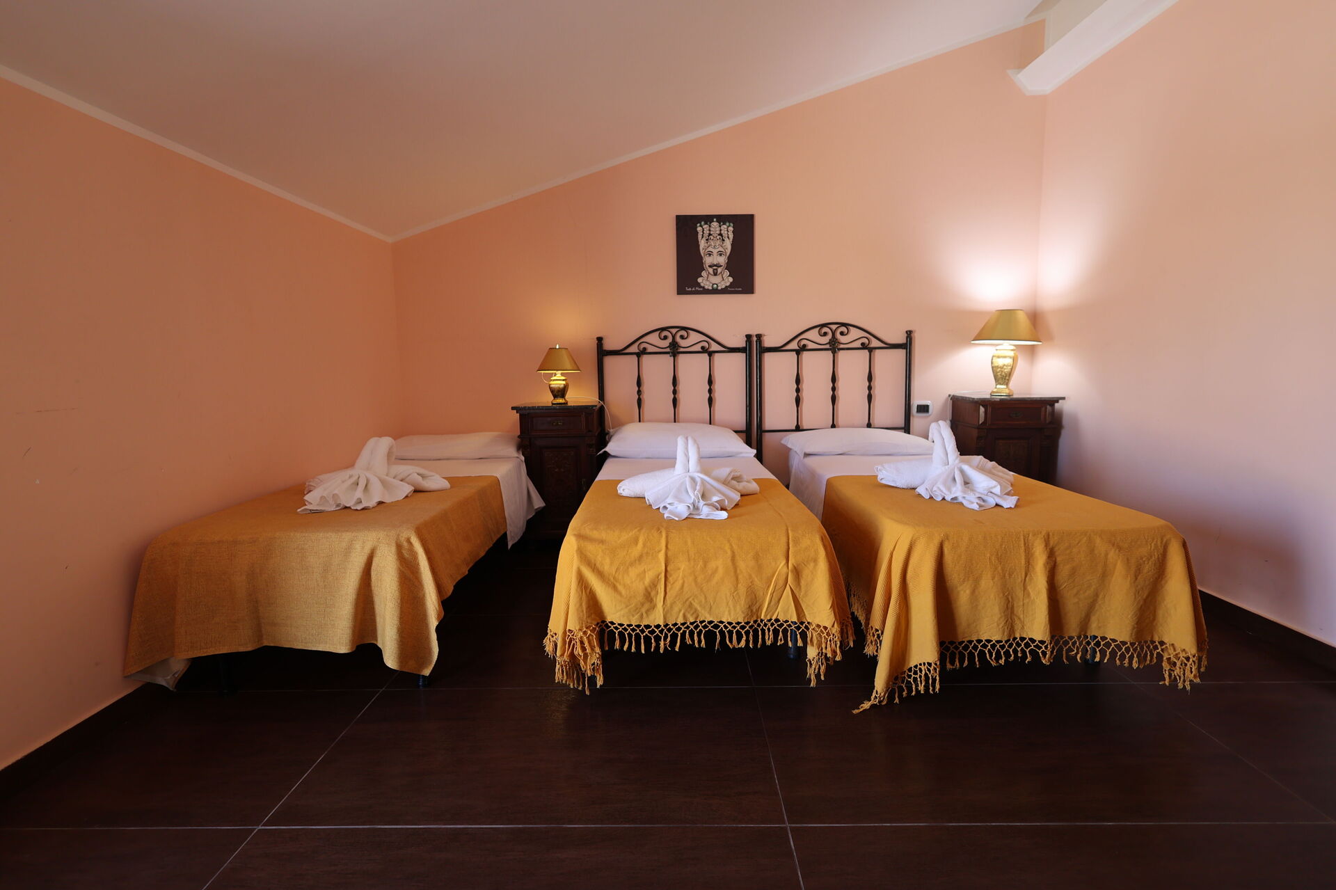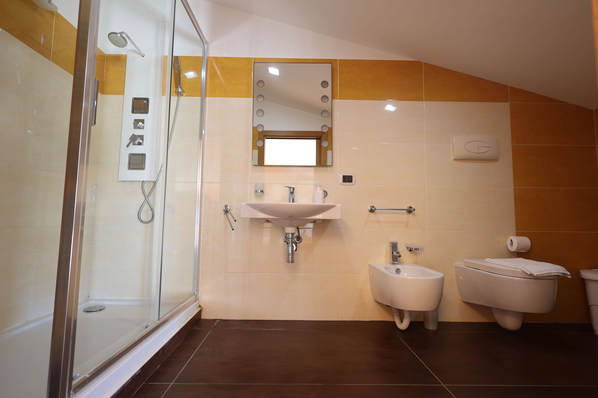chambre avec salle de bain 1 (40 m2): trois lits à une place (largeur: 0.8m, longueur: 1.9m), internet WIFI, climatisation, télévision, coffre-fort, bassin, wc, bidet, douche, sèche-cheveux, détecteur de fumée, sortie sur la terrasse.