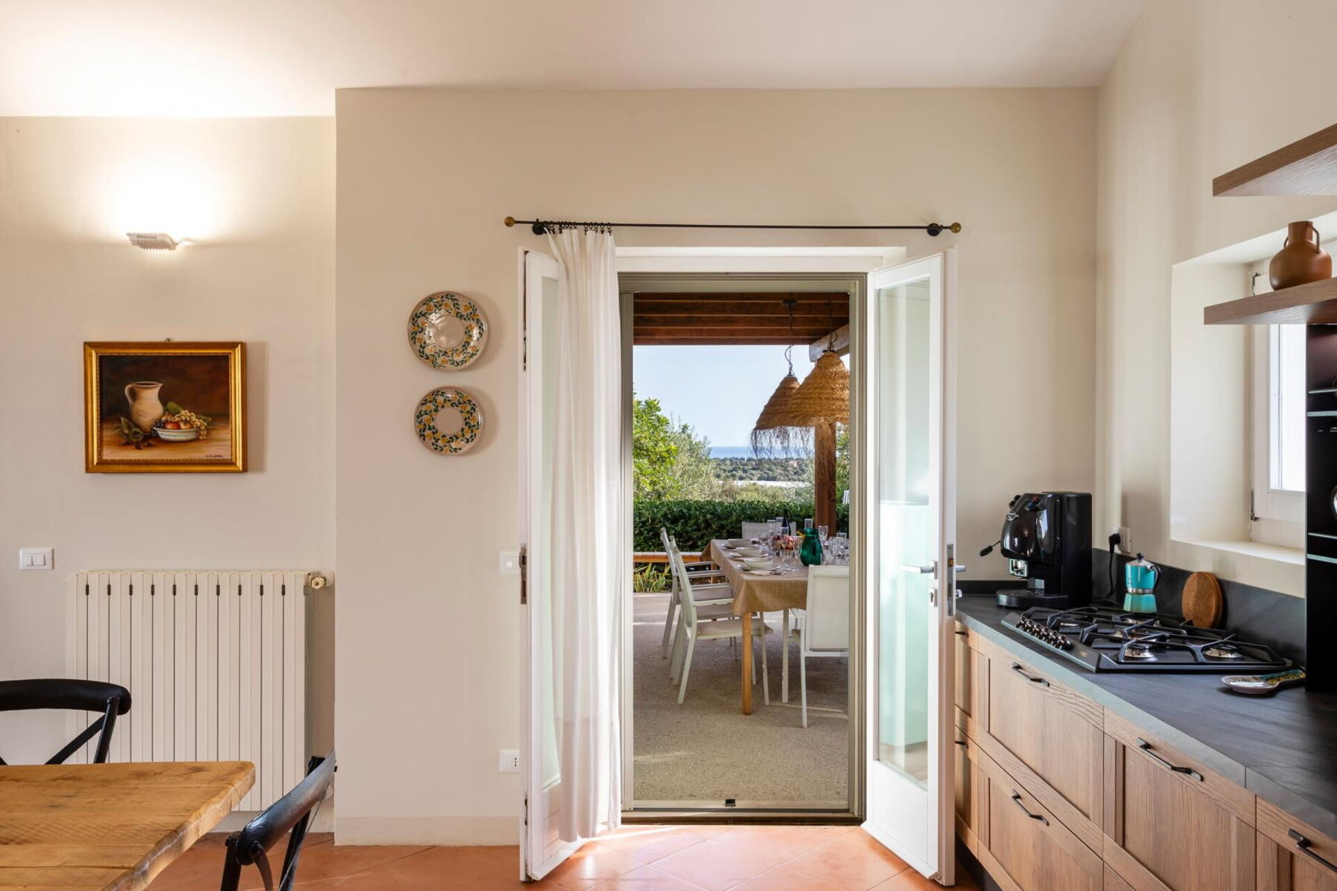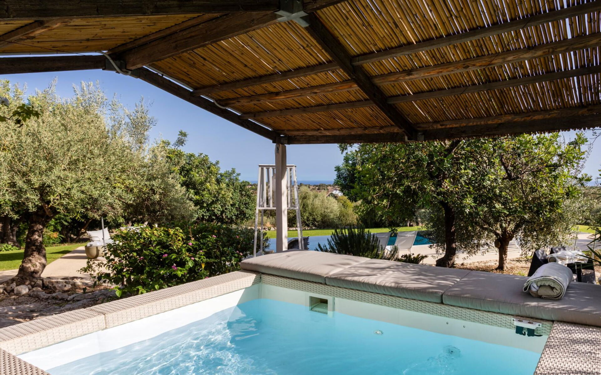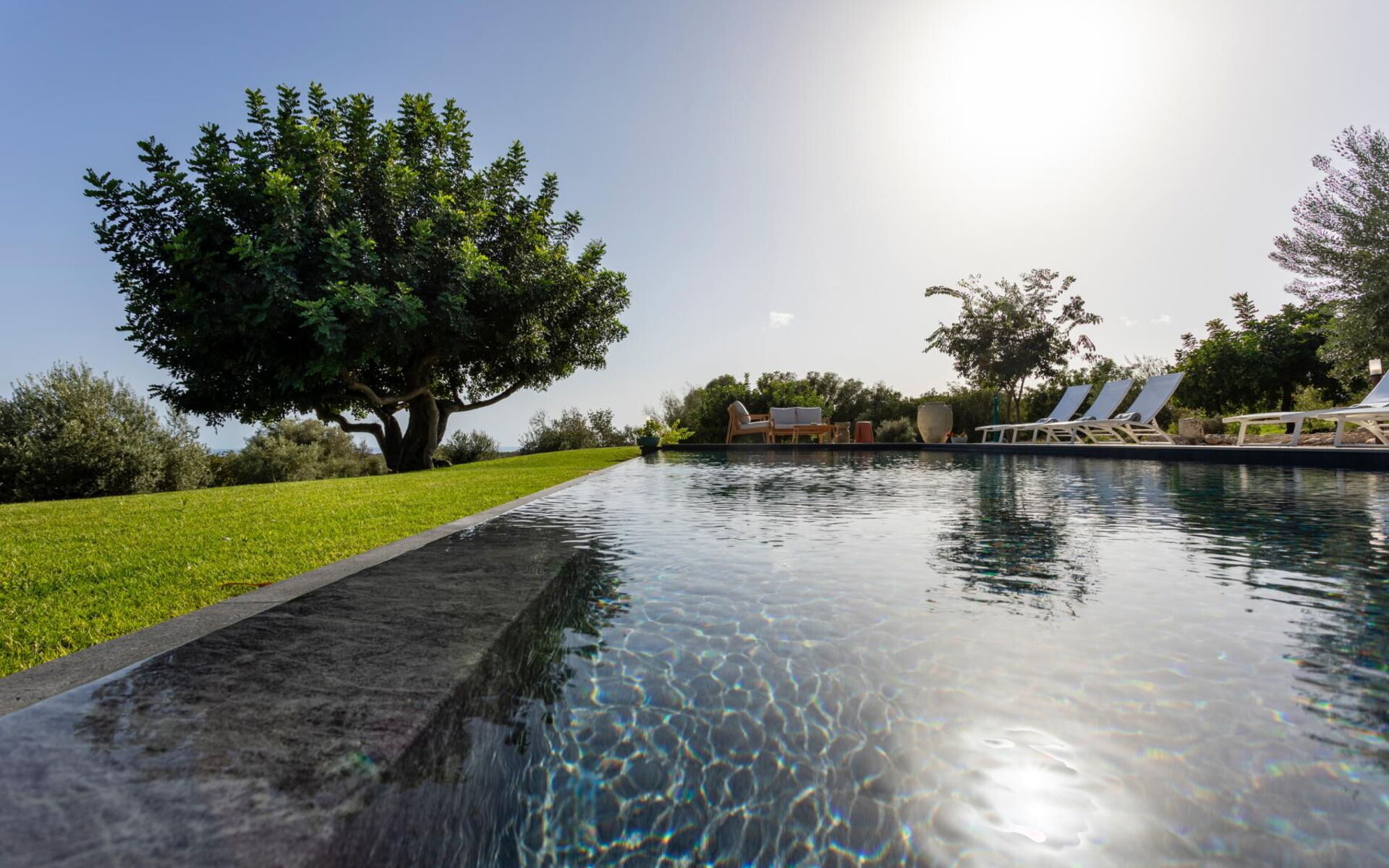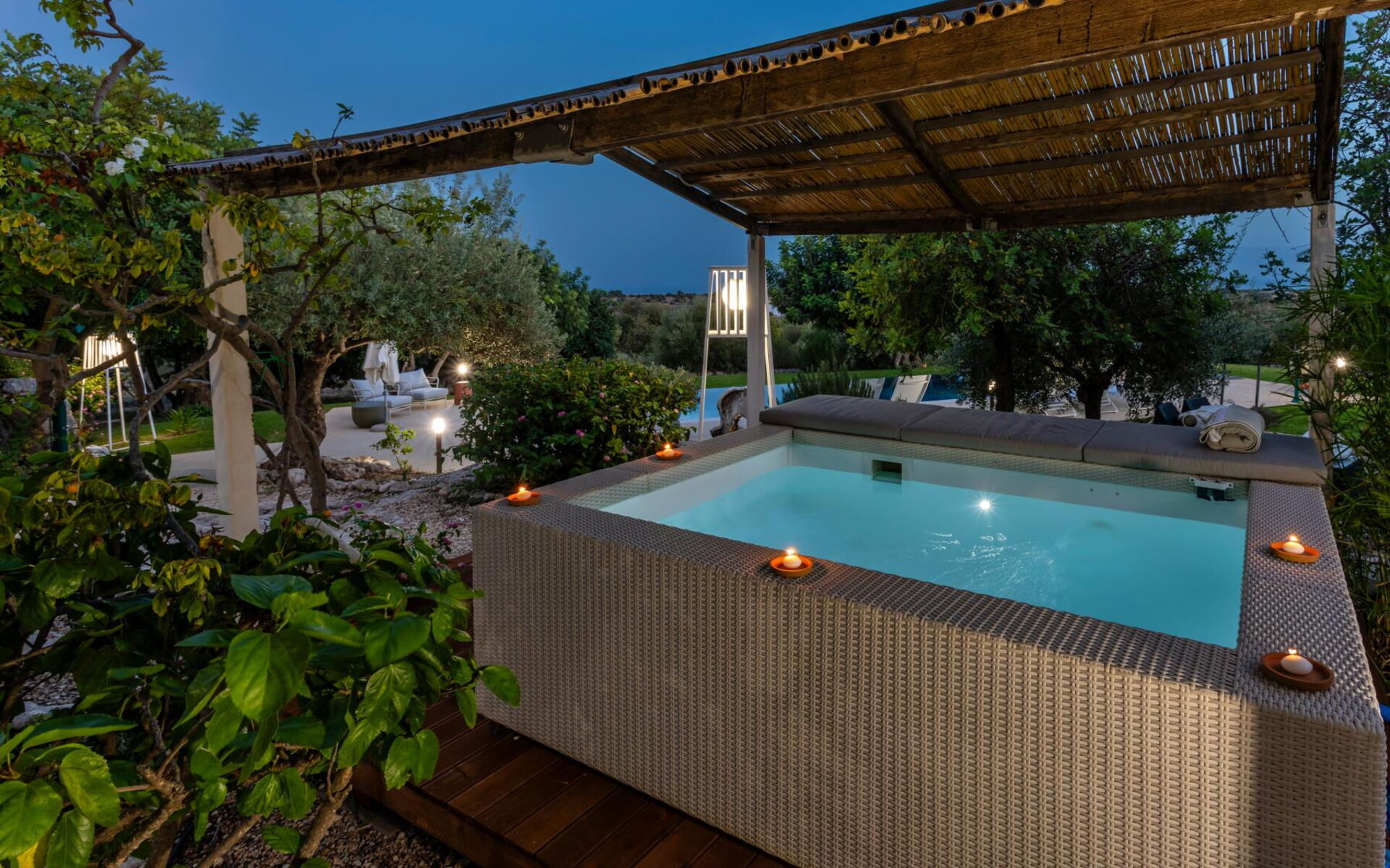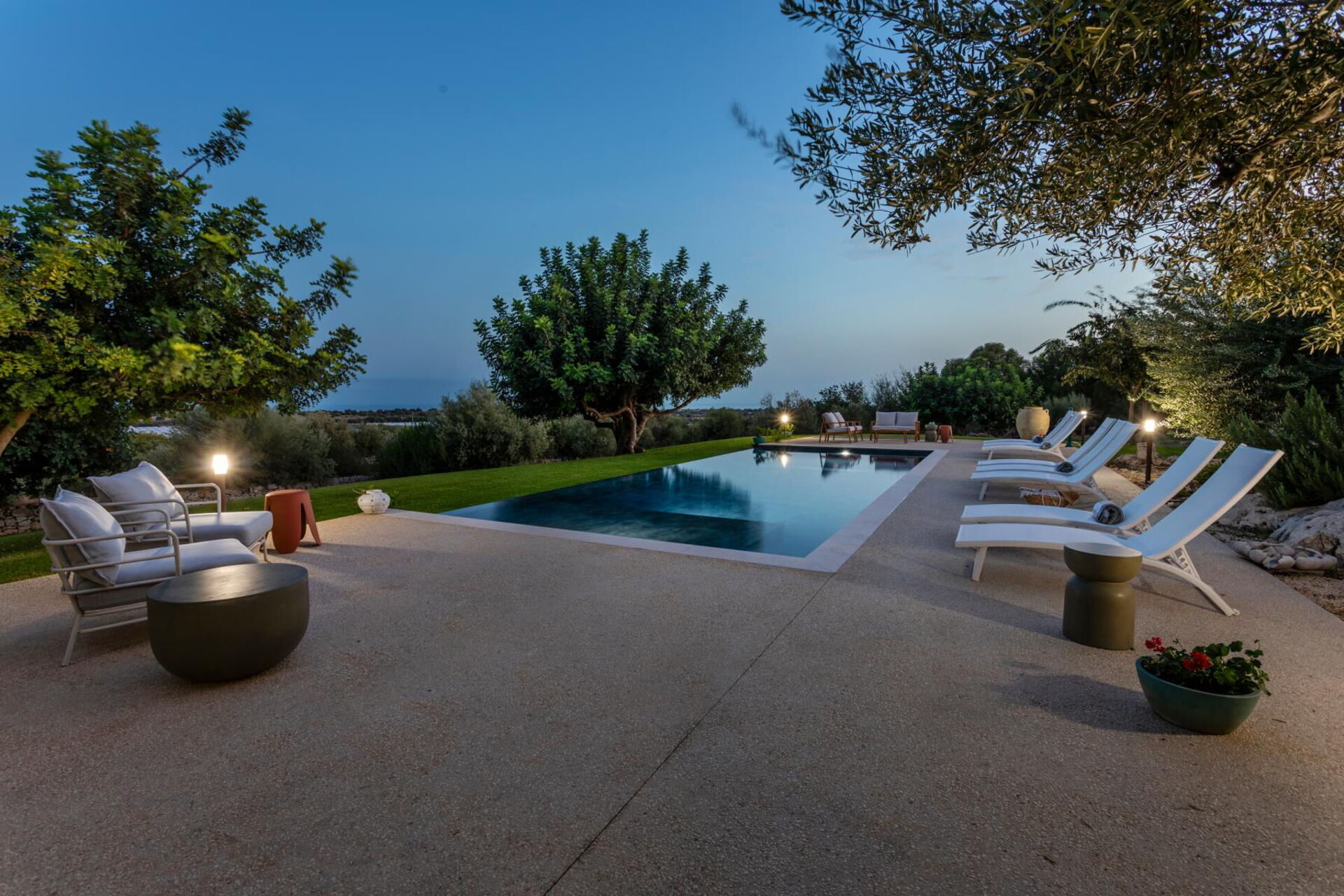 The villa overlooks an enchanting garden with a stunning private swimming pool (12x5m), a jacuzzi and olive and citrus trees. The exterior is furnished with sun loungers and umbrellas, while an outdoor dining area, directly connected to the kitchen, offers views of the garden, the pool and the sea in the distance.